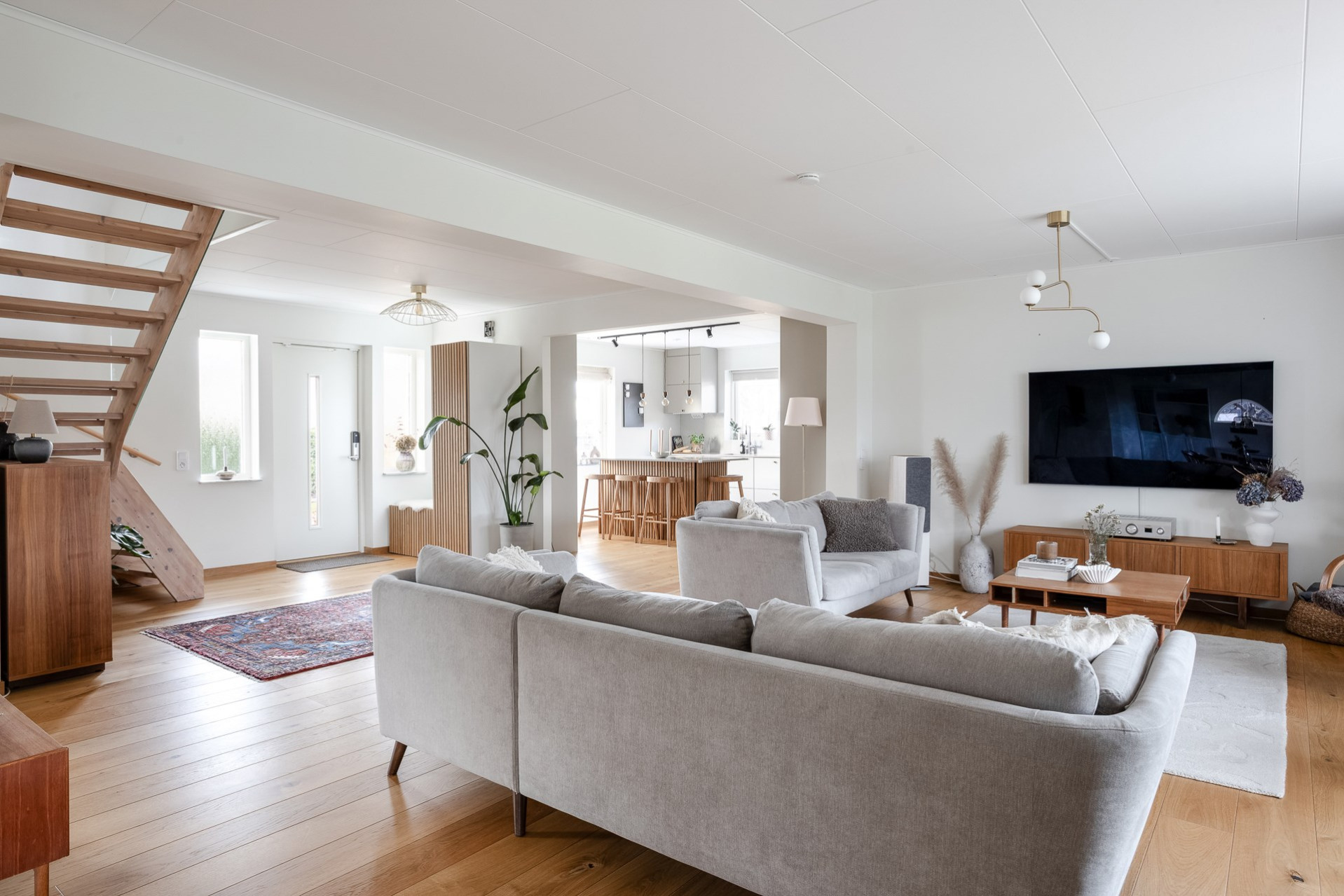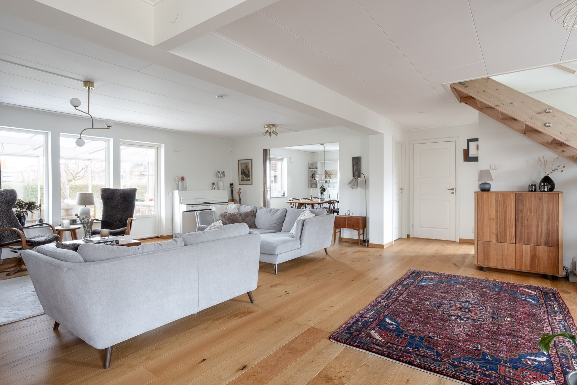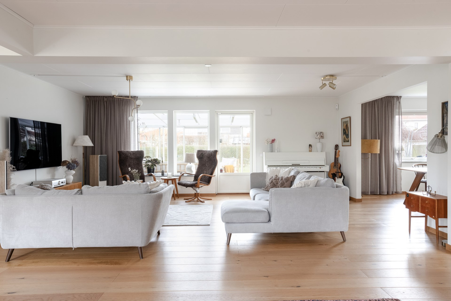 Vardagsrum - Generöst och luftigt vardagsrum med gott om utrymme för större soffmöblemang. Härifrån nås trädgårdssidan samt det stora inglasade uterummet. Släta målade väggar och trägolv Kährs Cornwall Mattlackad Borstad Ek 1-stav 2021.