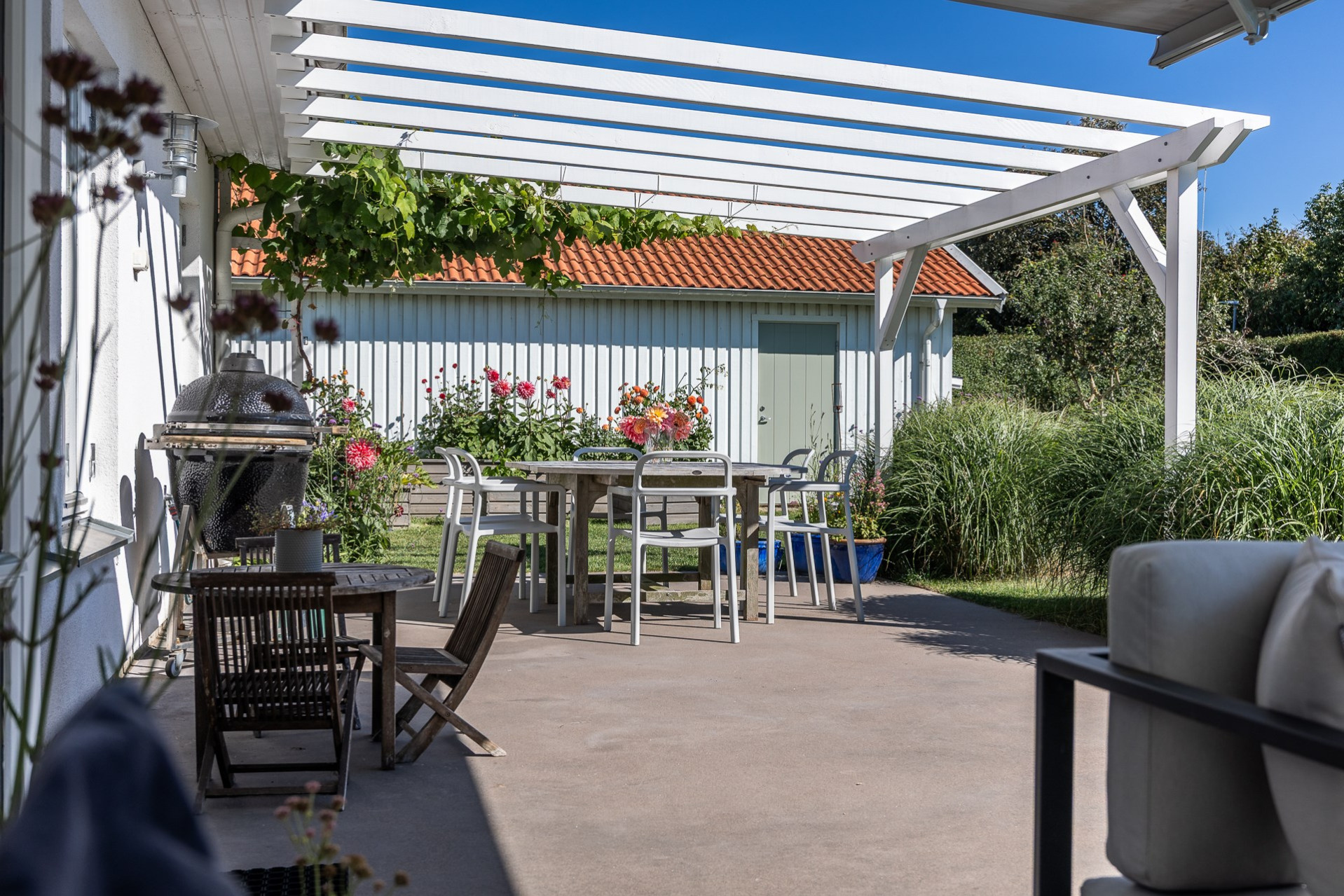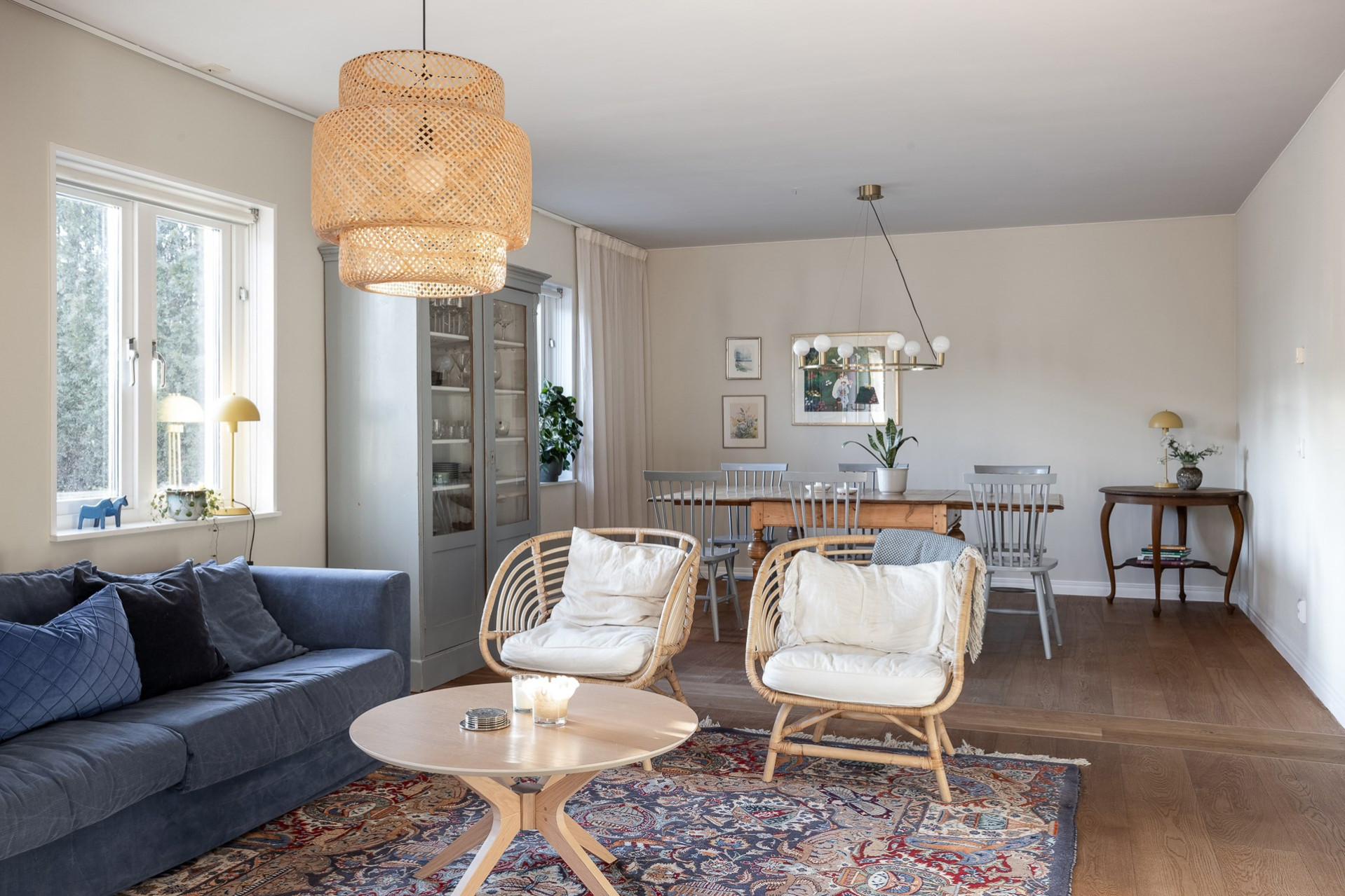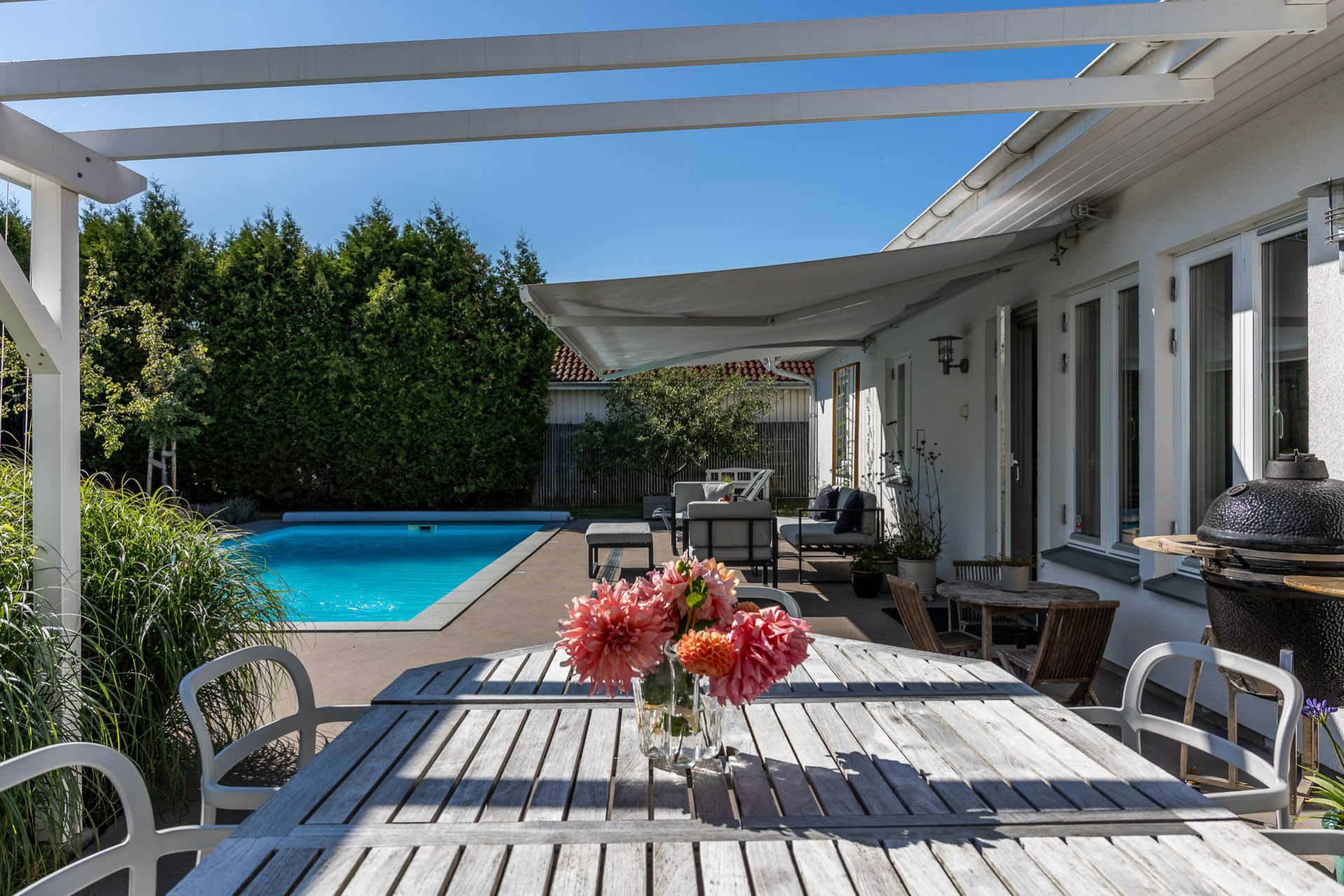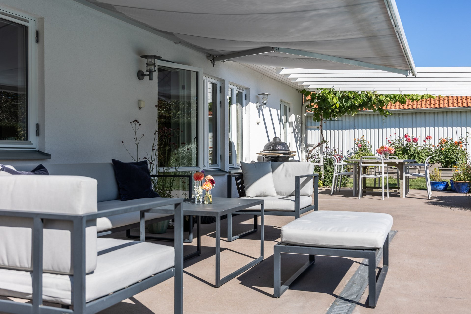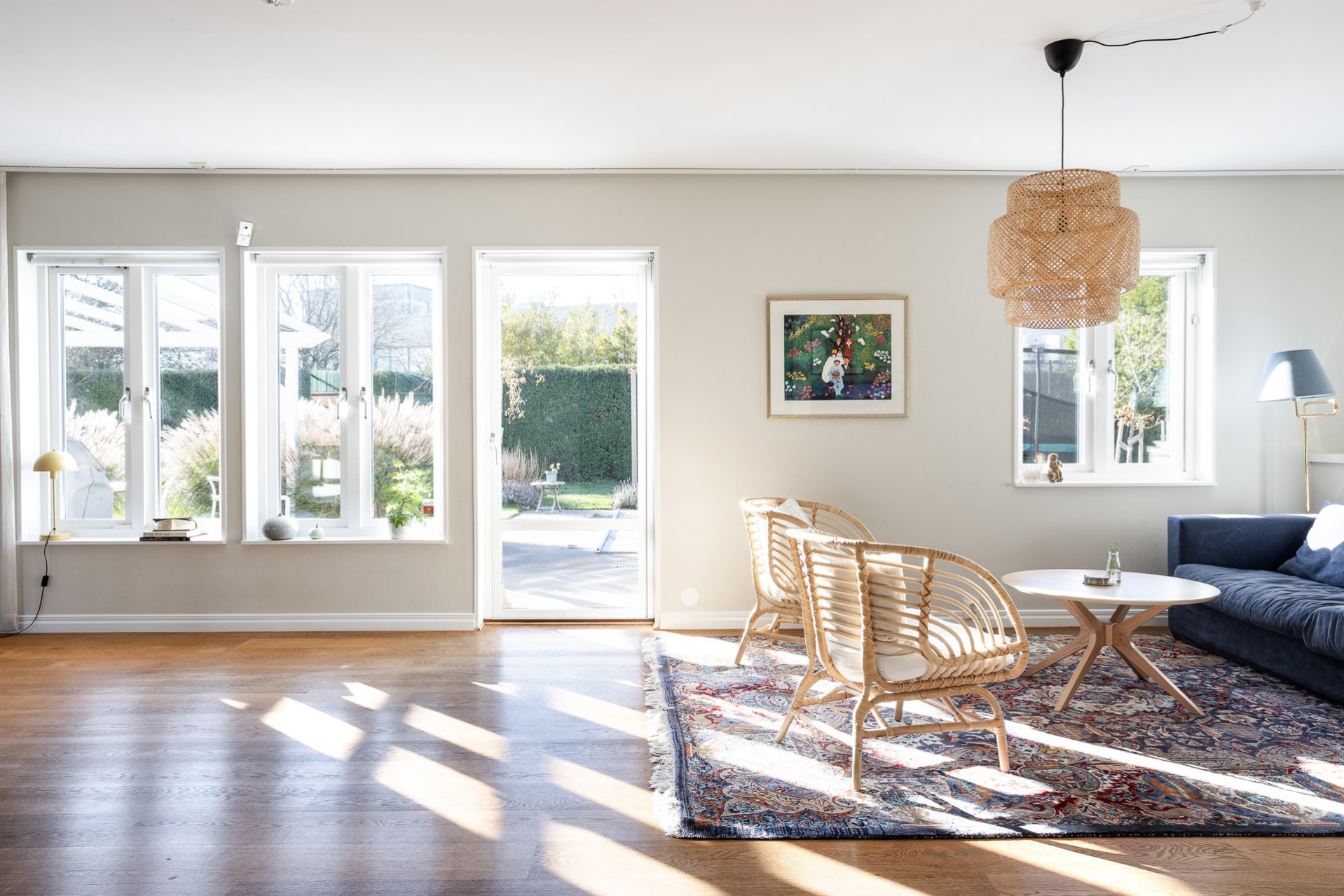 Rakt fram, sett från hallen, möts vi av husets fantastiska vardagsrum. Detta rum badar i ljus och erbjuder generösa ytor för både vardag och sociala sammanhang. Den delvis öppna planlösningen mot köket skapar en härlig rymd och här finns gott om plats för såväl ett stort matsalsbord som ett rymligt sällskapsmöblemang med utrymme kvar för ytterligare möblering om man önskar. Rummet har en fantastisk kontakt med trädgårdens baksida, en grönskande oas som förlänger hemmets sociala ytor under årets varmare dagar.