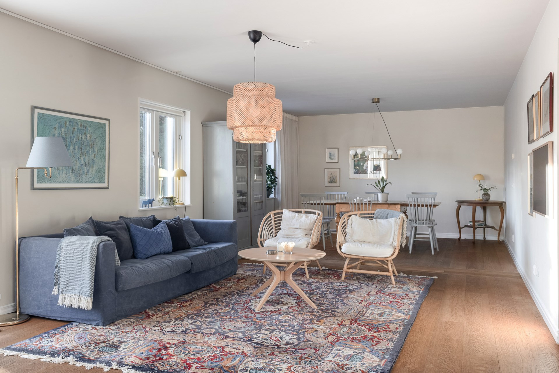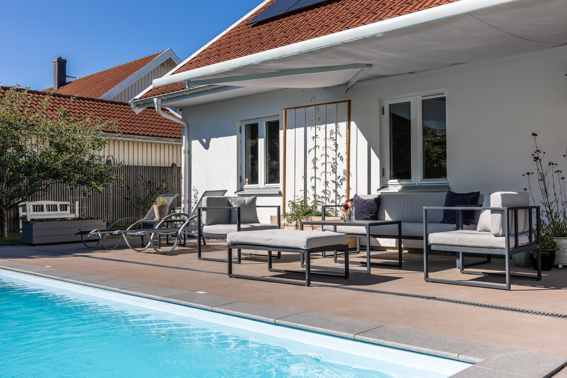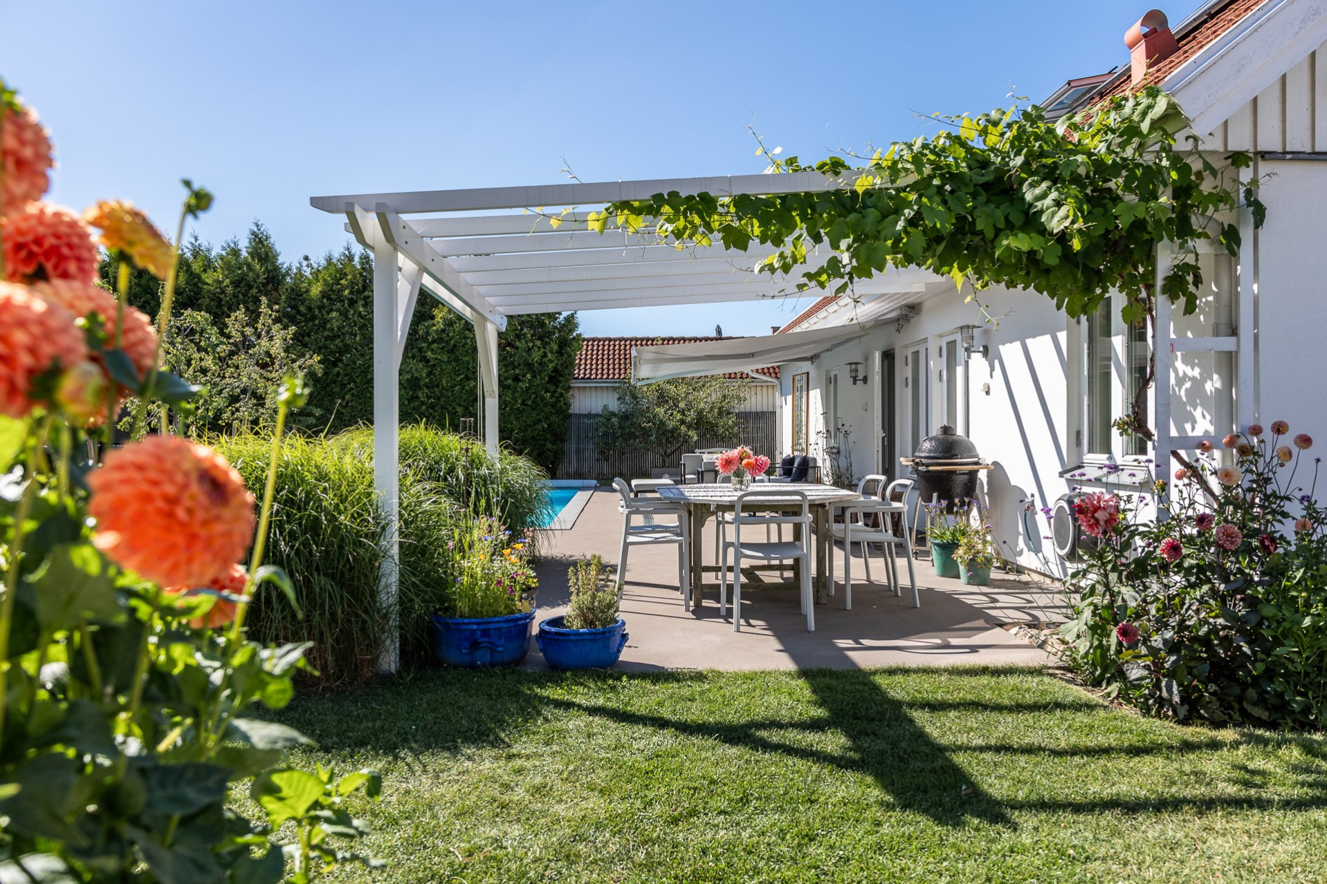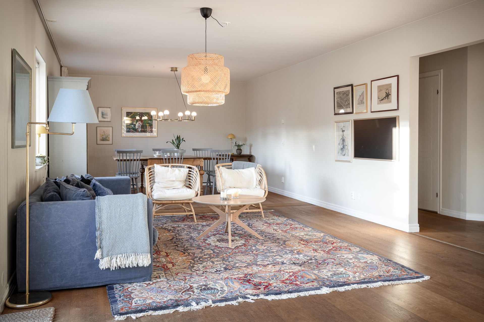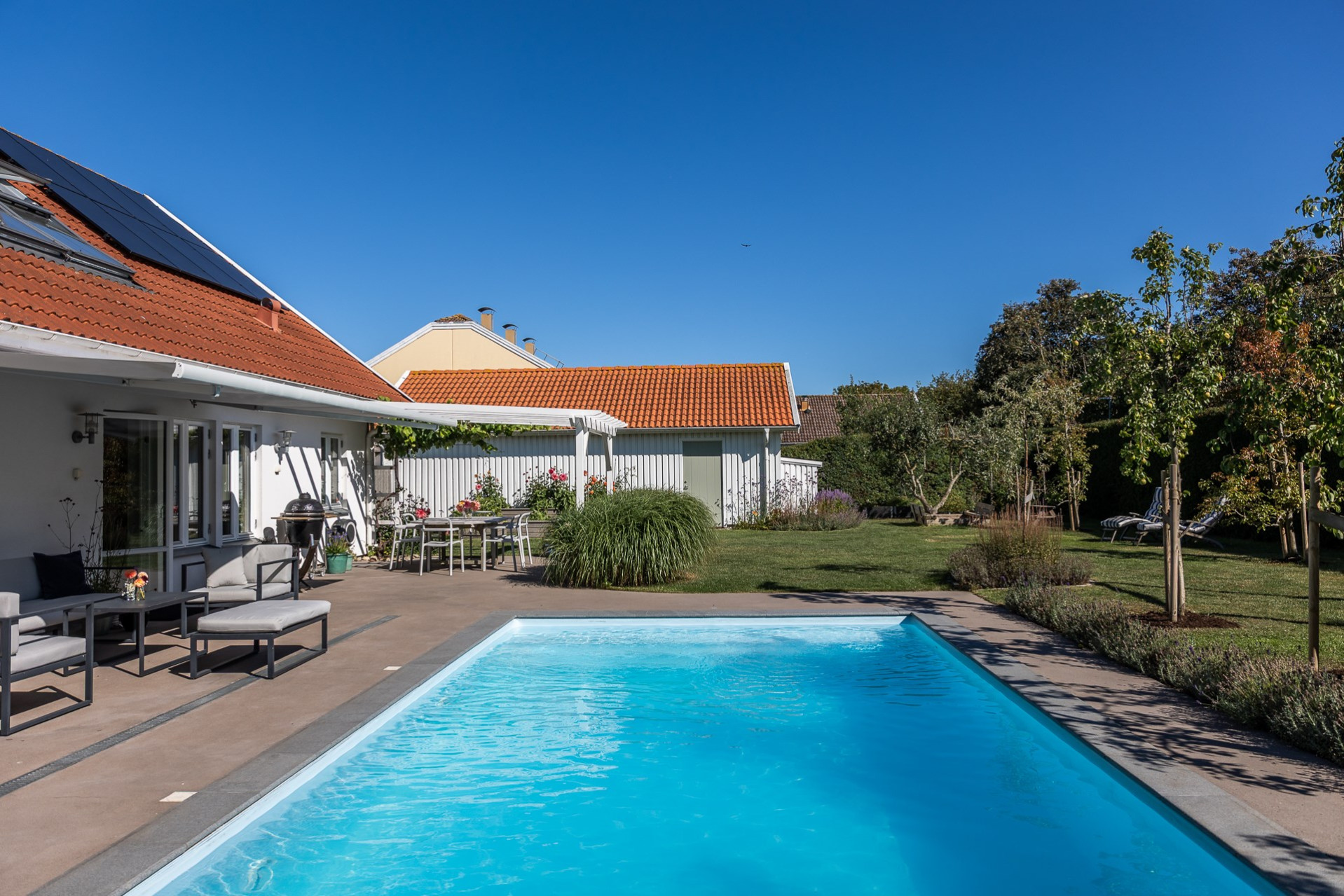 Rakt fram, sett från hallen, möts vi av husets fantastiska vardagsrum. Detta rum badar i ljus och erbjuder generösa ytor för både vardag och sociala sammanhang. Den delvis öppna planlösningen mot köket skapar en härlig rymd och här finns gott om plats för såväl ett stort matsalsbord som ett rymligt sällskapsmöblemang med utrymme kvar för ytterligare möblering om man önskar. Rummet har en fantastisk kontakt med trädgårdens baksida, en grönskande oas som förlänger hemmets sociala ytor under årets varmare dagar.