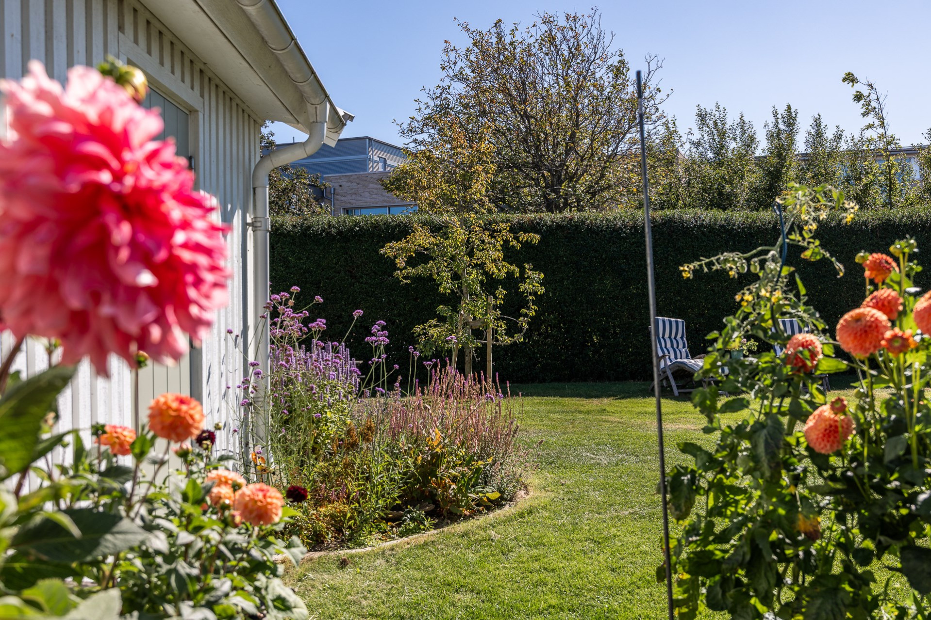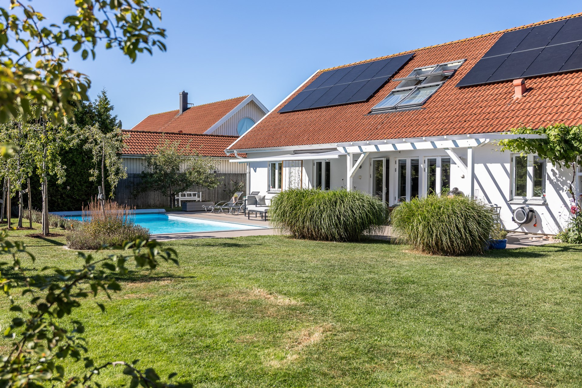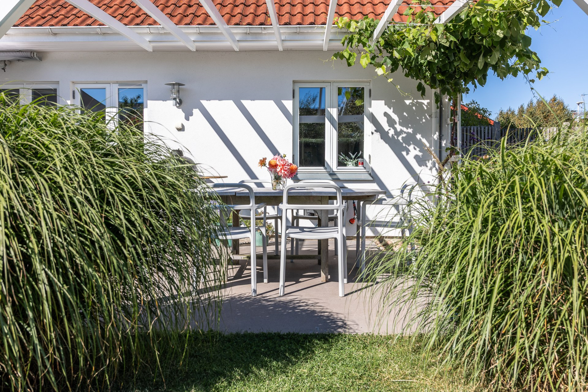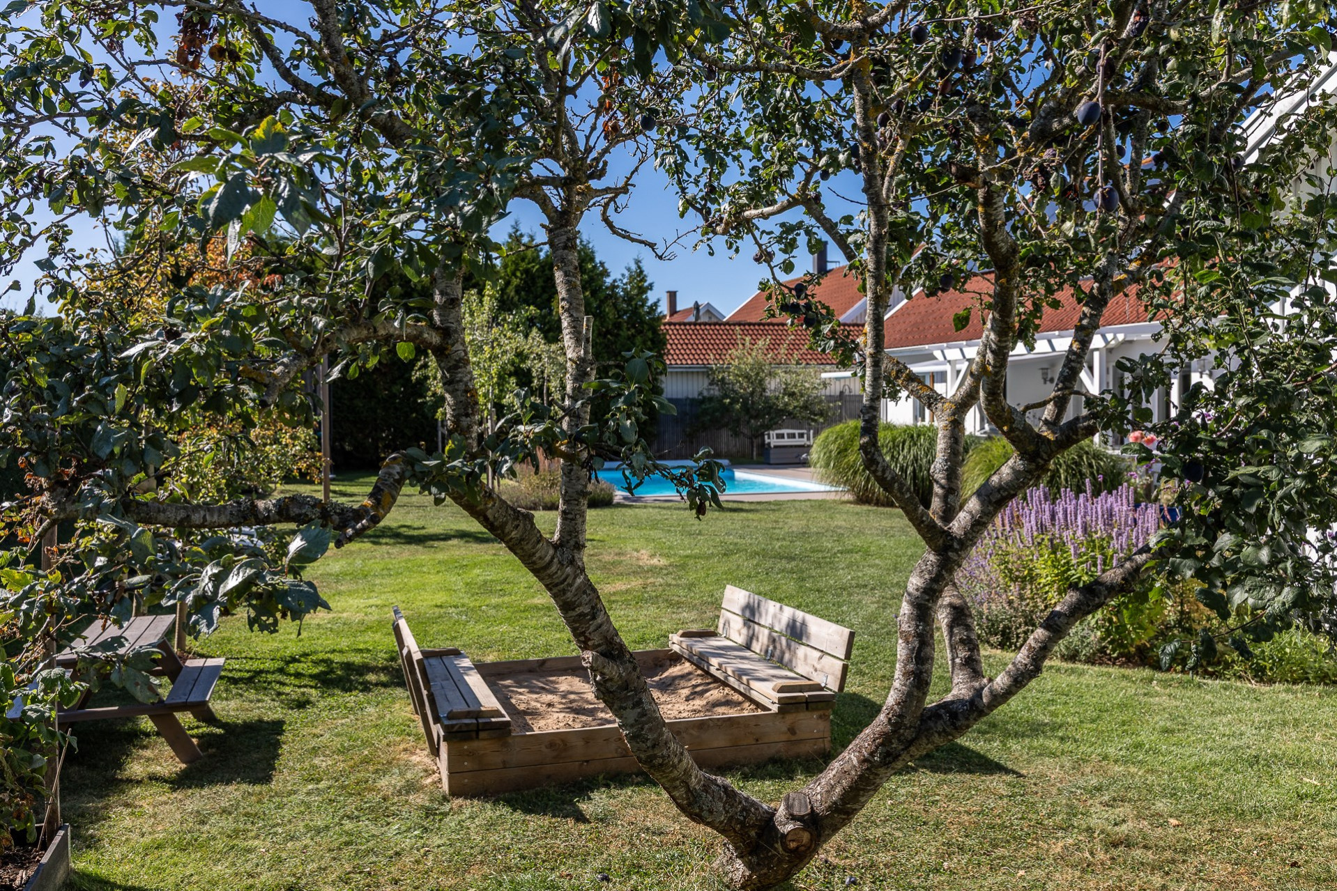 Rakt fram, sett från hallen, möts vi av husets fantastiska vardagsrum. Detta rum badar i ljus och erbjuder generösa ytor för både vardag och sociala sammanhang. Den delvis öppna planlösningen mot köket skapar en härlig rymd och här finns gott om plats för såväl ett stort matsalsbord som ett rymligt sällskapsmöblemang med utrymme kvar för ytterligare möblering om man önskar. Rummet har en fantastisk kontakt med trädgårdens baksida, en grönskande oas som förlänger hemmets sociala ytor under årets varmare dagar.