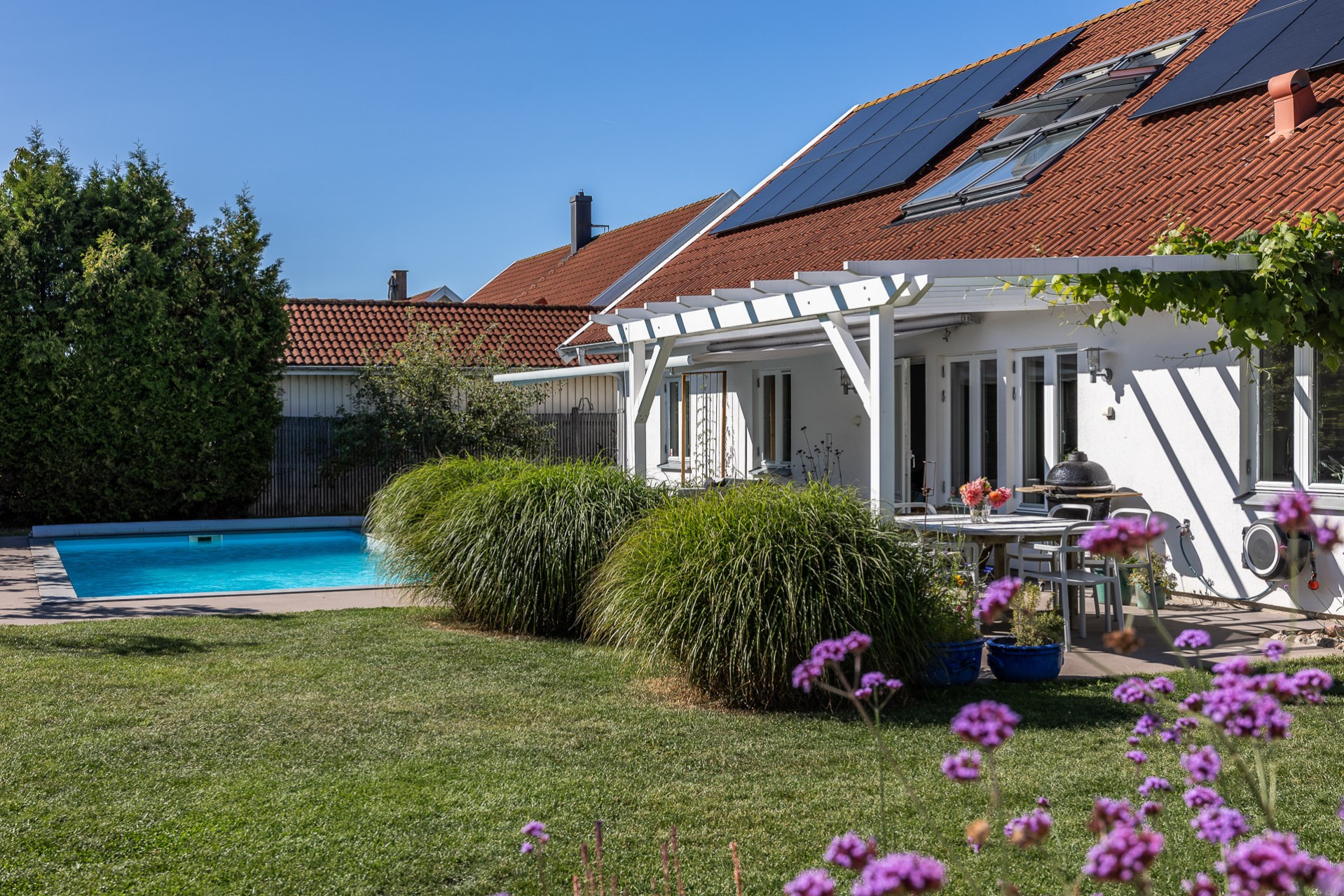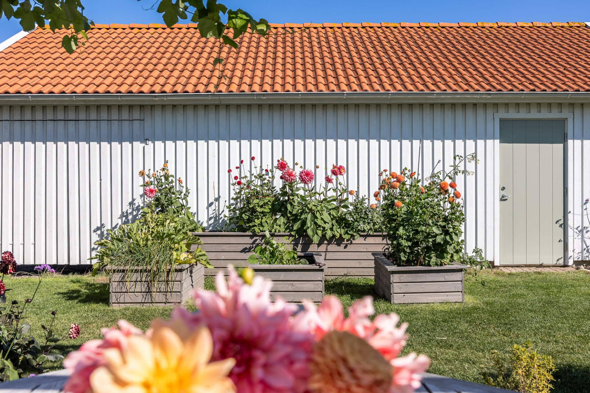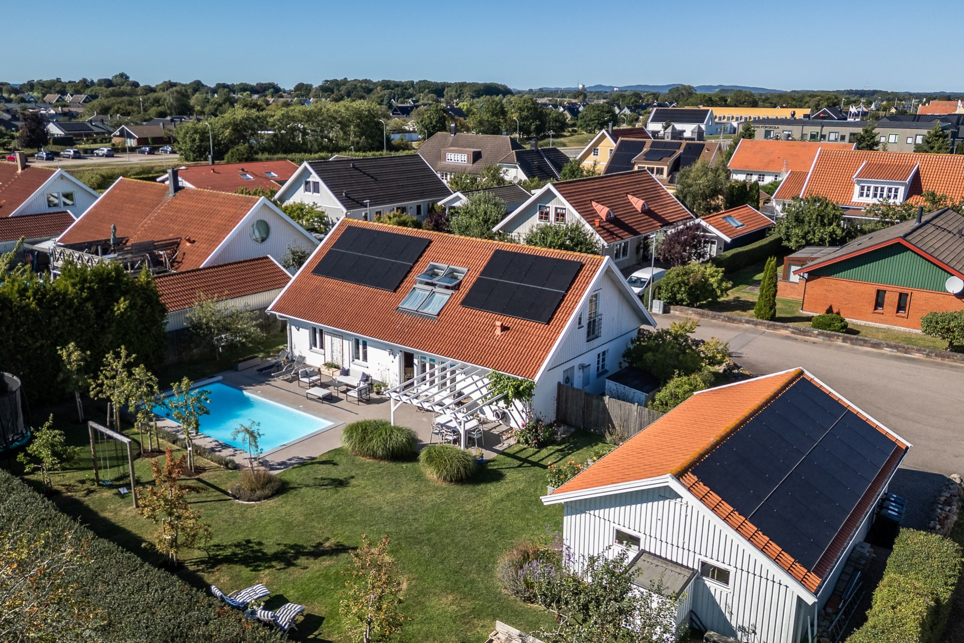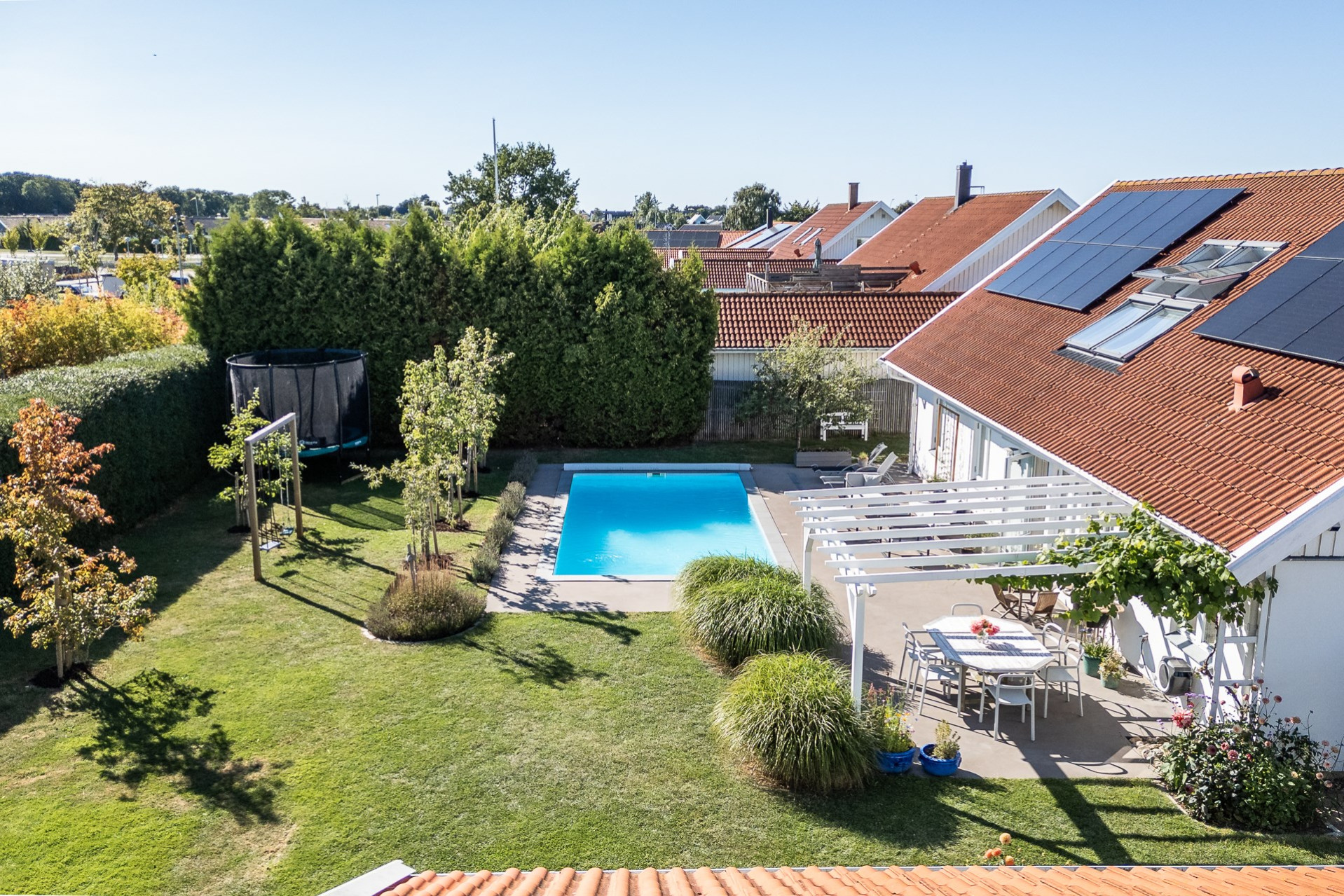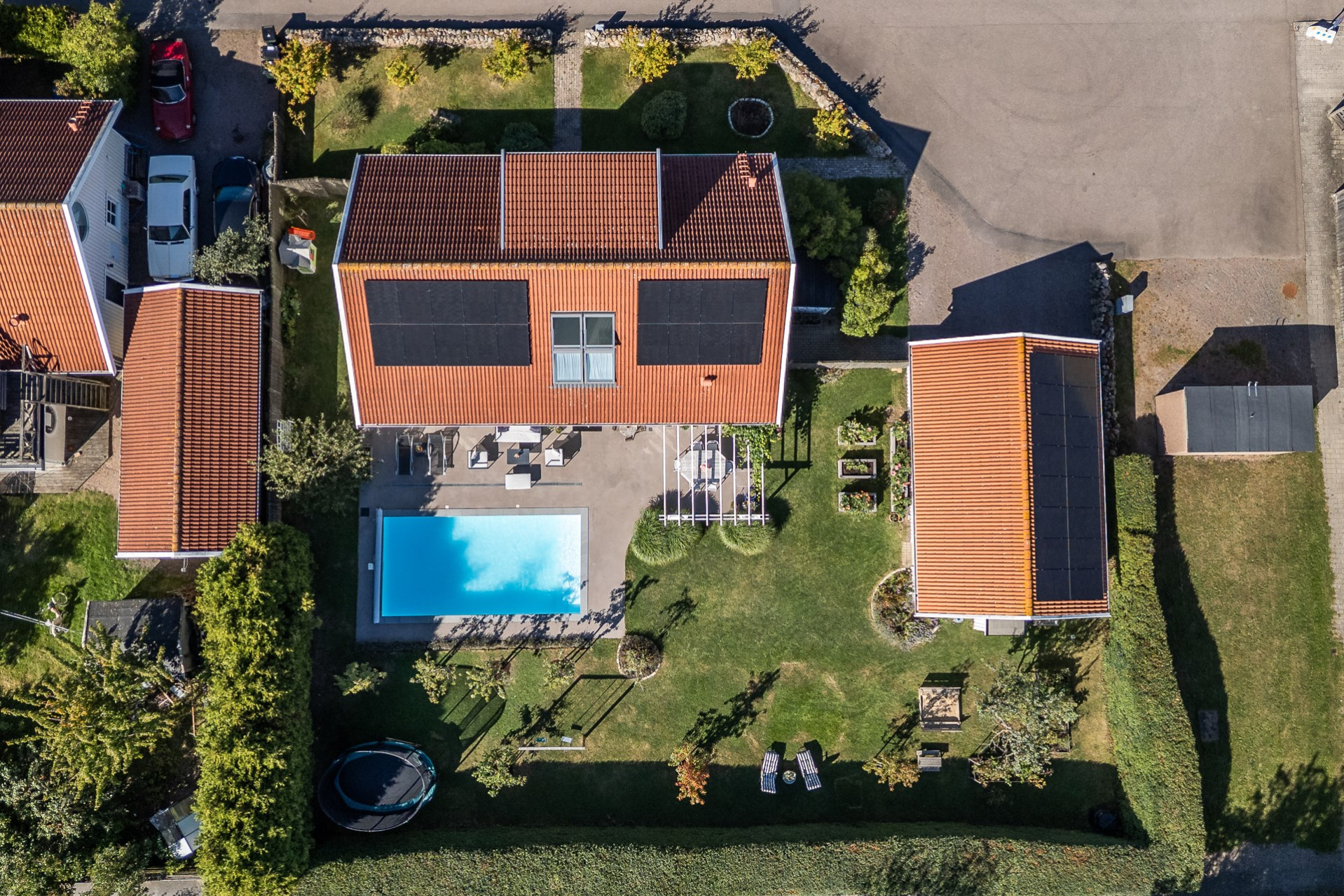Rakt fram, sett från hallen, möts vi av husets fantastiska vardagsrum. Detta rum badar i ljus och erbjuder generösa ytor för både vardag och sociala sammanhang. Den delvis öppna planlösningen mot köket skapar en härlig rymd och här finns gott om plats för såväl ett stort matsalsbord som ett rymligt sällskapsmöblemang med utrymme kvar för ytterligare möblering om man önskar. Rummet har en fantastisk kontakt med trädgårdens baksida, en grönskande oas som förlänger hemmets sociala ytor under årets varmare dagar.