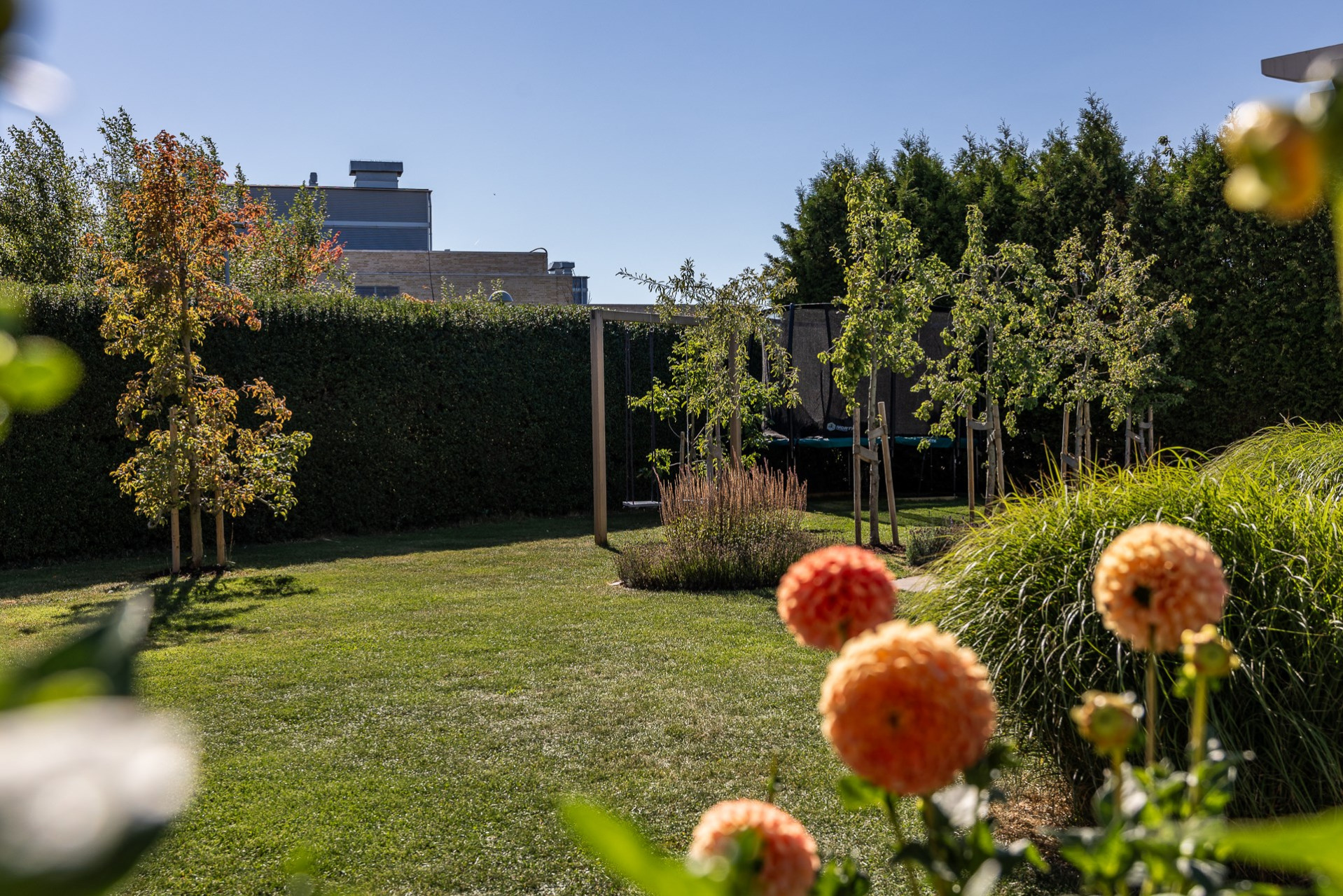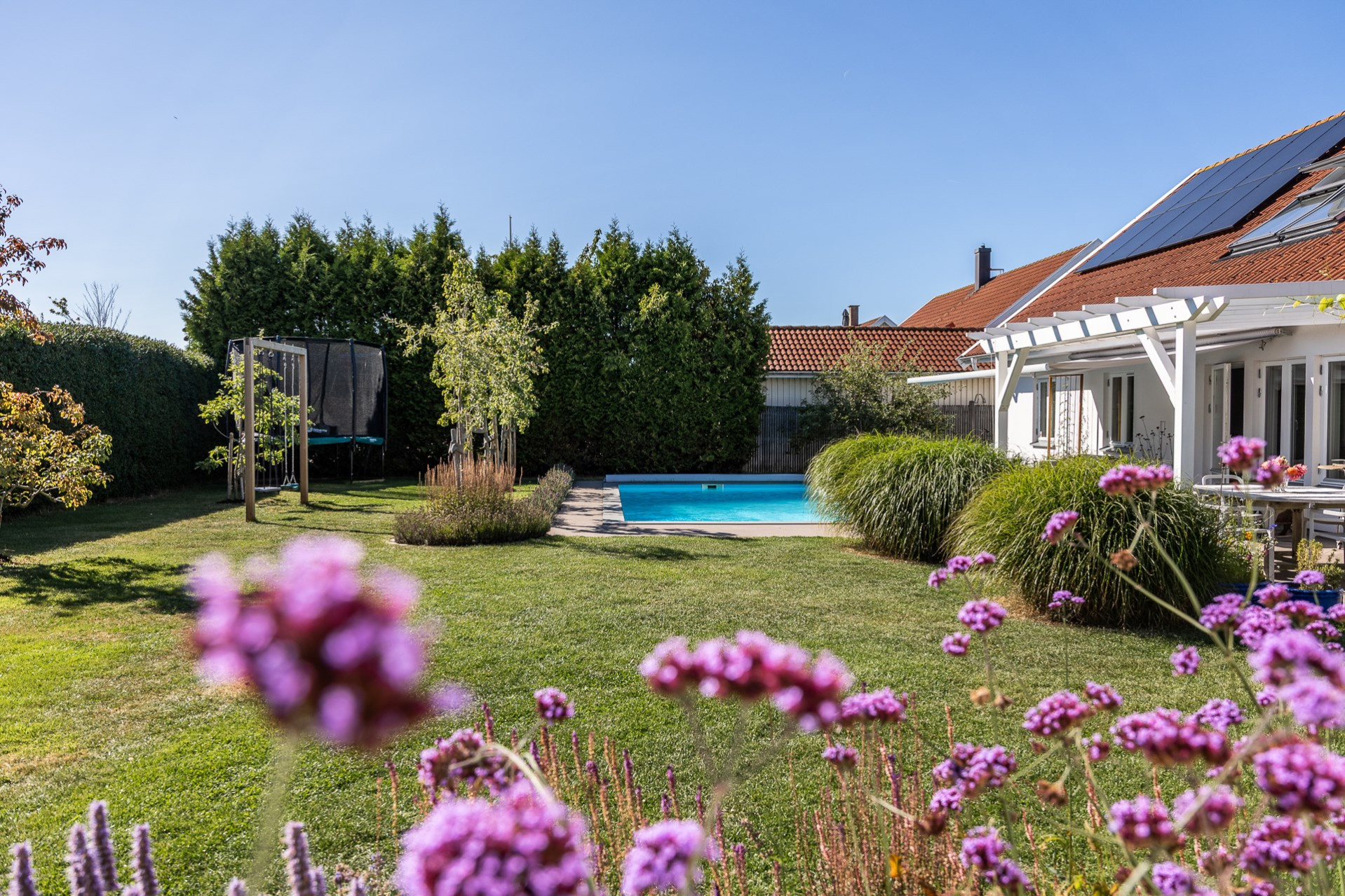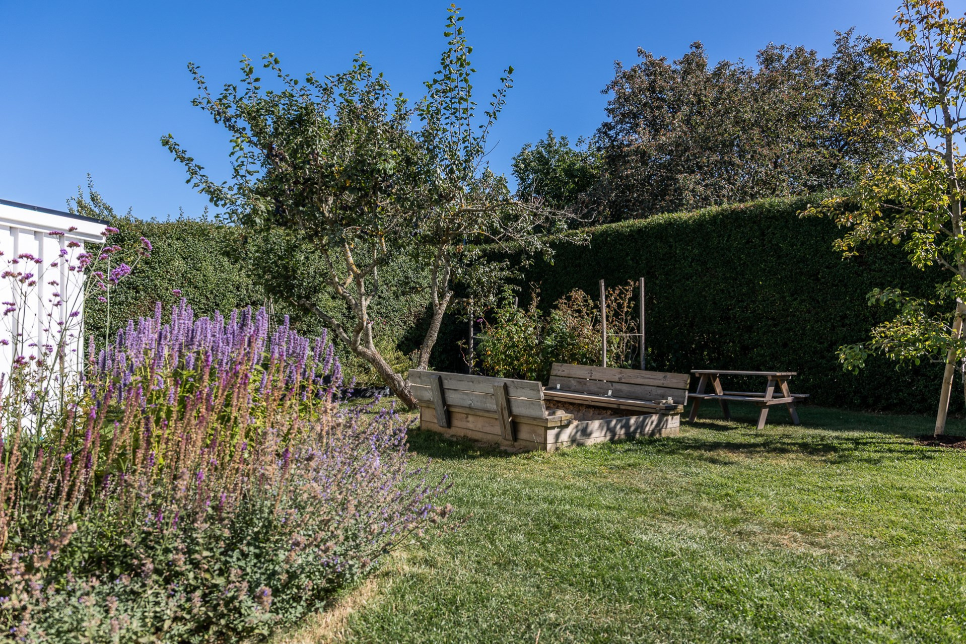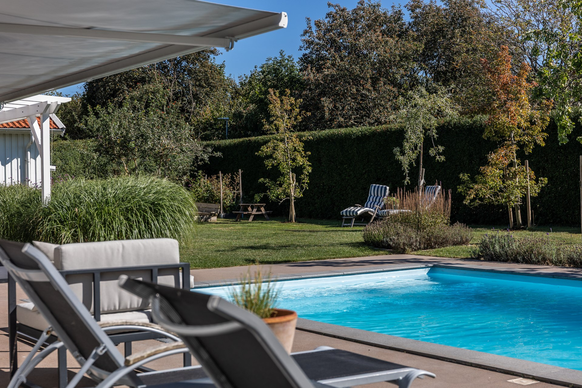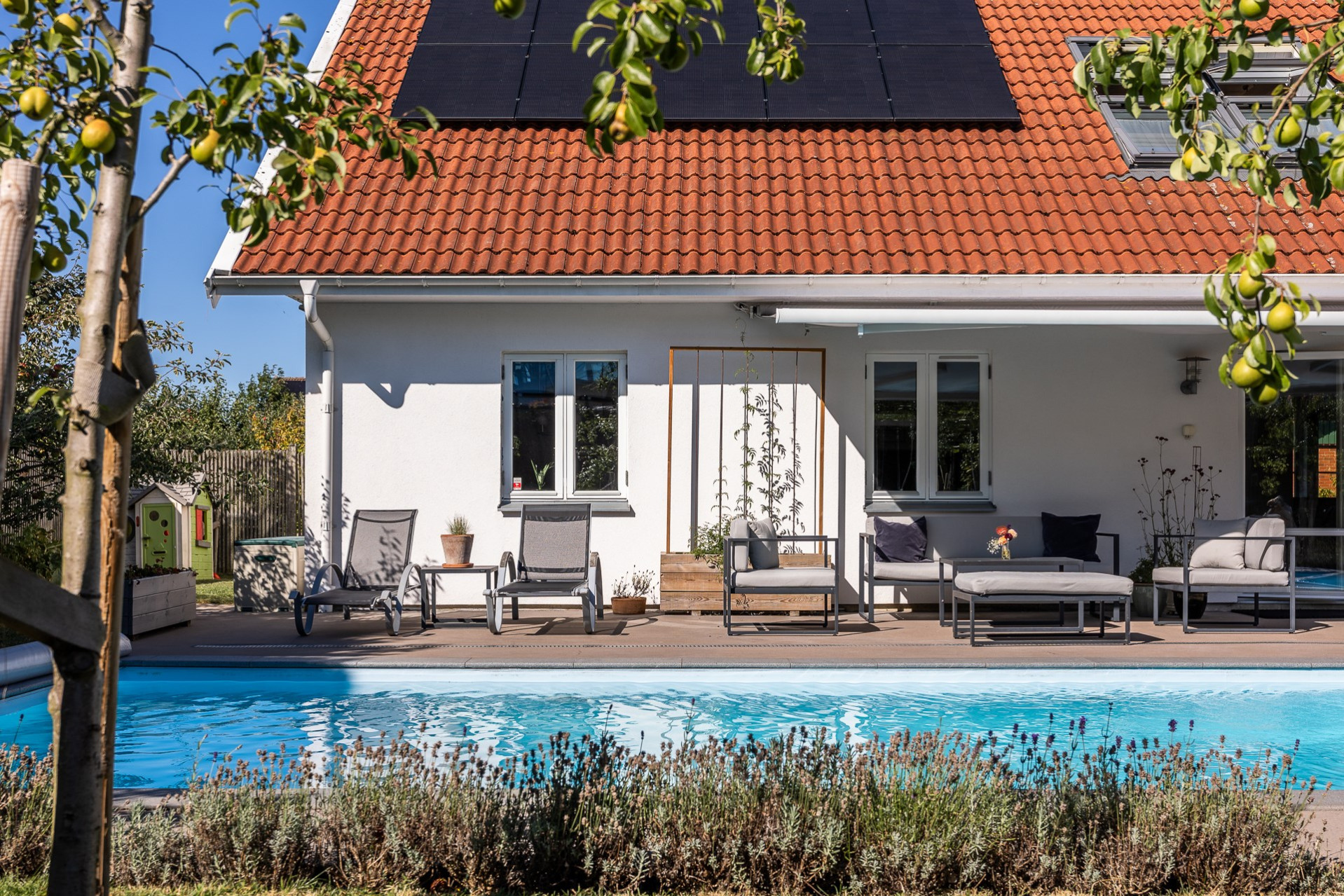 Rakt fram, sett från hallen, möts vi av husets fantastiska vardagsrum. Detta rum badar i ljus och erbjuder generösa ytor för både vardag och sociala sammanhang. Den delvis öppna planlösningen mot köket skapar en härlig rymd och här finns gott om plats för såväl ett stort matsalsbord som ett rymligt sällskapsmöblemang med utrymme kvar för ytterligare möblering om man önskar. Rummet har en fantastisk kontakt med trädgårdens baksida, en grönskande oas som förlänger hemmets sociala ytor under årets varmare dagar.