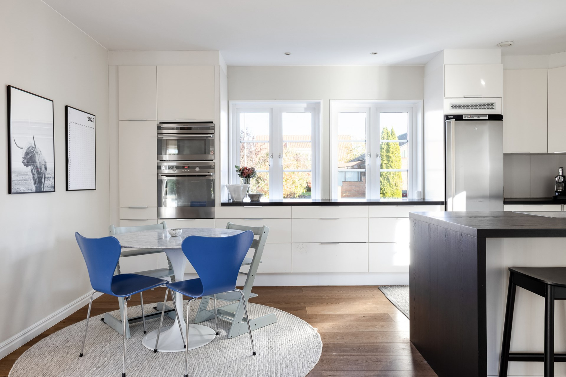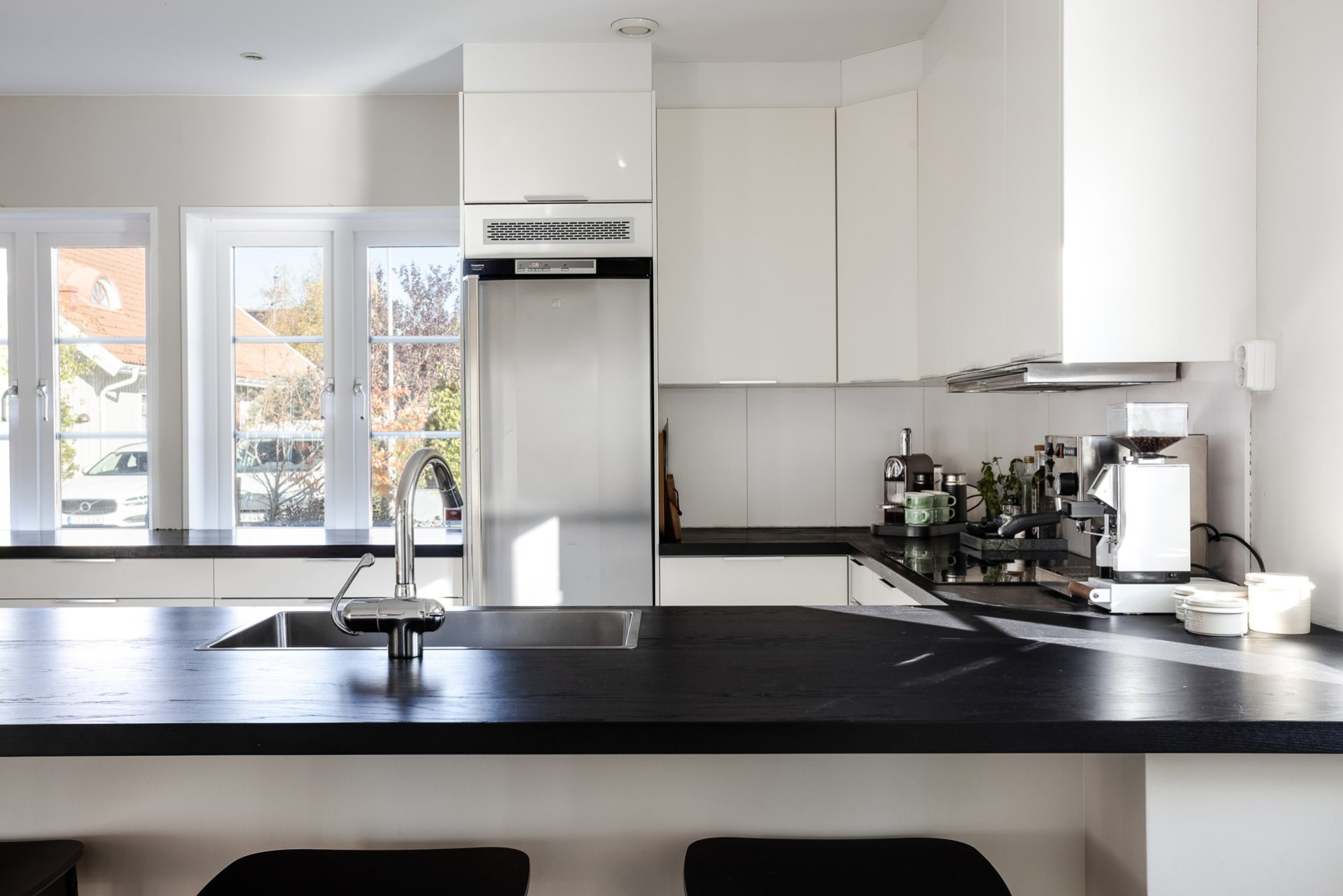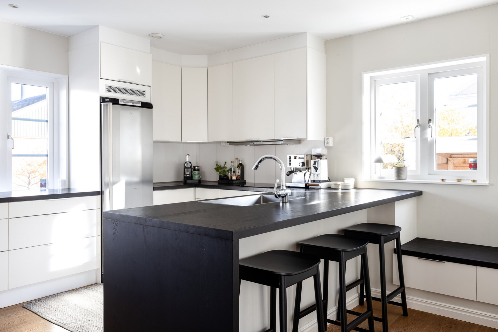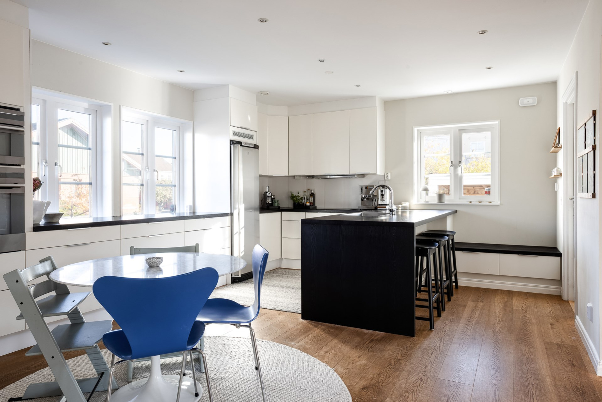 Det stilrena vita köket är mycket inbjudande och bjuder på fantastiska arbetsytor. Här har nuvarande ägare förnyat bänkskivan till en svartbetsad massiv träskiva med ny vask, blandare och induktionshäll. Köket är utformat i praktisk U-form och erbjuder gott om förvaring. I samband med bänkskivebytet skapades även en trivsam bardel med plats för tre personer, perfekt för den snabba frukosten eller ett glas och lite försnacks när vännerna kommer över. Utrustningen består av kyl, ugn, mikro, diskmaskin, induktionshäll och fläkt. En naturlig matplats finns dessutom med utrymme för upp till sex personer.
