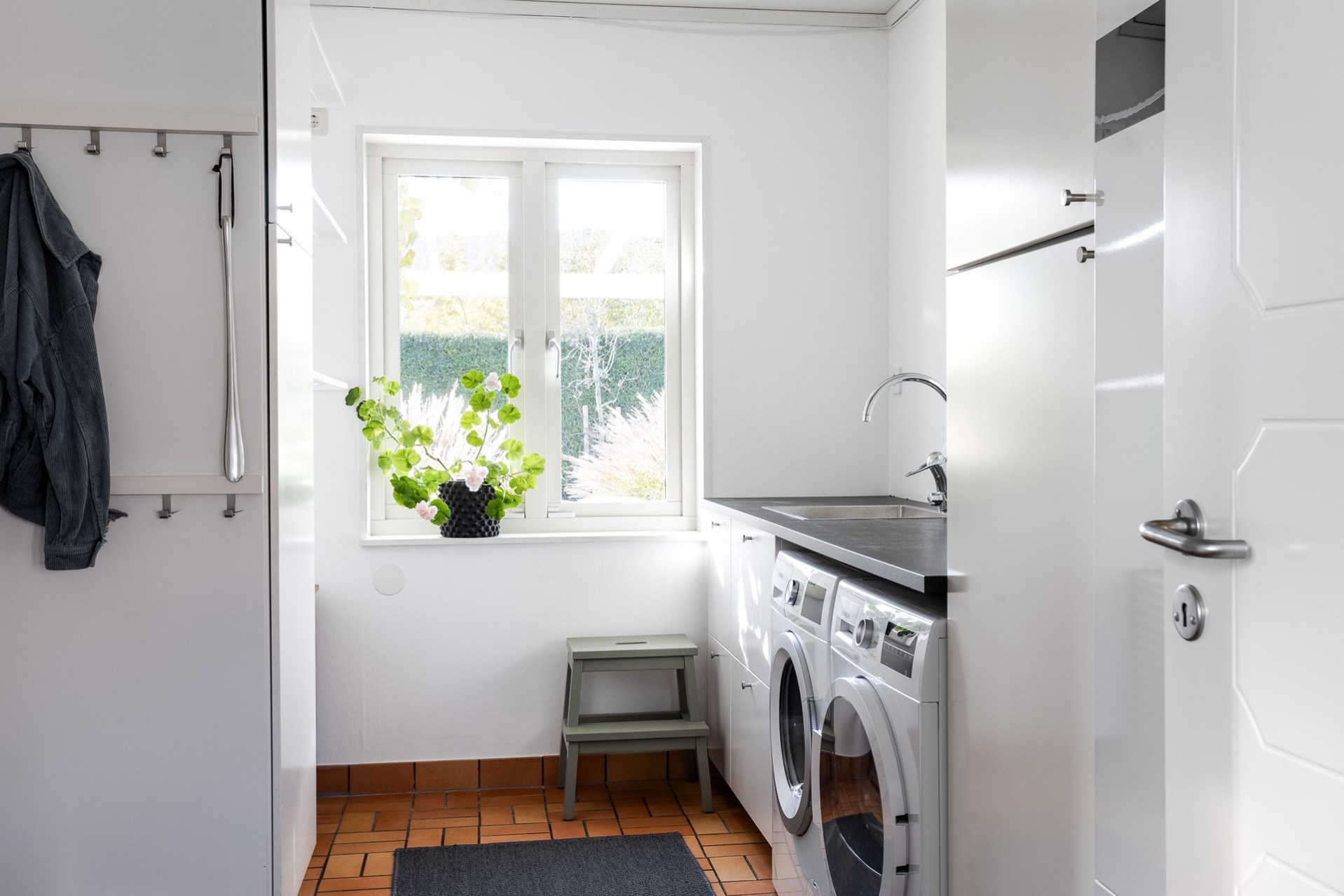 Tvättstugan är perfekt placerad mot husets uppfart och har nyligen uppdaterats av nuvarande ägare för att bli ännu mer praktisk och lättanvänd. Här finns utmärkta avhängningsmöjligheter, två rymliga högskåp för förvaring, en generös arbetsbänk samt både tvättmaskin och torktumlare.