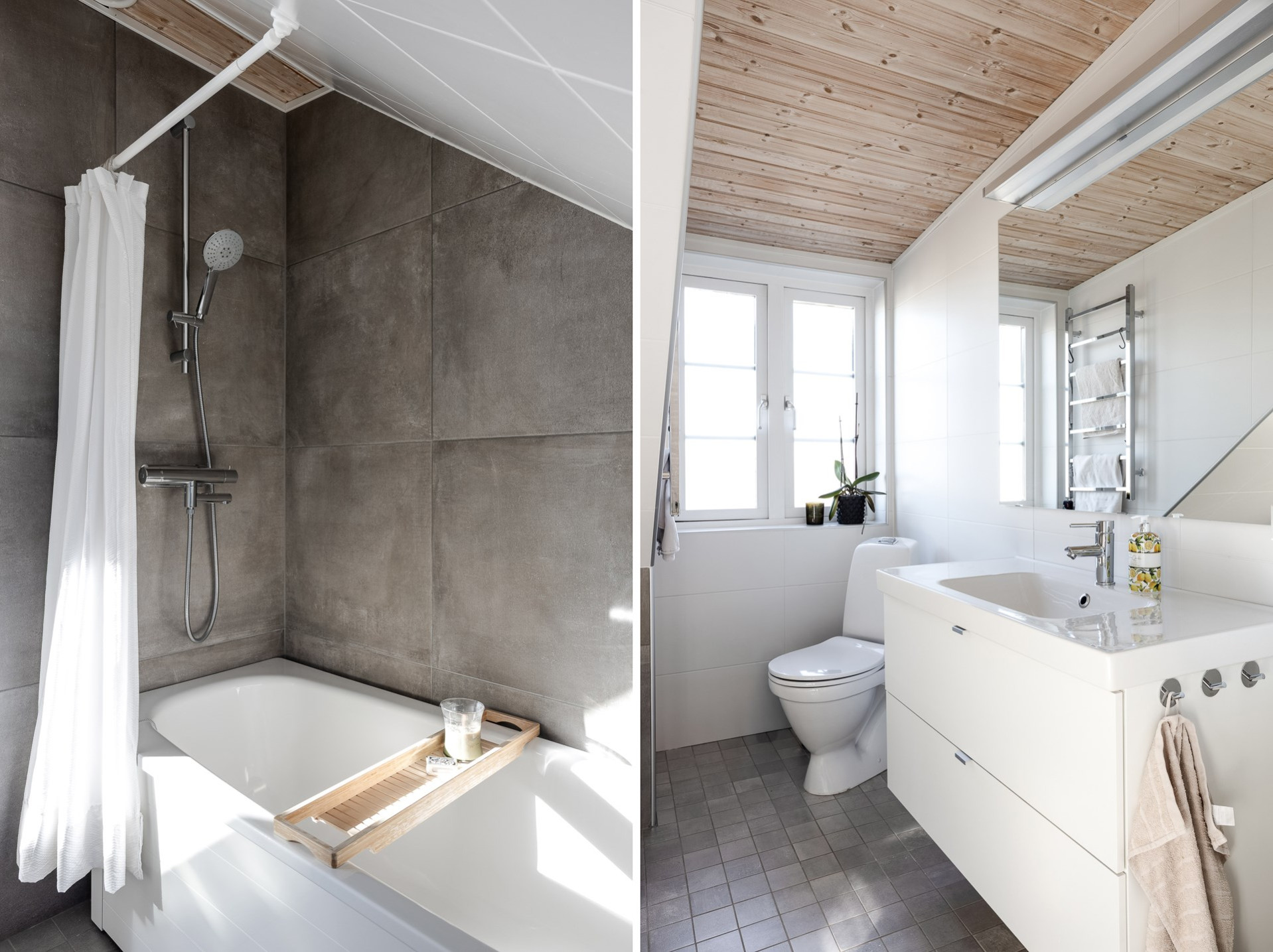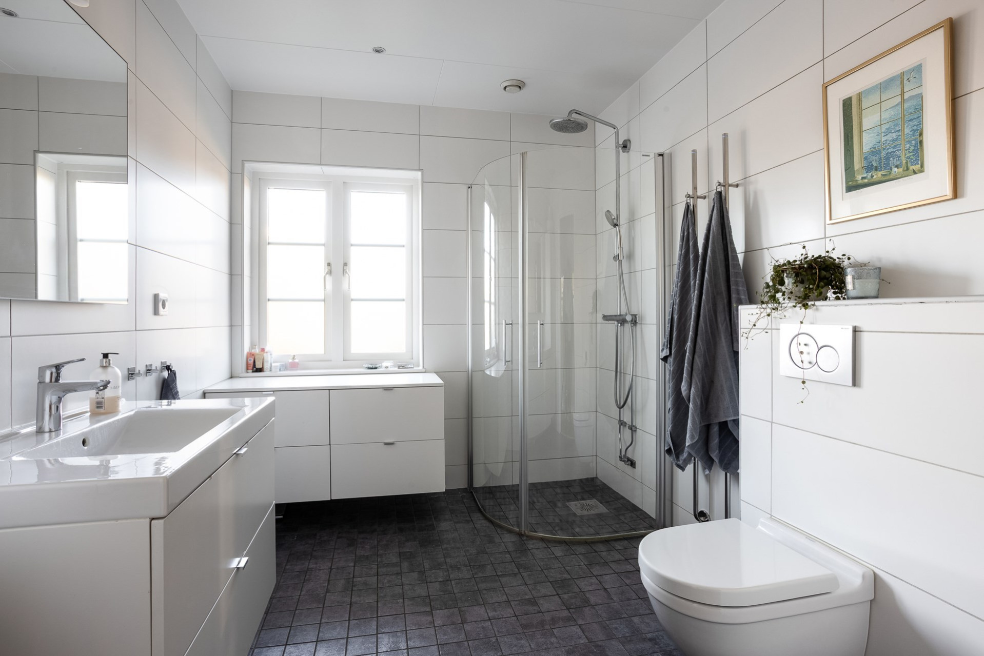 Nedervåningens badrum renoverades 2014 och är än idag i mycket fint skick. Det är helkaklat i klassiska toner med grå klinker på golv och vita större plattor på väggarna. Badrummet är generöst tilltaget och erbjuder en rymlig duschhörna, vägghängd toalett, kommod med förvaring, spegel samt spotlights i taket. Ett fönster ger både naturligt ljus och möjlighet till effektiv vädring.