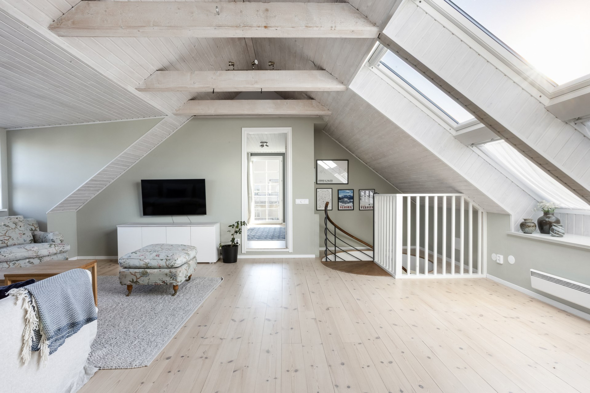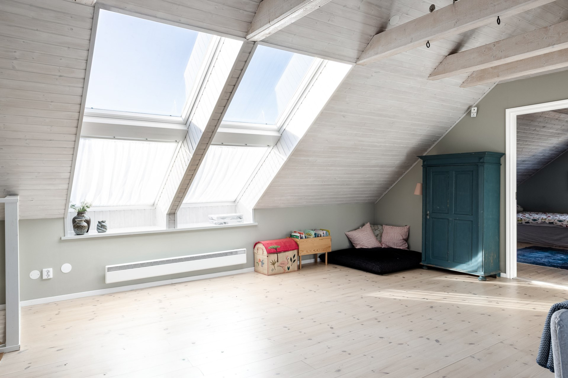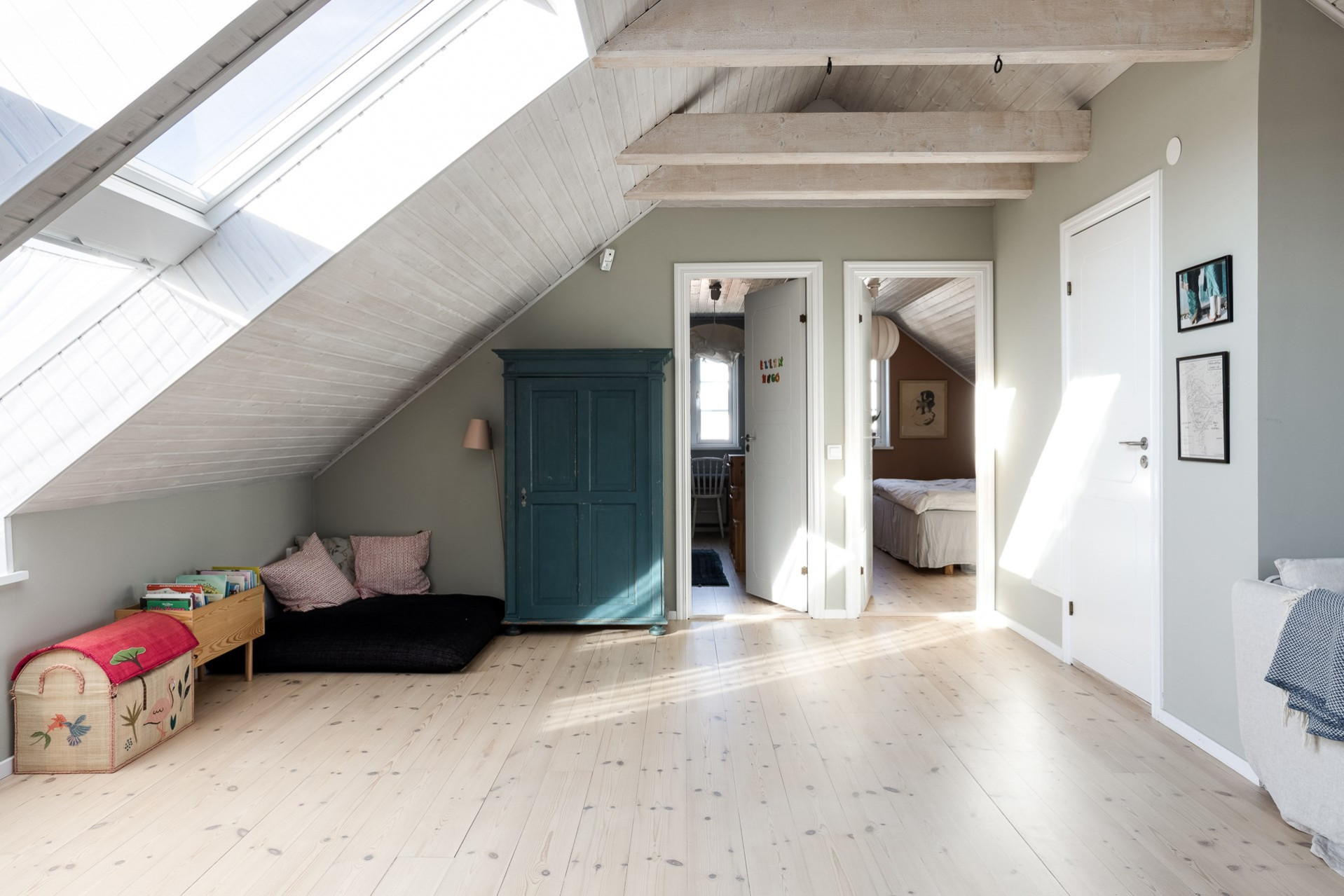 Det stora allrummet på ovanvåningen erbjuder en fantastiskt känsla. Här finner vi dels en kupa med tre generösa fönster men också två ovanligt stora takfönster av typen som kan öppnas uppåt likt små balkonger. Kupan, som idag fungerar som rummets tv-hörna, kan man med små enkla medel förvandla till ett utmärkt extra sovrum. Det vitlaserade trätaket med synliga, matchande bjälkar ger rummet en varm och otroligt trevlig känsla. Lindgröna väggar samt vitlaserat furugolv.