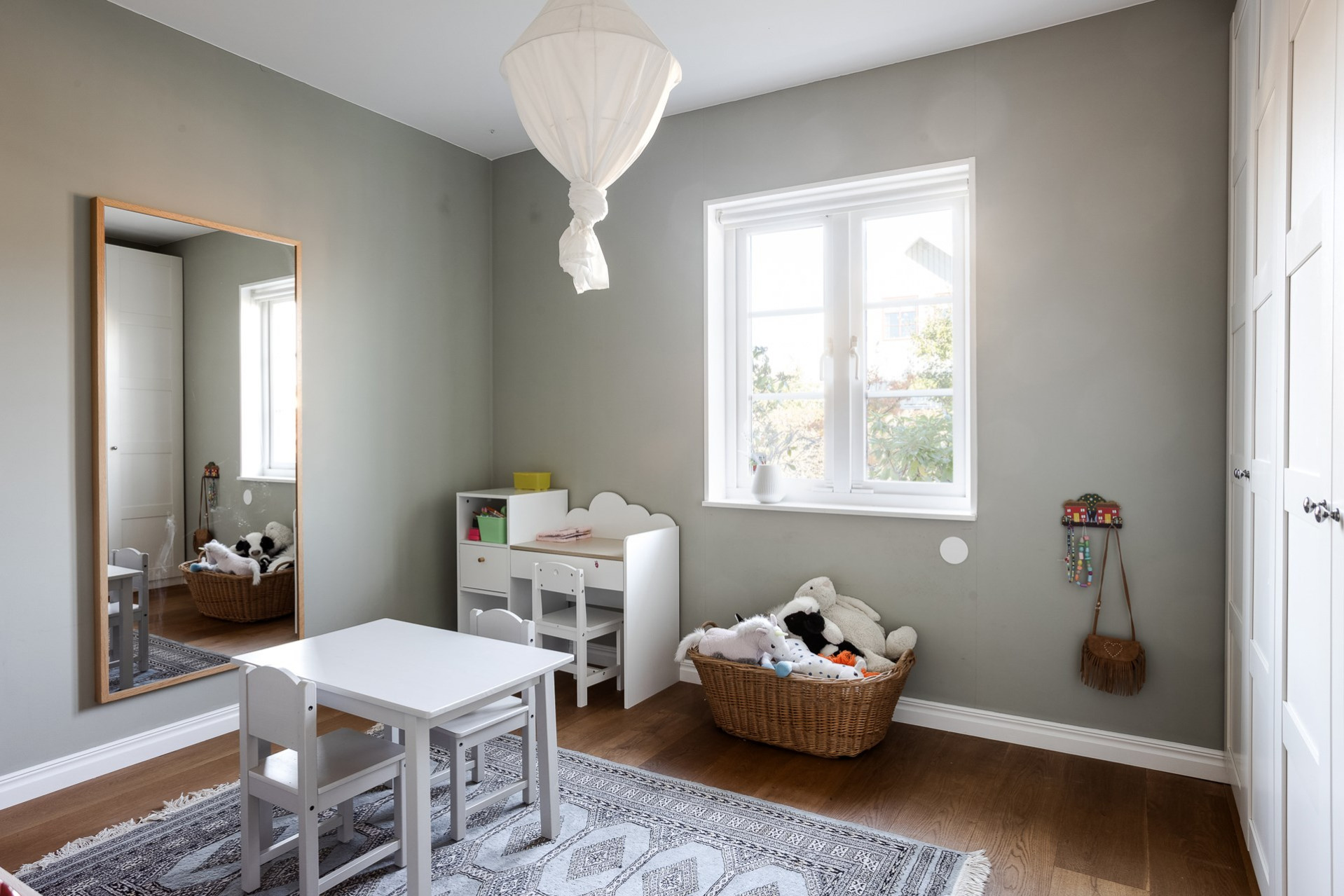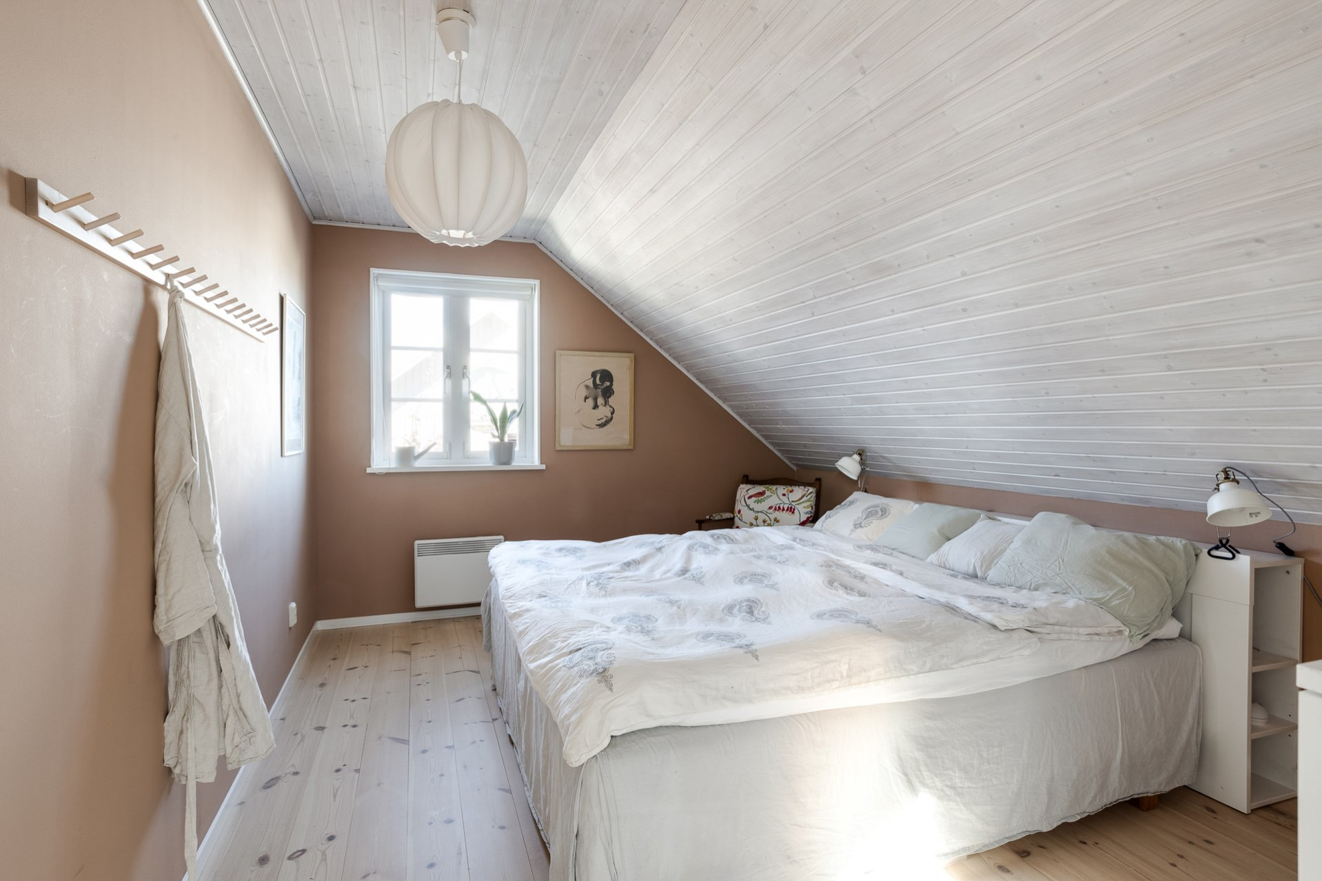 Två identiska och mycket trivsamma barnrum, båda med det vackra vitlaserade taket och samma enhetliga golv som övriga rum på våningsplanet. Det ena rummet är målat i en mjuk grön ton och det andra i en varm terrakottaliknande nyans.
