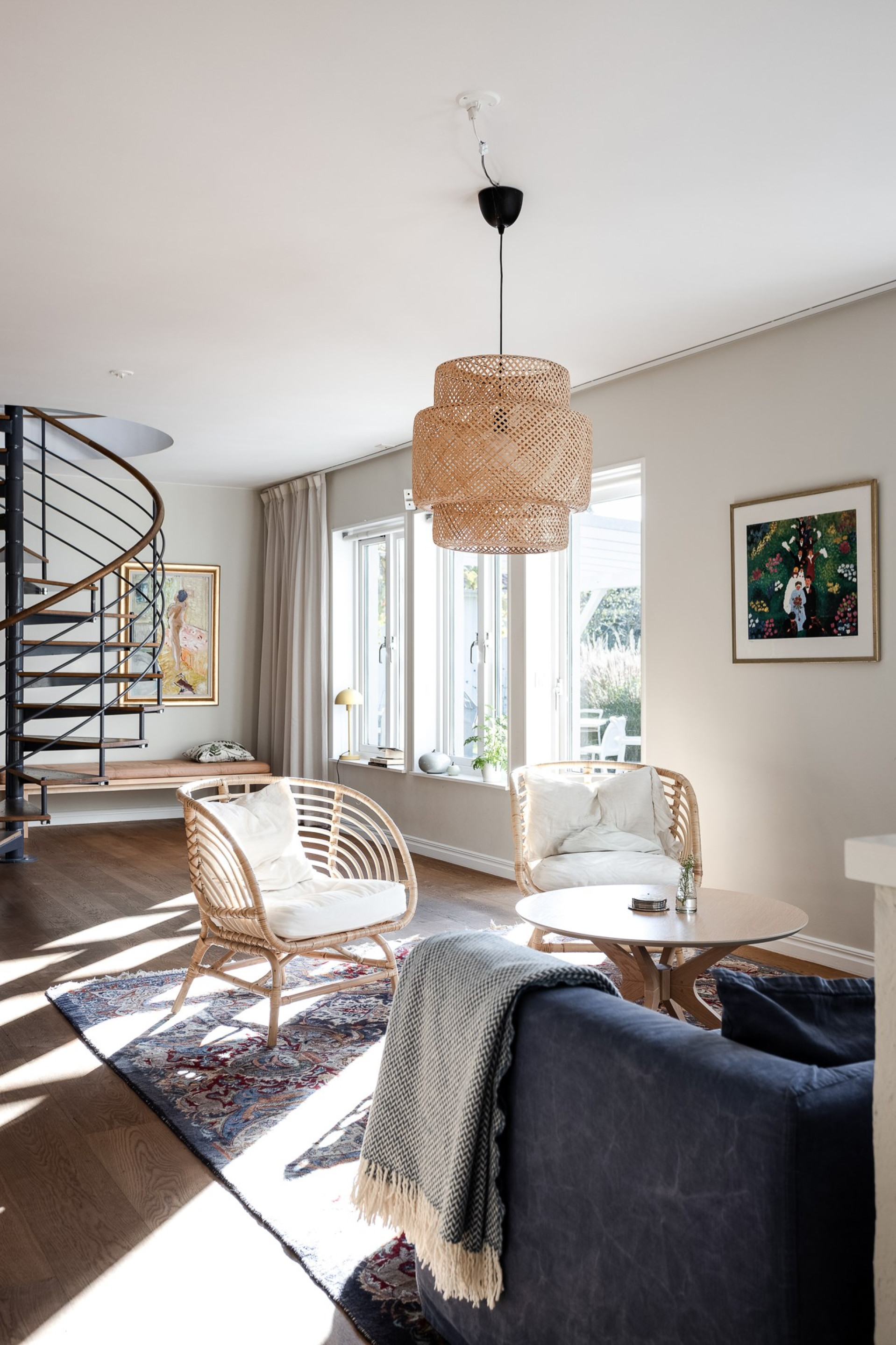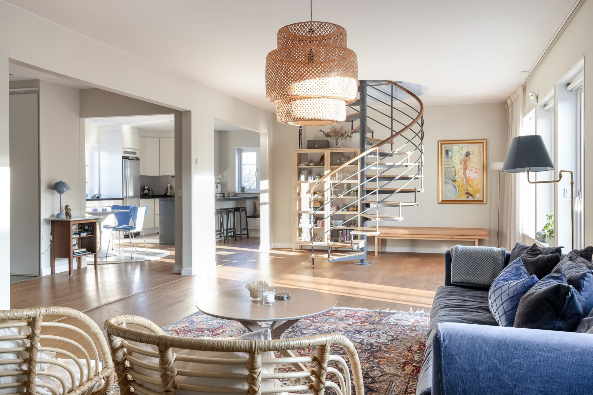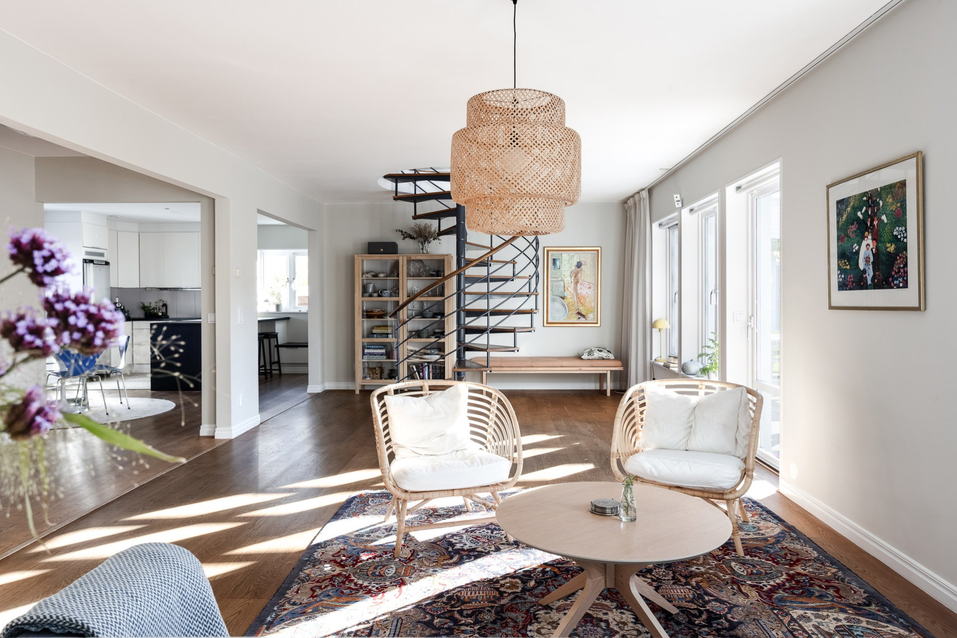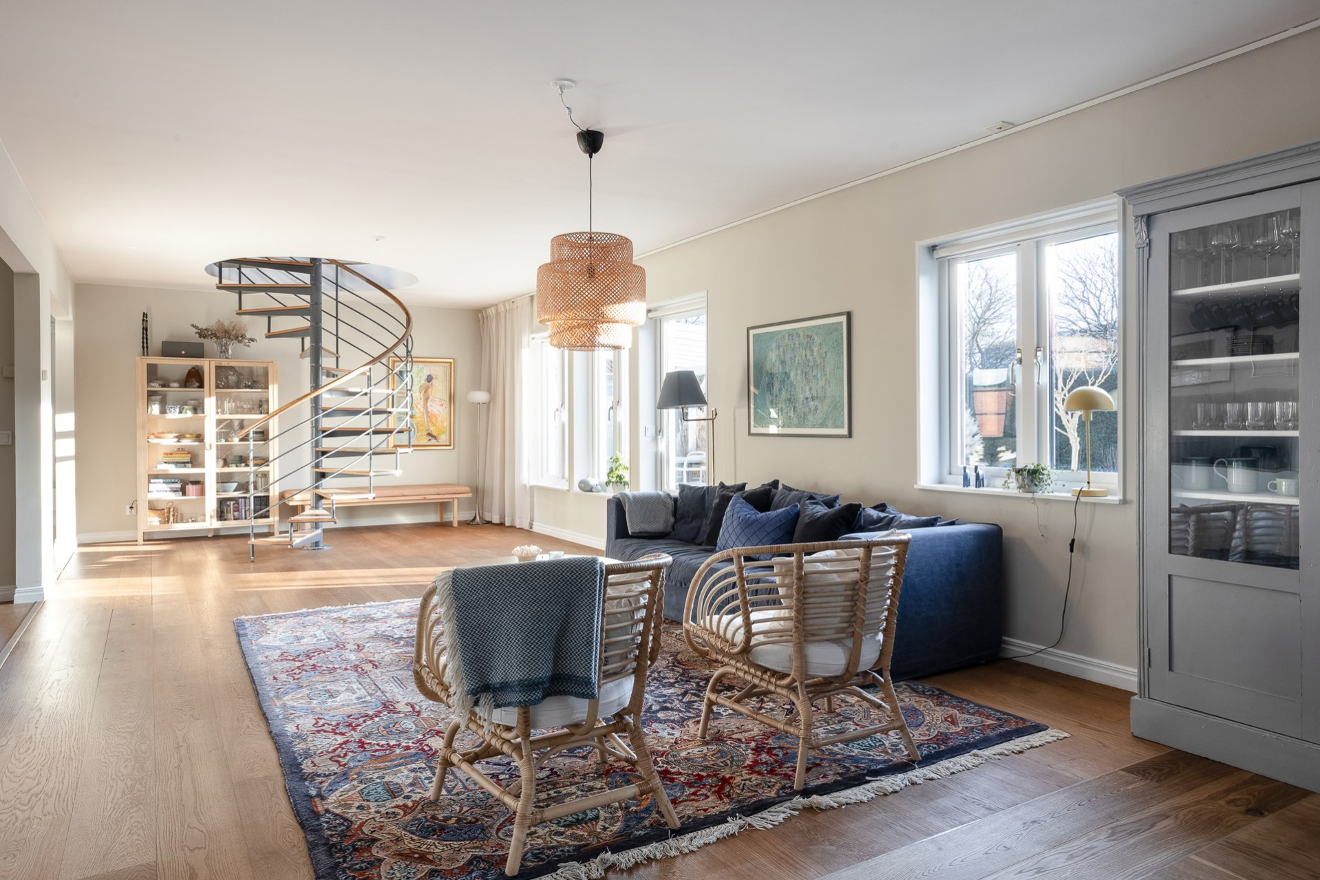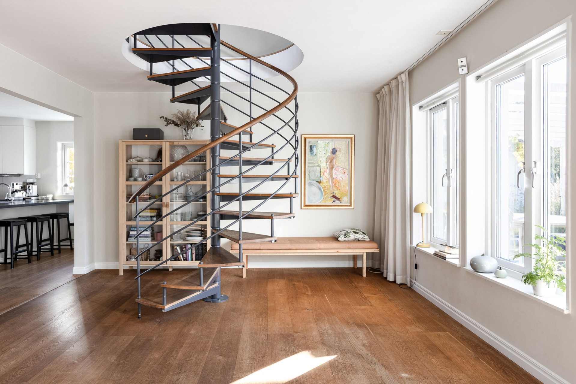 Den stilfulla spiraltrappan leder upp till husets generösa ovanvåning, där tre sovrum, ett rymligt allrum och ett badrum breder ut sig. Här finns dessutom flexibla möjligheter att skapa ytterligare sovrum för den som önskar.