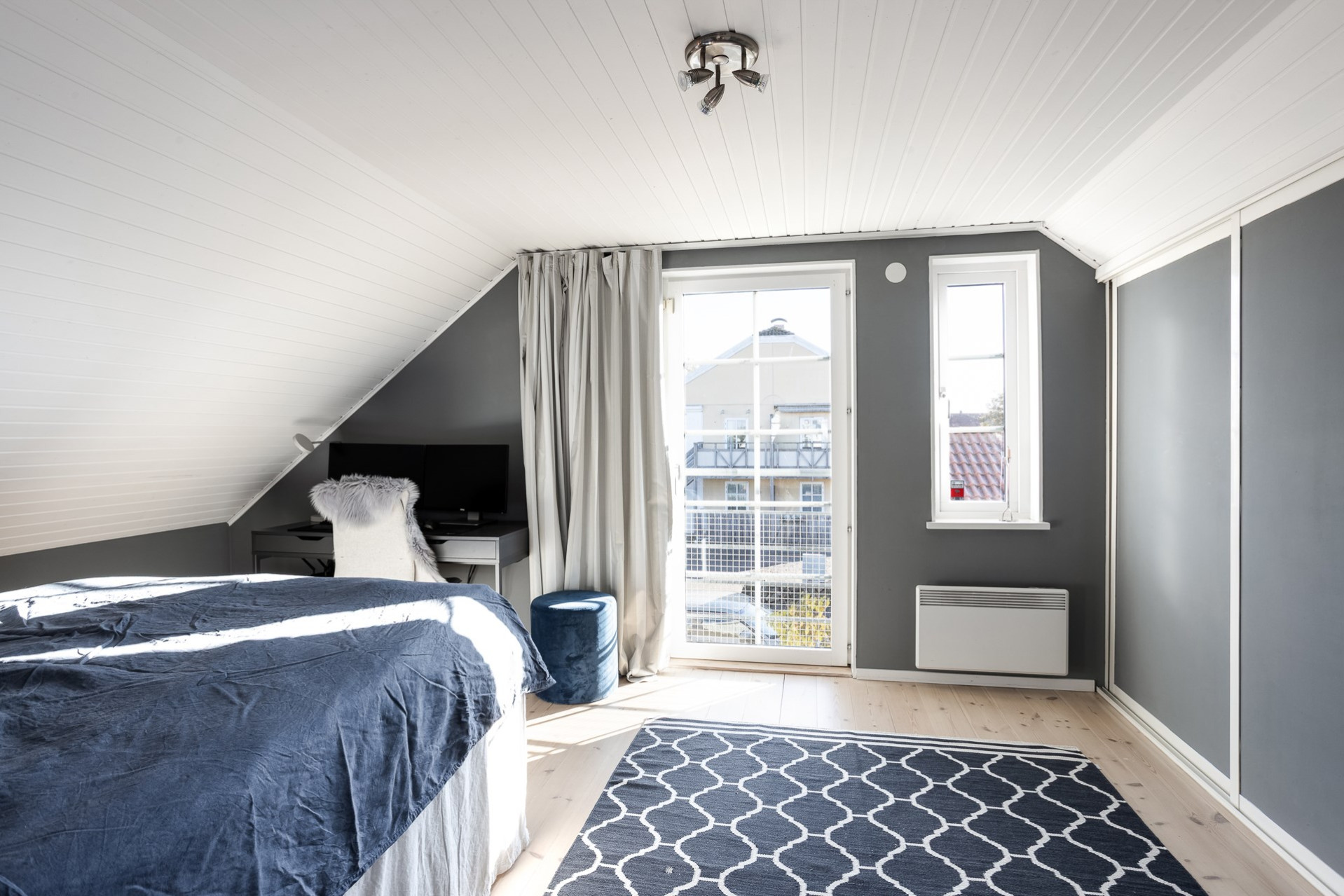 Master bedroom med fransk balkong och härligt ljusinsläpp. Längs en hel vägg löper stilrena grå skjutgarderober som ger gott om förvaring. Här finns plats för en dubbelsäng och även en mindre kontorsplats för den som önskar. Vitmålat tak samt gråa väggar