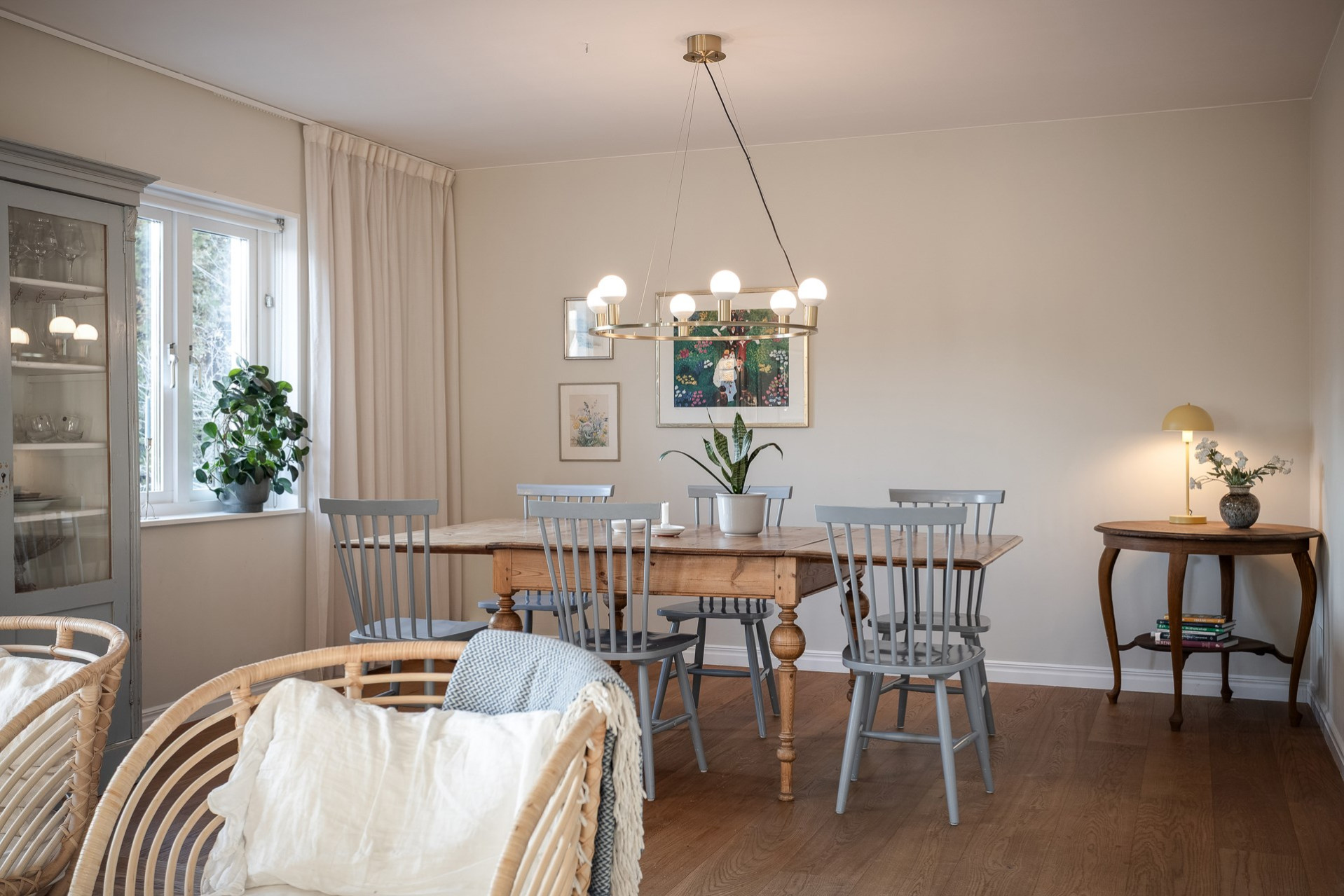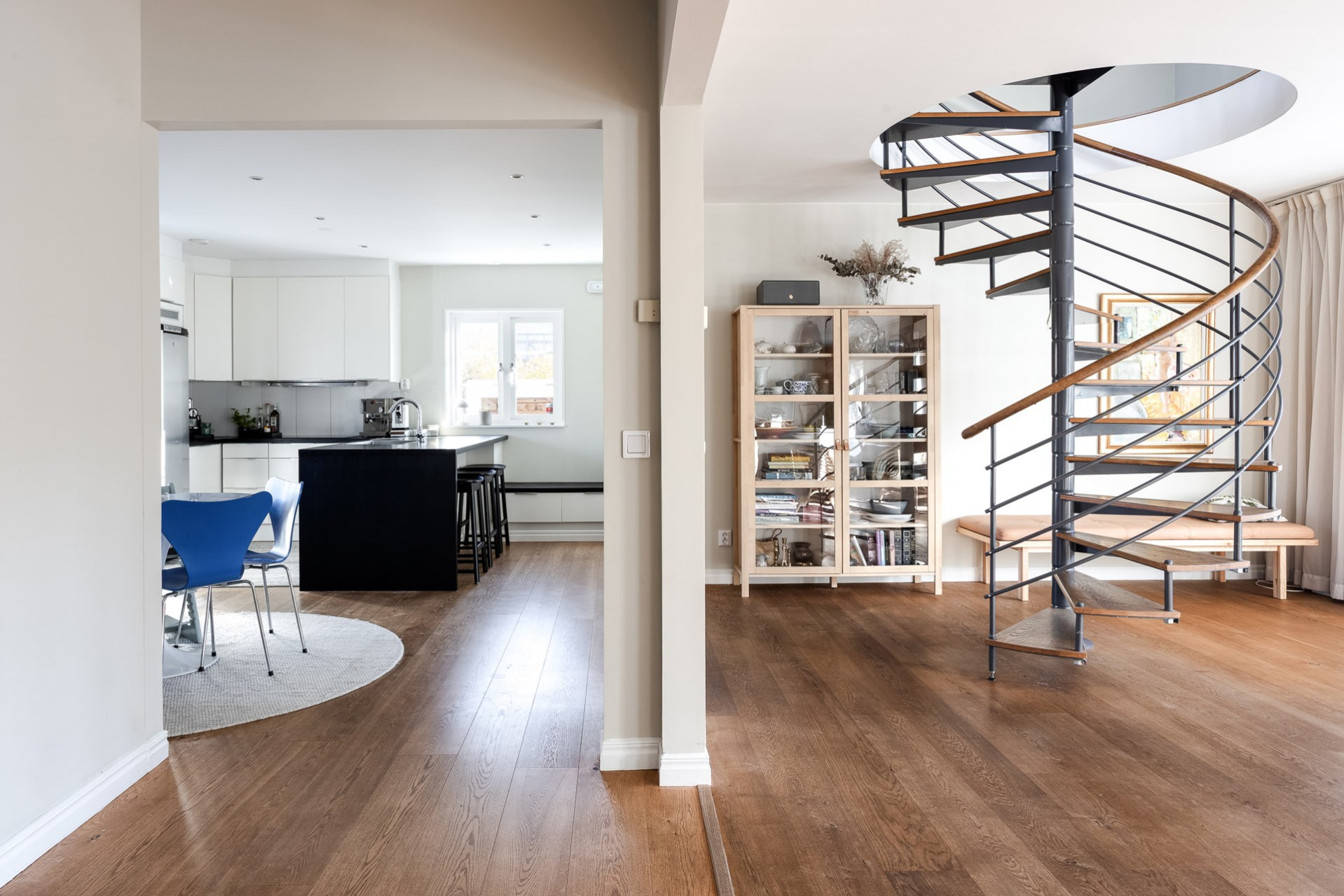 Genomgående för hela entréplanet är det vackra 1-stavsgolvet i en mörkare nyans med behaglig golvvärme.