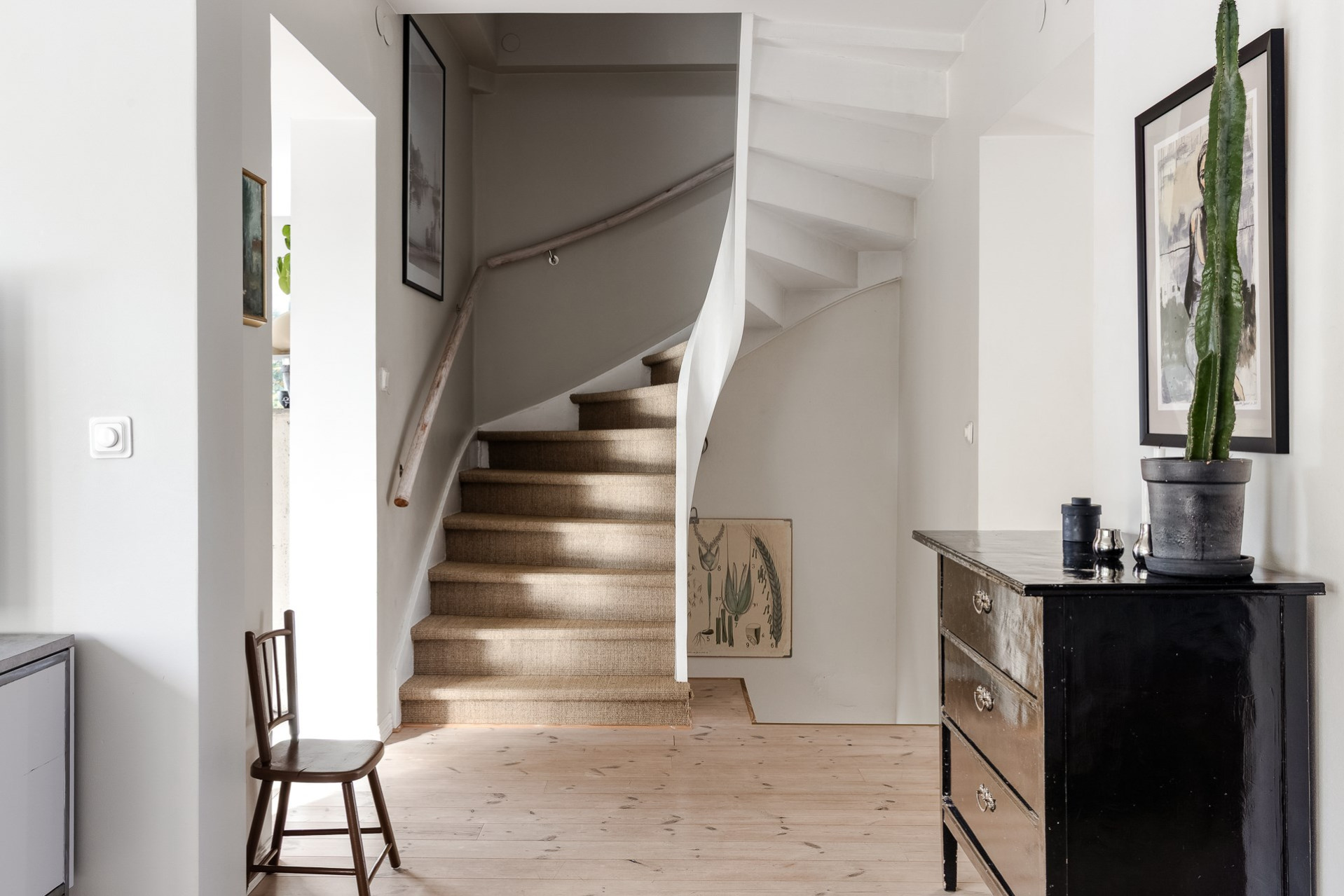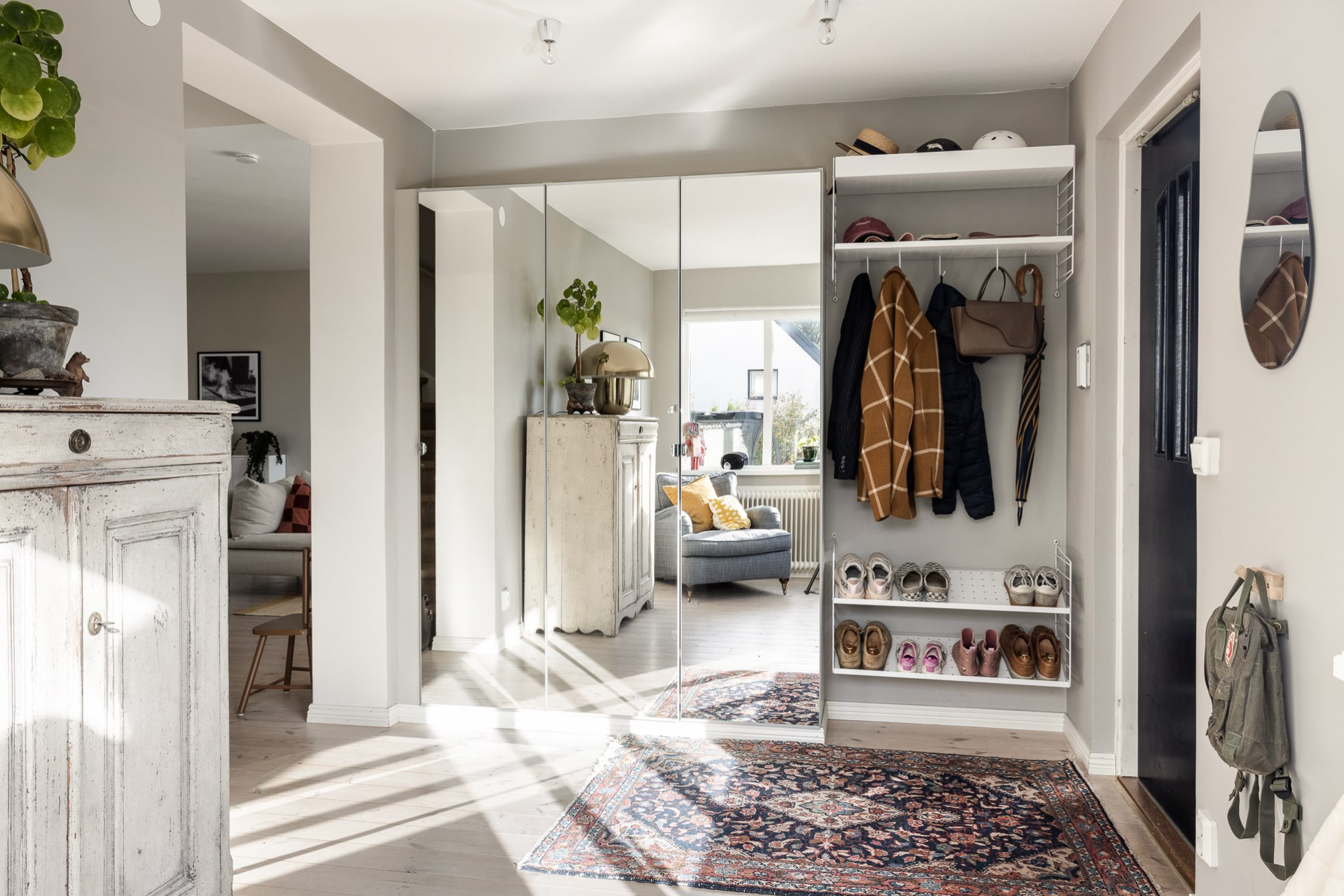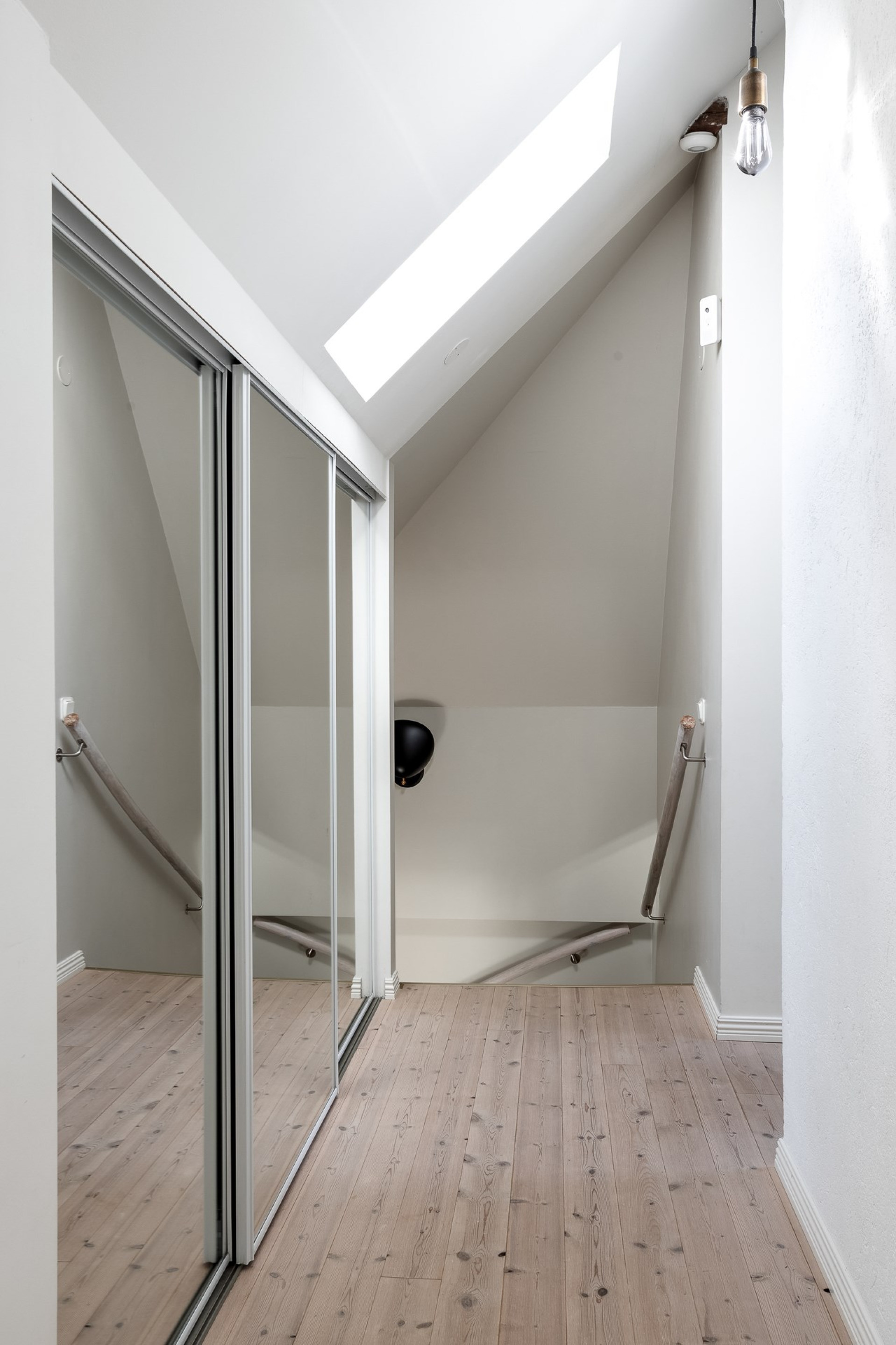 Även i korridoren utanför finns praktisk platsbyggd förvaring i garderober inunder snedtaket.