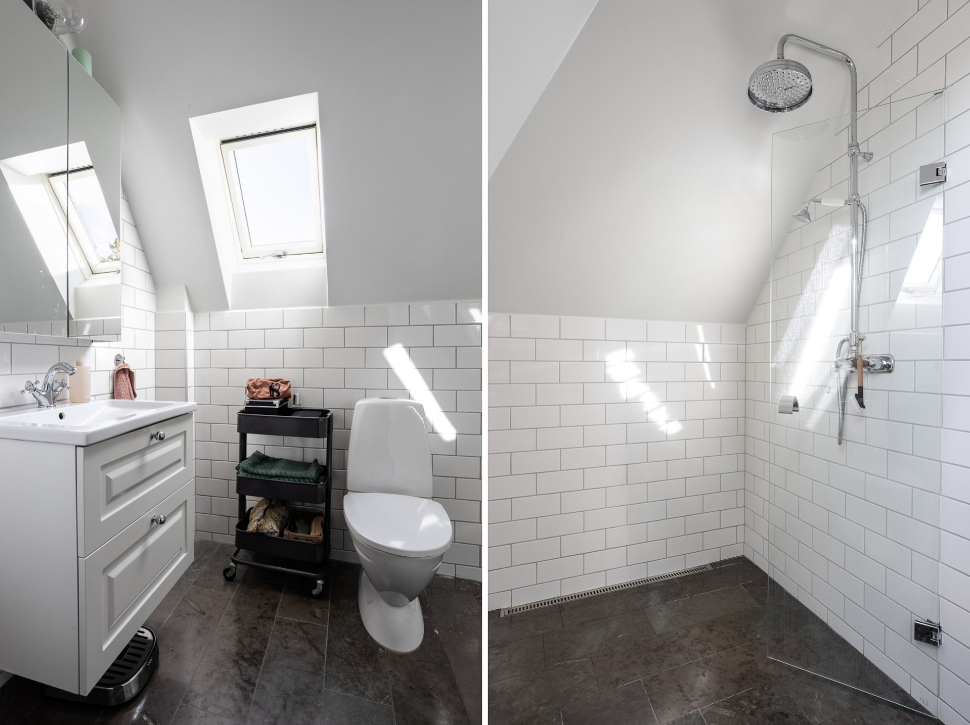 Riktigt snyggt badrum med Ölandssten på golvet och vitt kakel på väggarna. Golvvärme finns för extra komfort och utrustningen i övrigt består av handfat med kommod, dusch med glasväggar och wc.