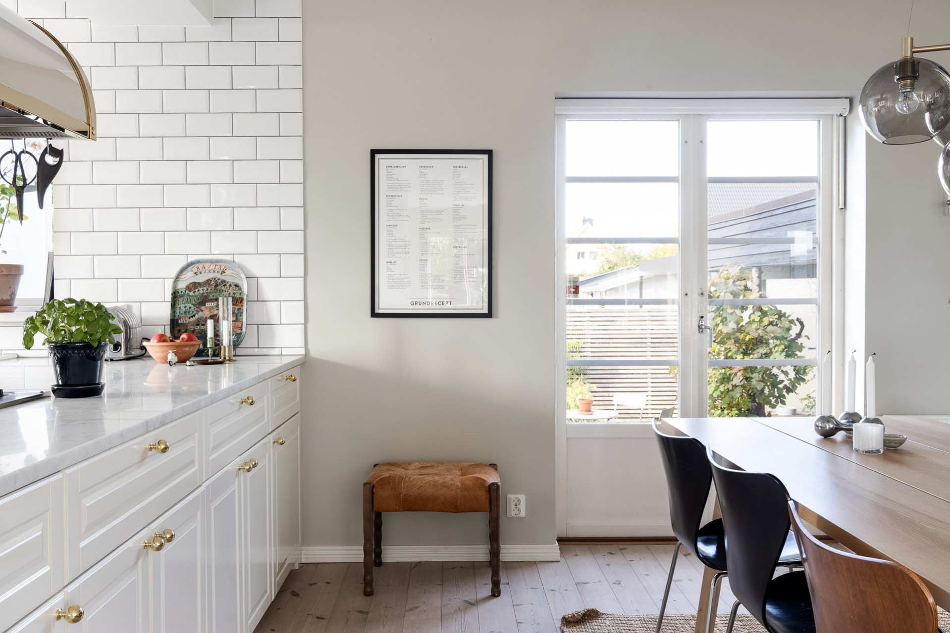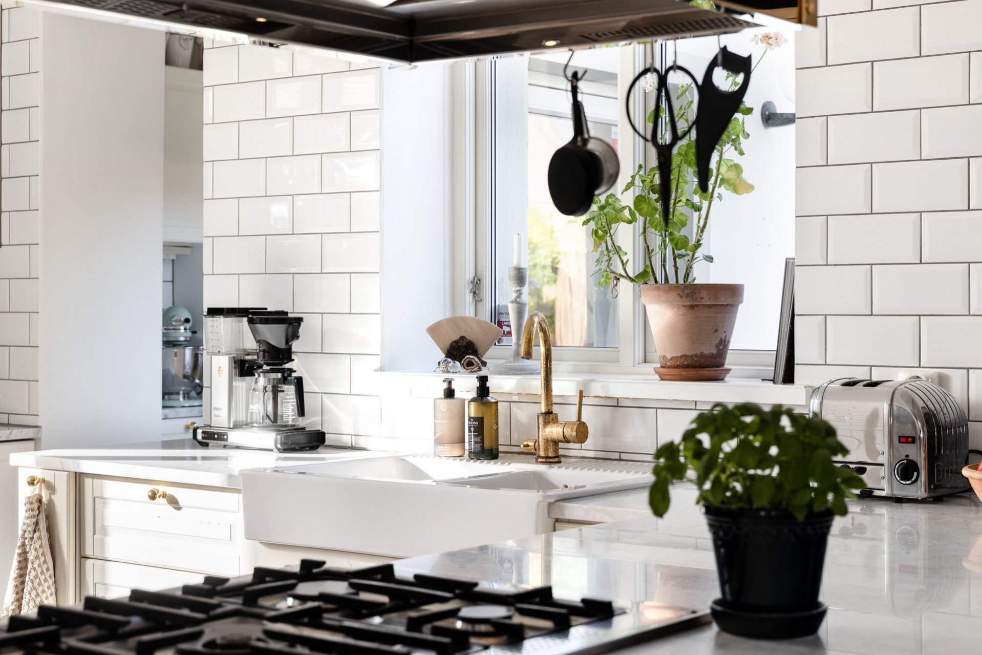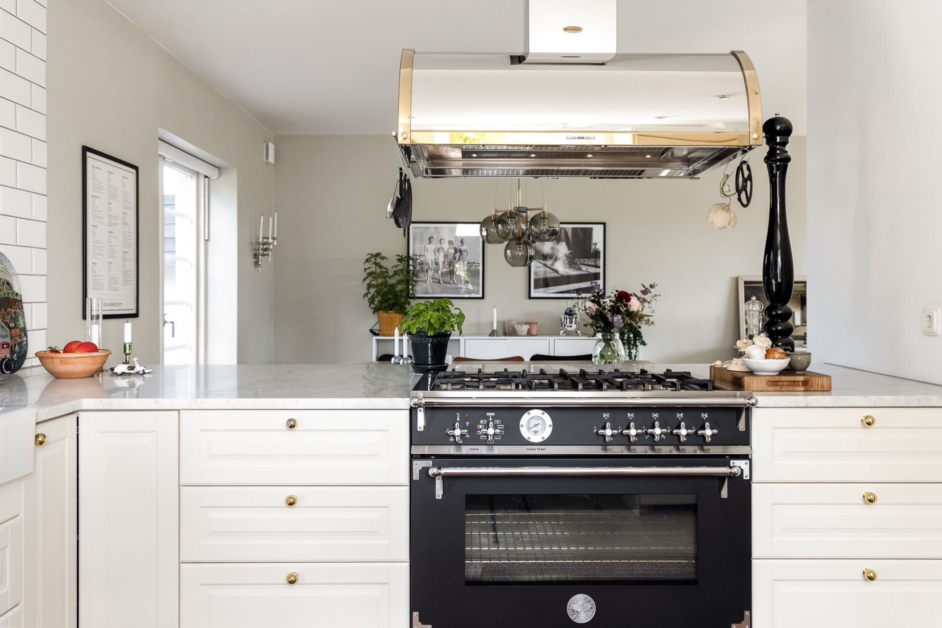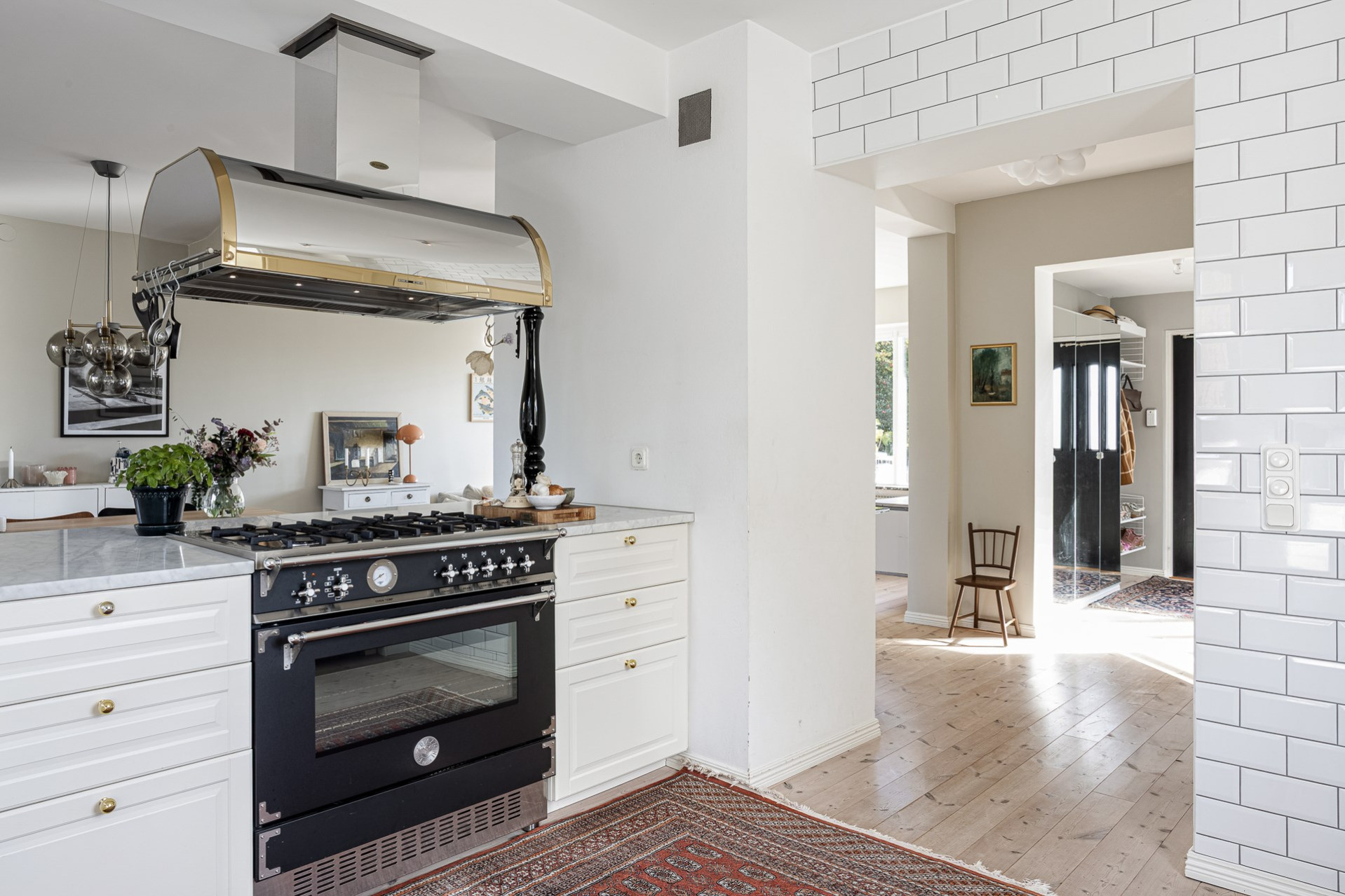 Ett underbart kök med skåpsinredning i vitt, bänkskiva i Carraramarmor, gasspis från Bertazzoni och en specialbyggd spiskåpa från Fjäråskupan. Utöver detta finns även integrerad kyl/frys och integrerad diskmaskin. Den gamla pigentrén erbjuder både extra skåpsutrymme och utgång till trädgården!