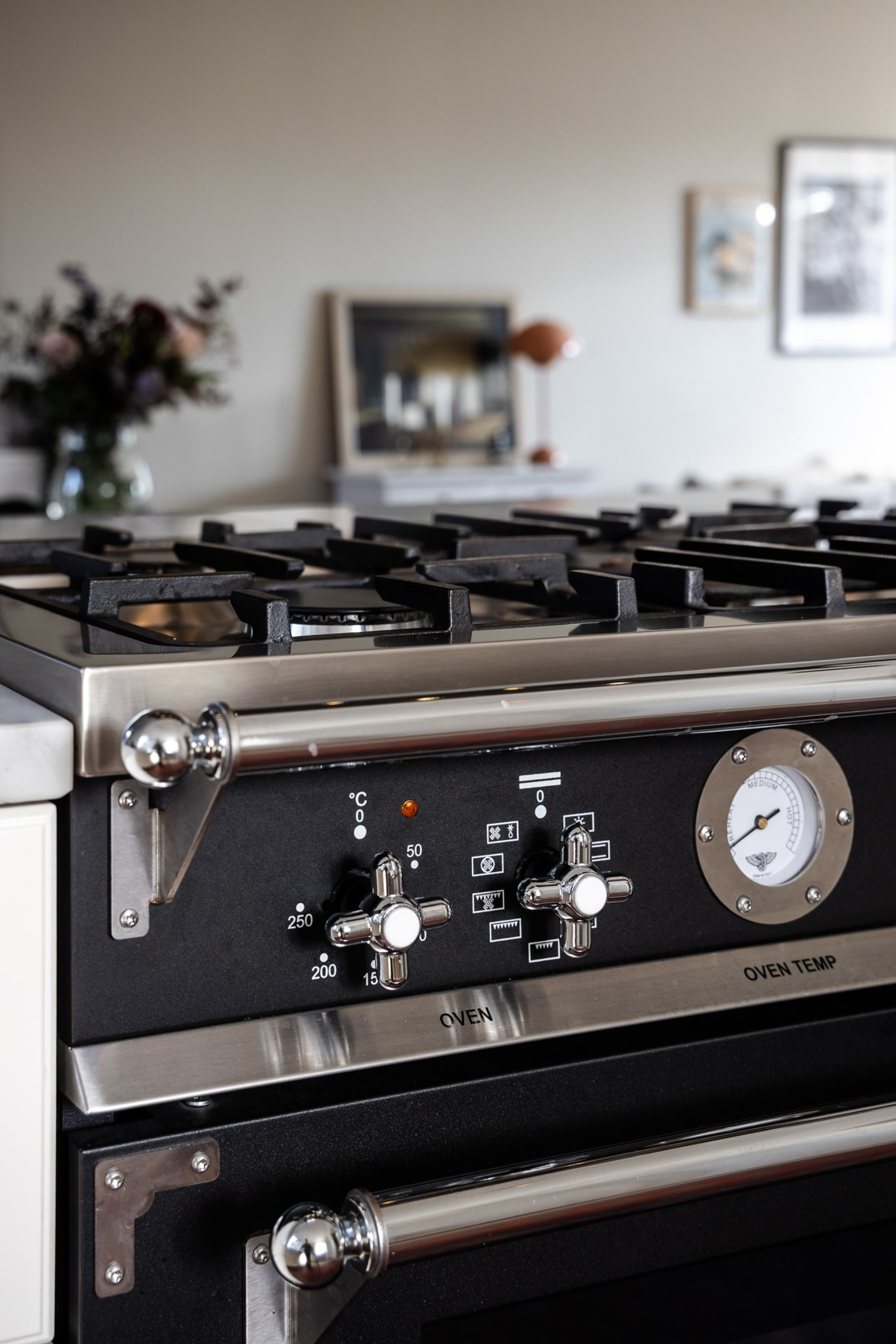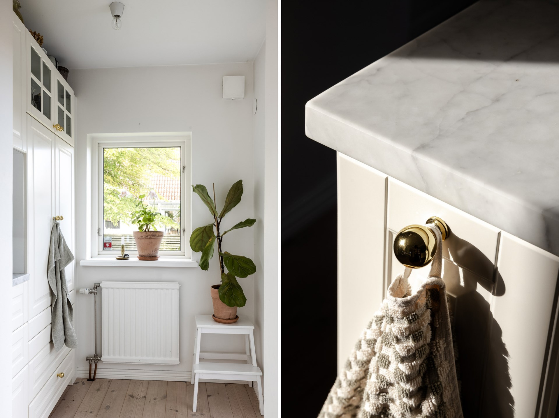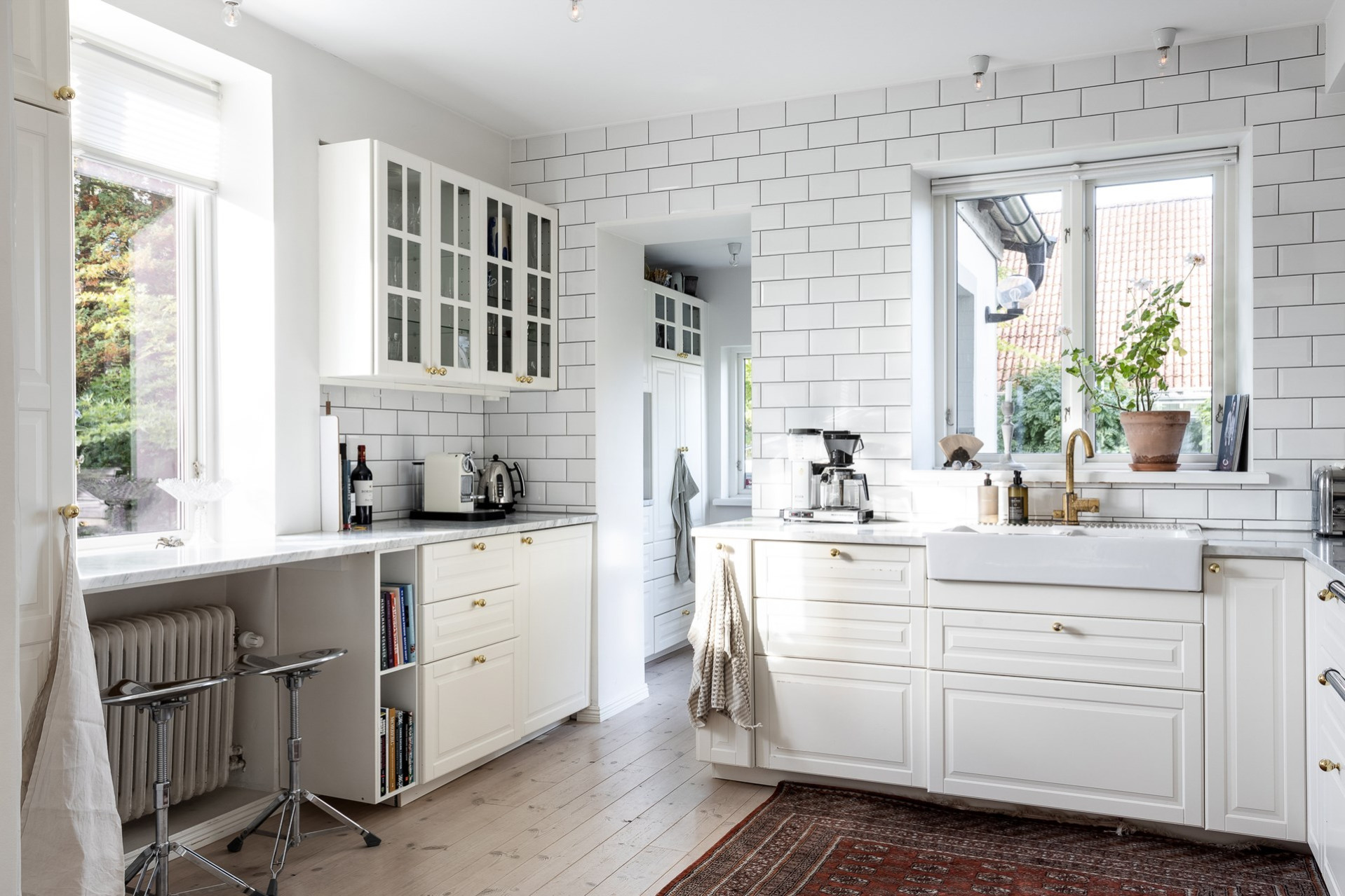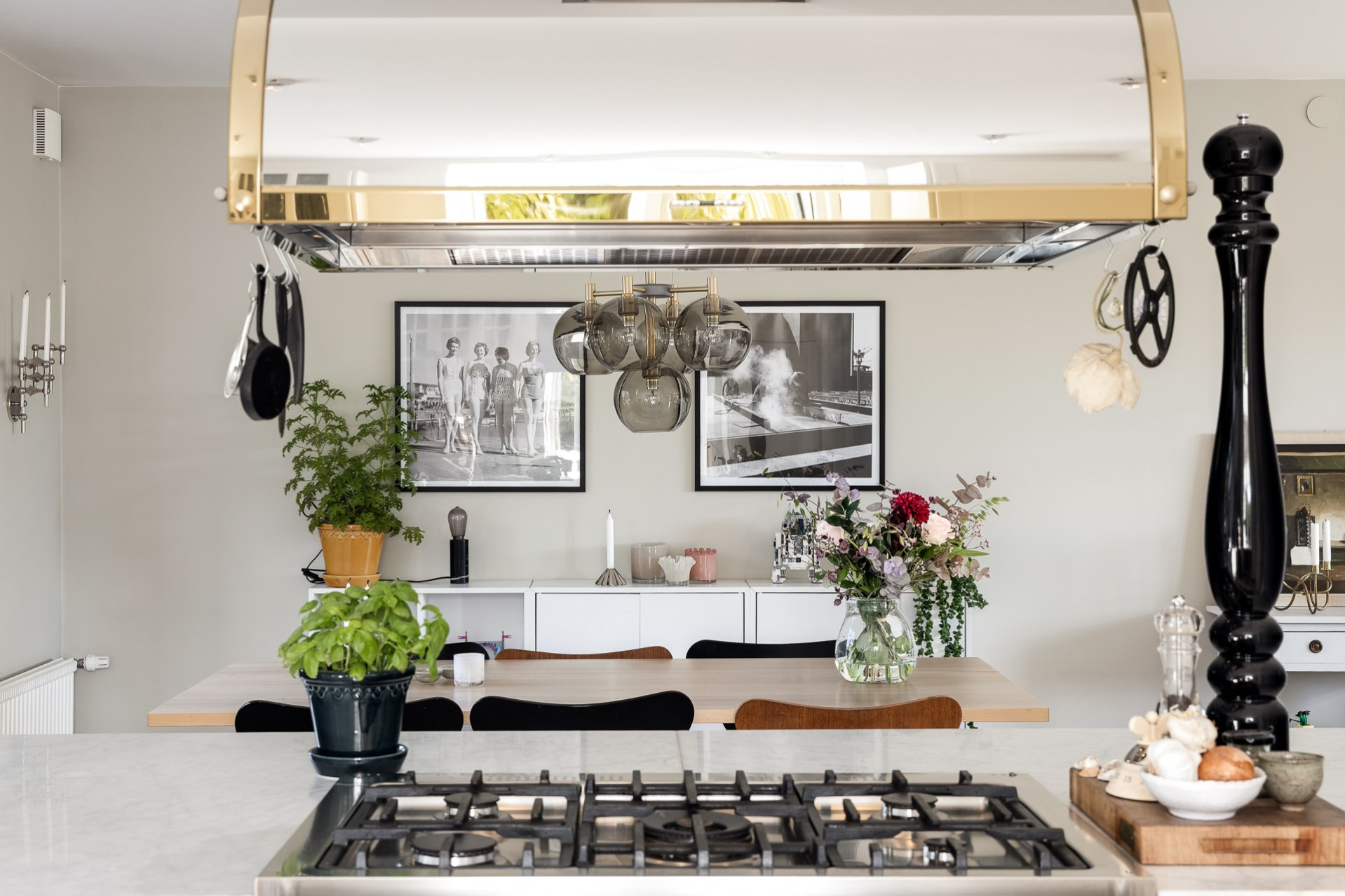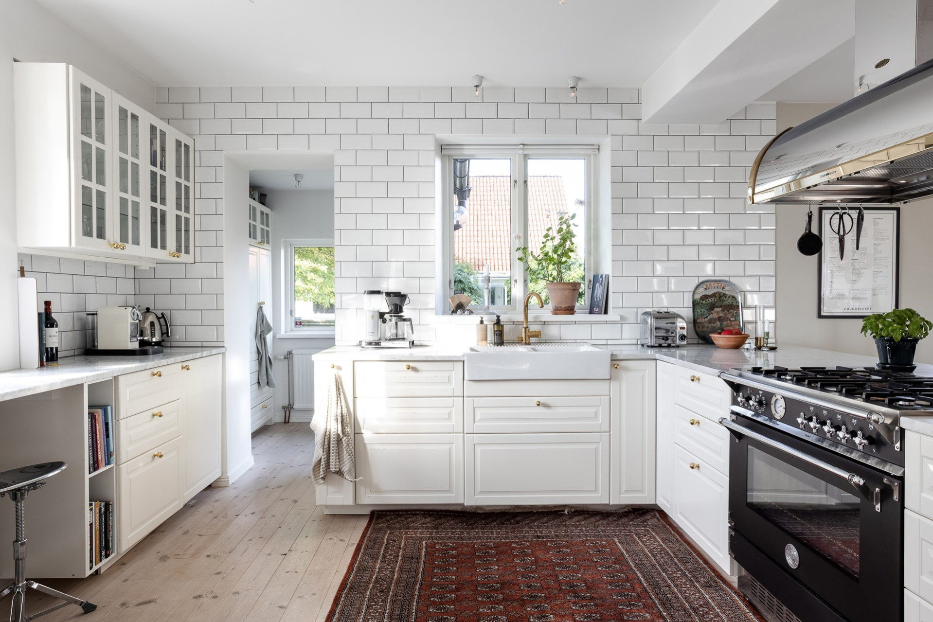 Ett underbart kök med skåpsinredning i vitt, bänkskiva i Carraramarmor, gasspis från Bertazzoni och en specialbyggd spiskåpa från Fjäråskupan. Utöver detta finns även integrerad kyl/frys och integrerad diskmaskin. Den gamla pigentrén erbjuder både extra skåpsutrymme och utgång till trädgården!