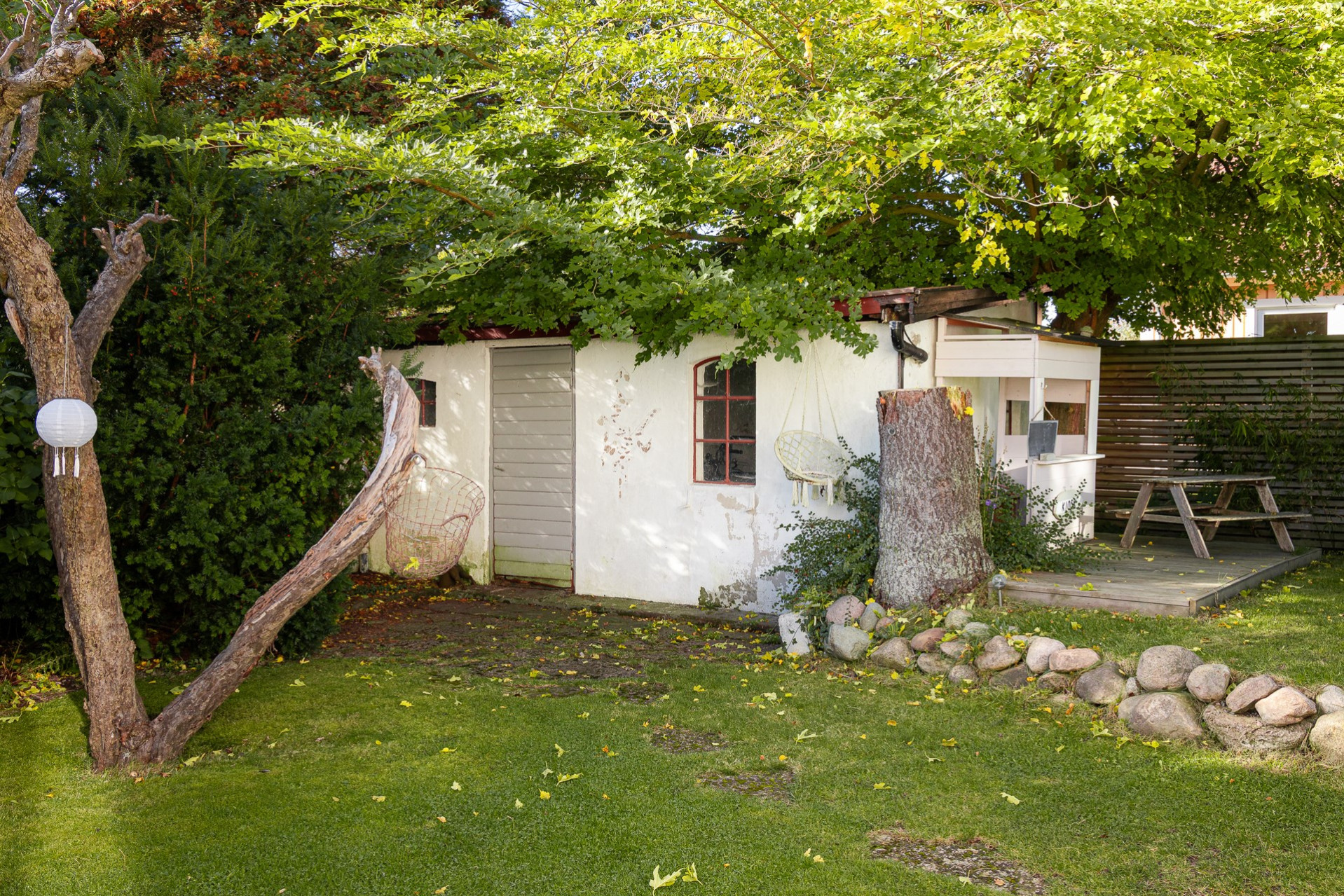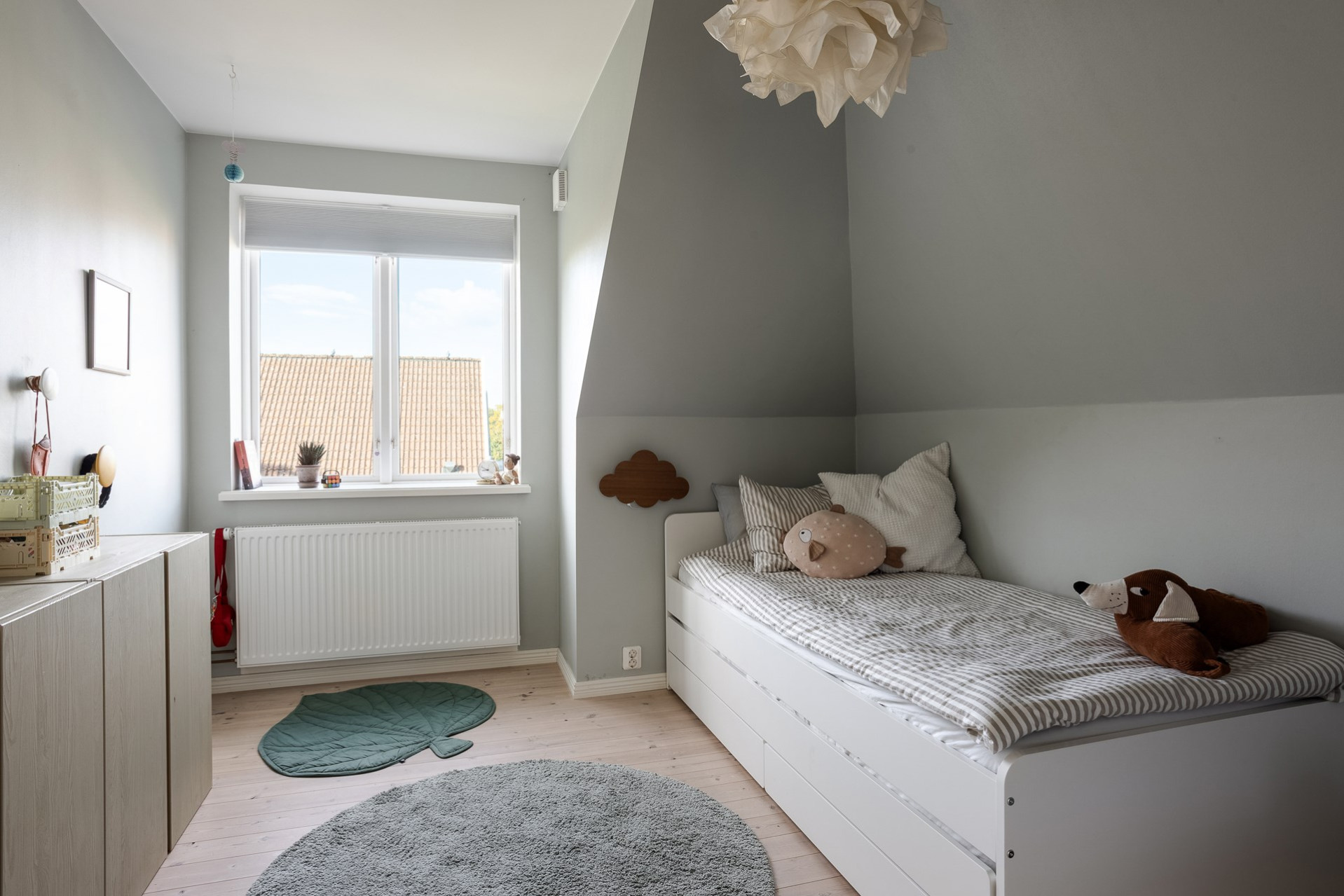 Underbart charmigt med snedtak och frilagda takbjälkar i hela planet. Även på ovanvåningen är golvet genomgående vitlaserad furu och ytan är fördelad mellan två bra sovrum, det ena med fönster åt entrésidan och det andra med fönster åt trädgården. Mellan de båda rummen finns en praktisk klädkammare.
