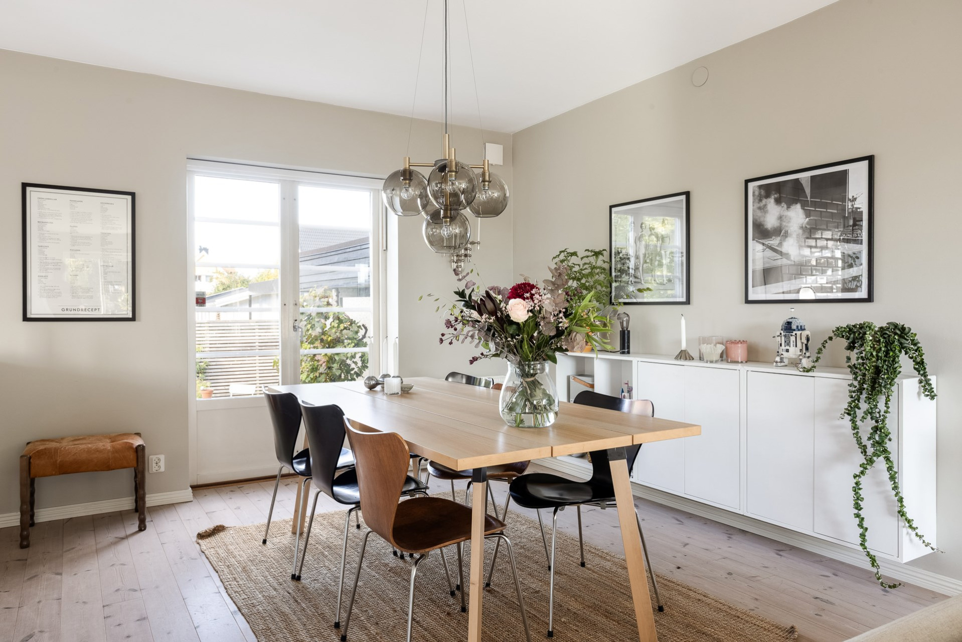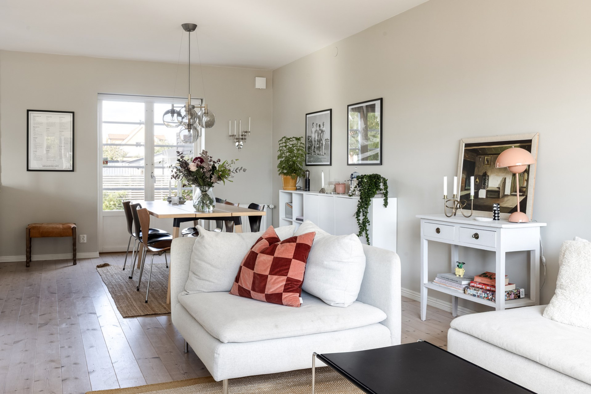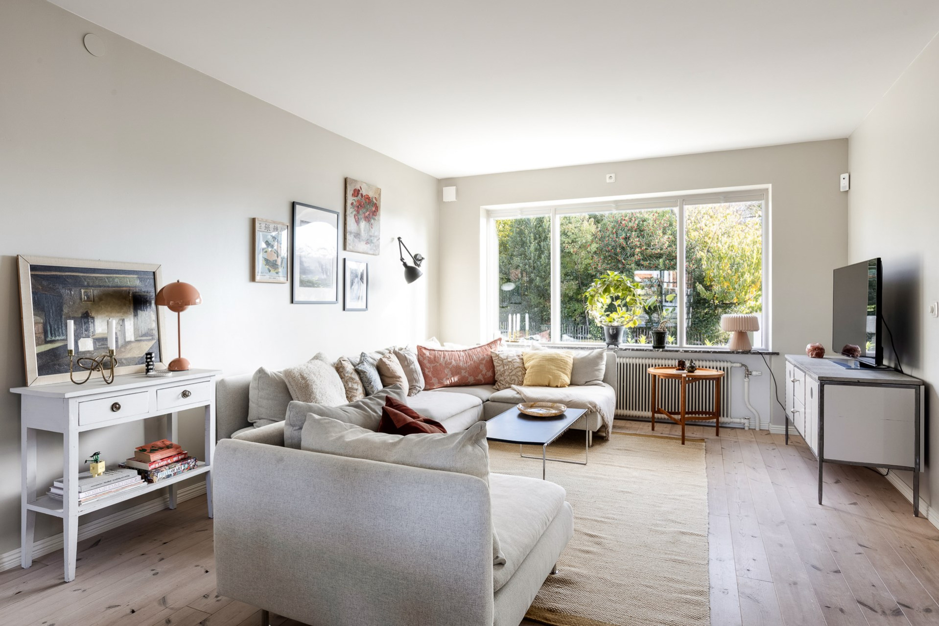 Härligt öppet och ljust rum med en inbjudande soffhörna samt stor matplatsdel med plast för många! Från matplatsen finns utgång till trädgård och uteplats via dubbel altandörr som nästan suddar ut gränsen mellan inne och ute under årets varma månader.