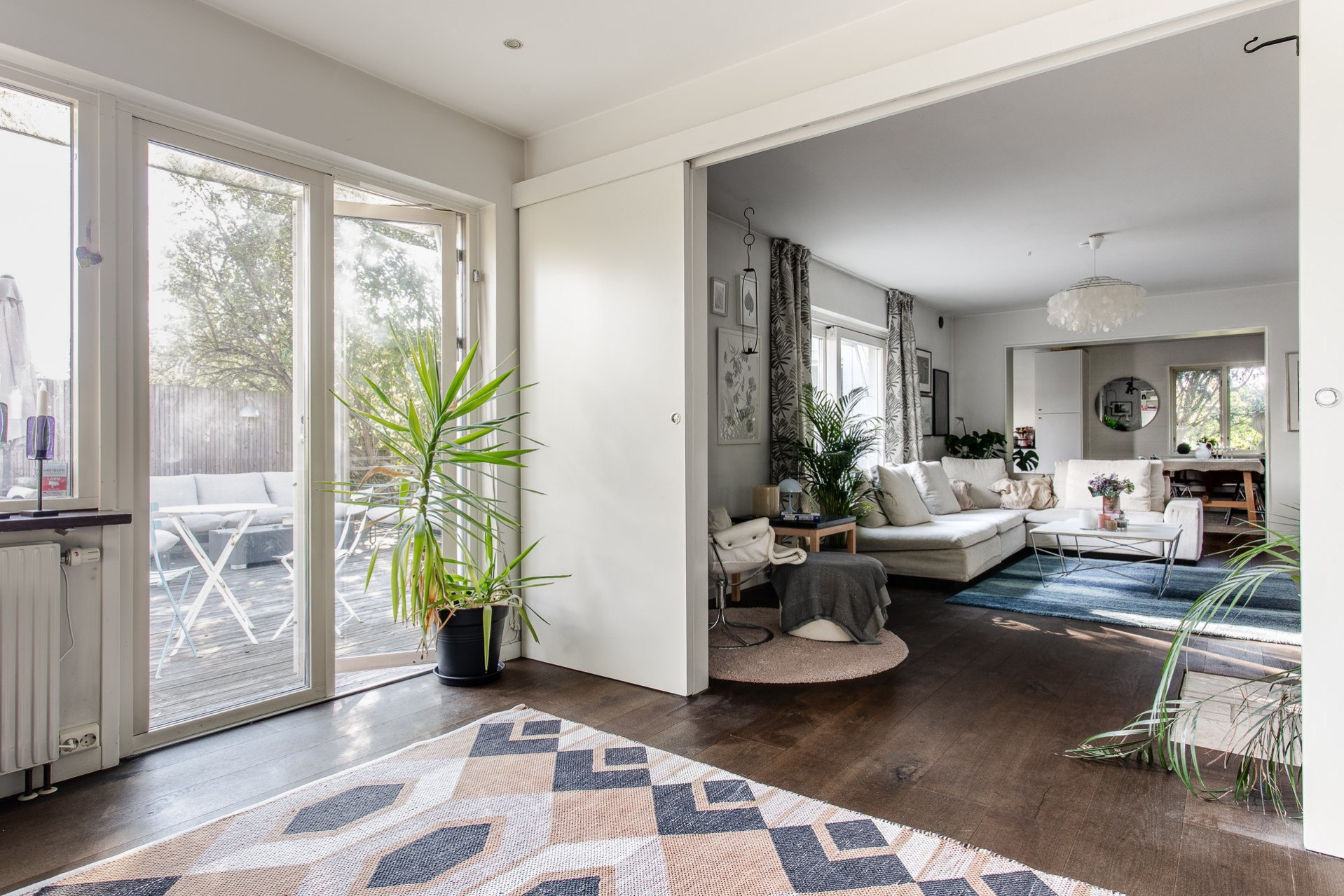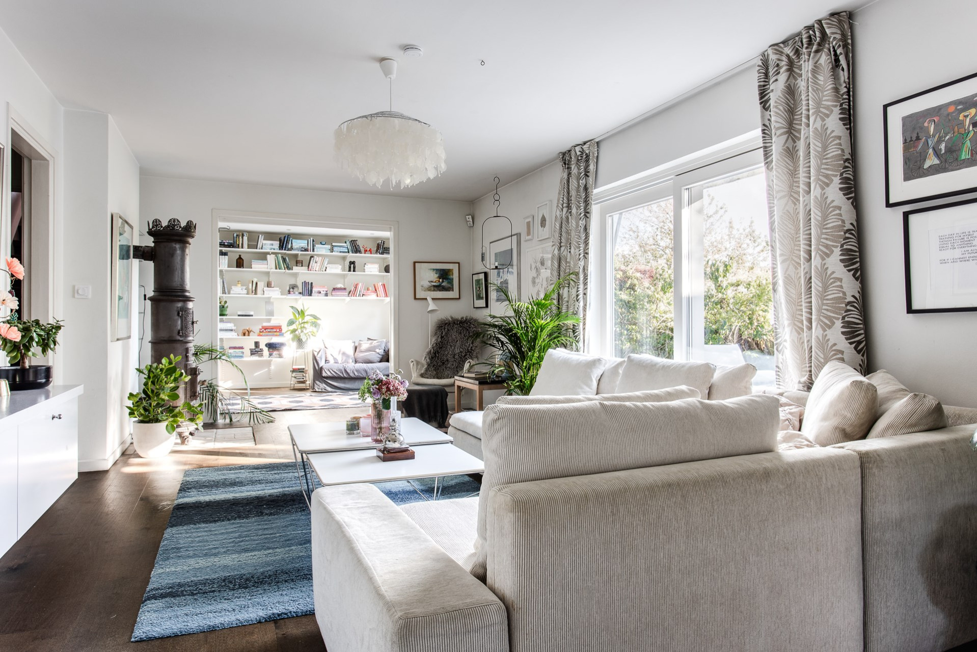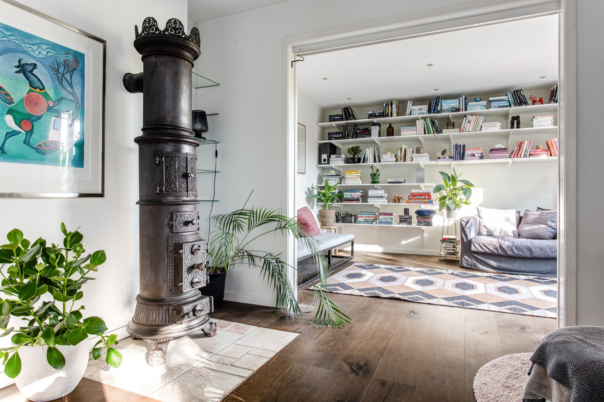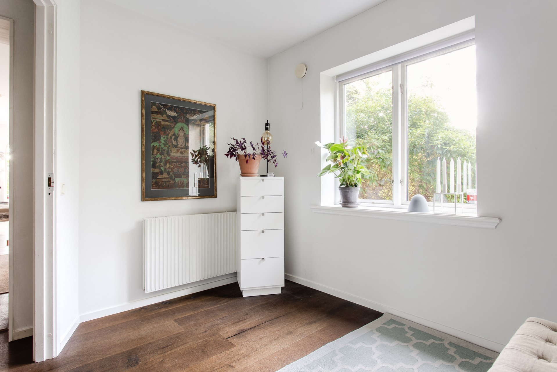Härligt rum med plats för två olik sittgrupper om man vill. Skjutdörrar ut till uteplatsen samt en maffig kamin i gjutjärn förhöjer mysfaktorn. Samma snygga ekgolv och vitmålade väggar.