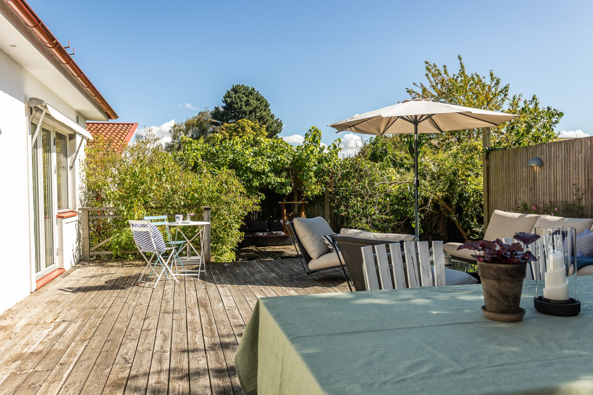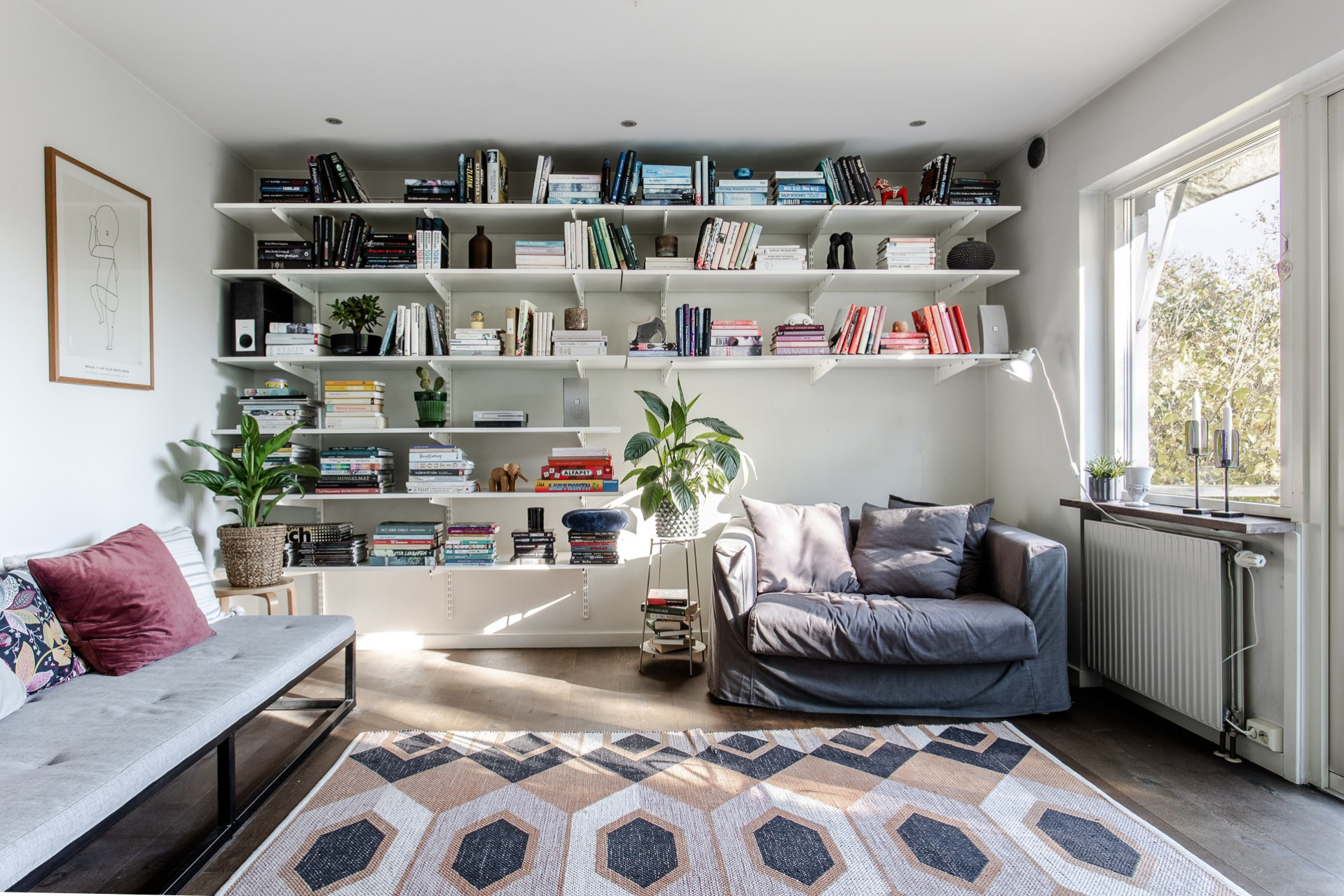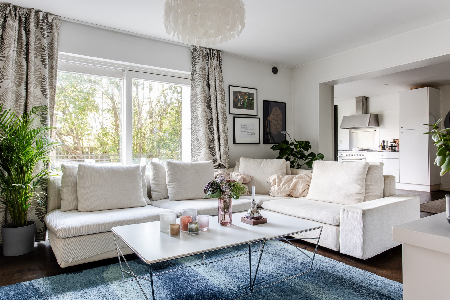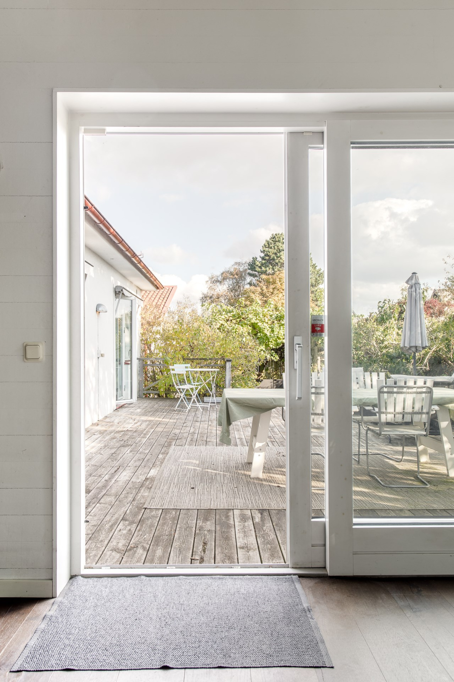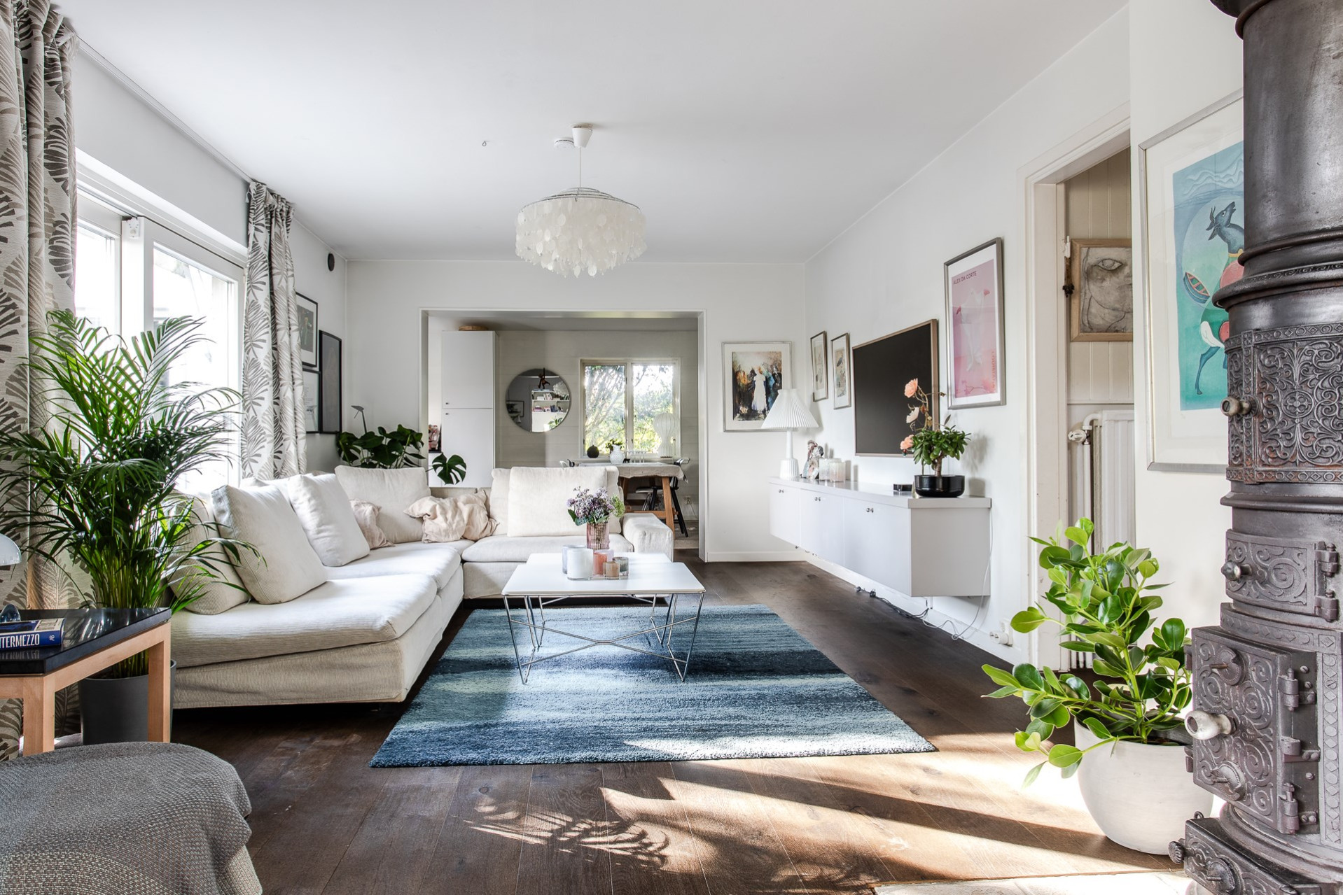Härligt rum med plats för två olik sittgrupper om man vill. Skjutdörrar ut till uteplatsen samt en maffig kamin i gjutjärn förhöjer mysfaktorn. Samma snygga ekgolv och vitmålade väggar.
