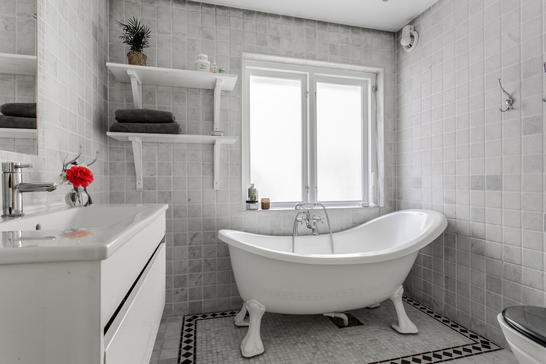 Vackert och helkaklat badrum från 2009 med klinker och kakel i tidlös tumlad carraramarmor och mosaik. Väl tilltaget handfat med underskåp, stor spegel, klassiskt badkar och vägghängd toalett. Spotlights i taket och golvvärme.