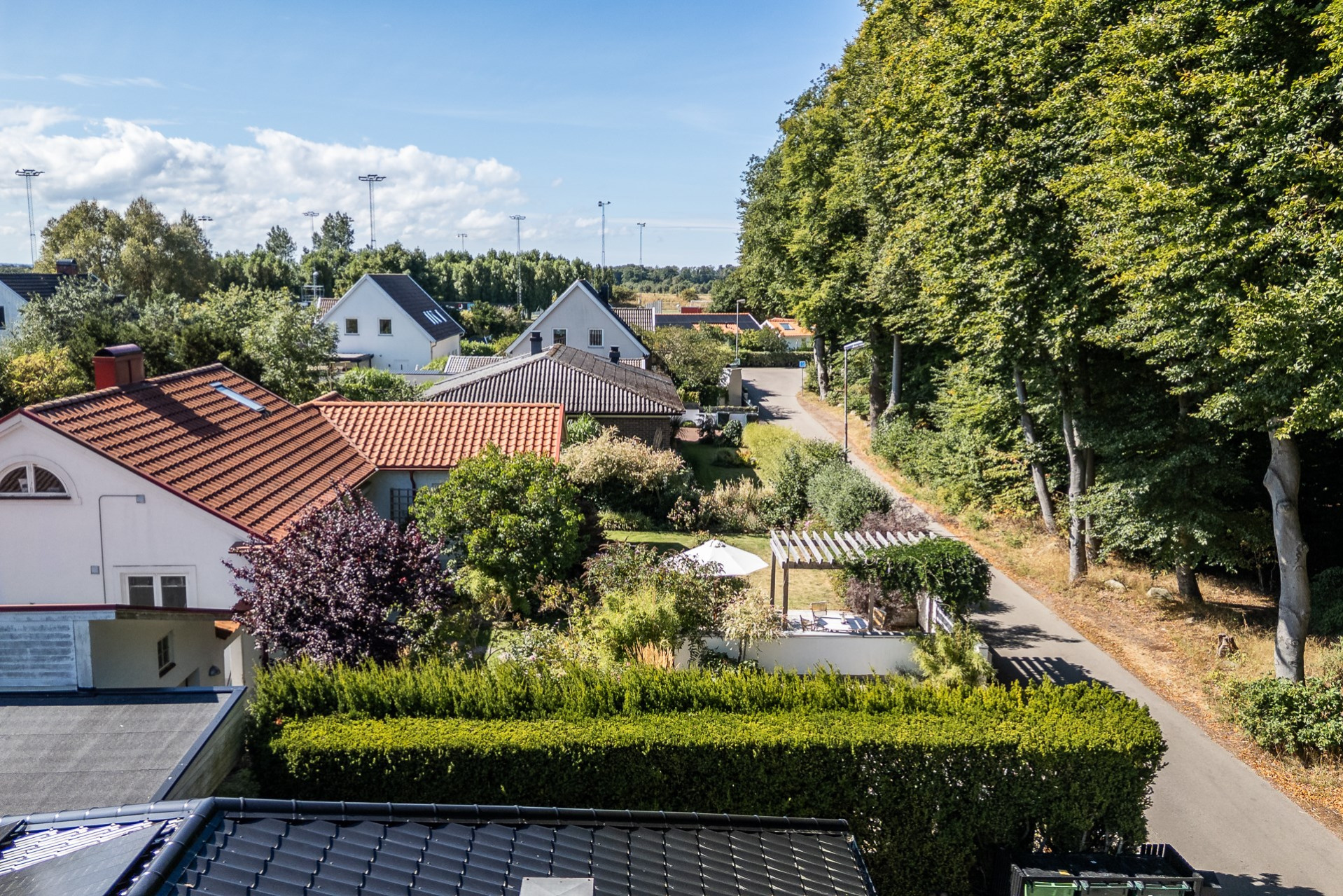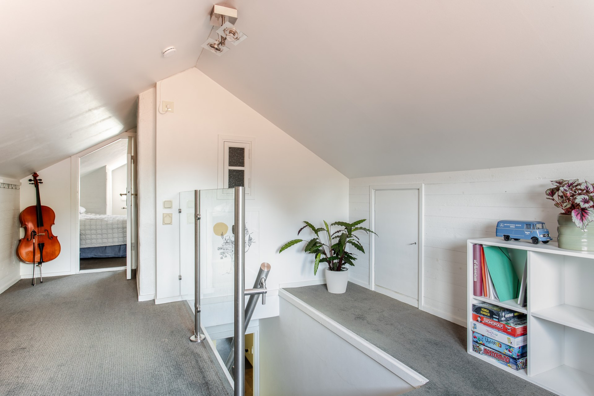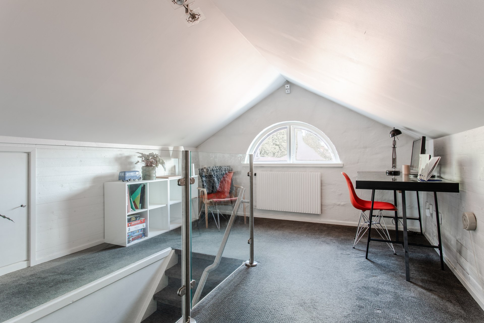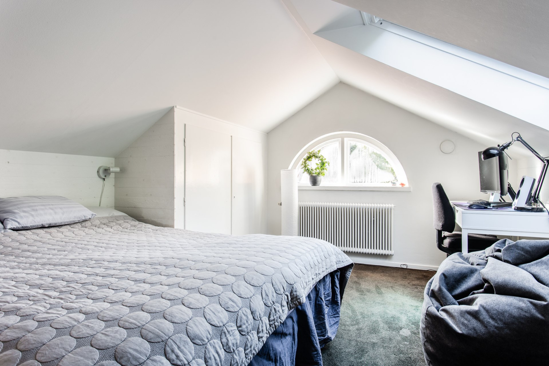 En trappa upp, perfekt tonårsavdelning, nås en yta som kan nyttjas som mindre allrum/kontor. Här är takhöjden 2,12m i centrum med sluttande tak. Heltäckningsmatta.