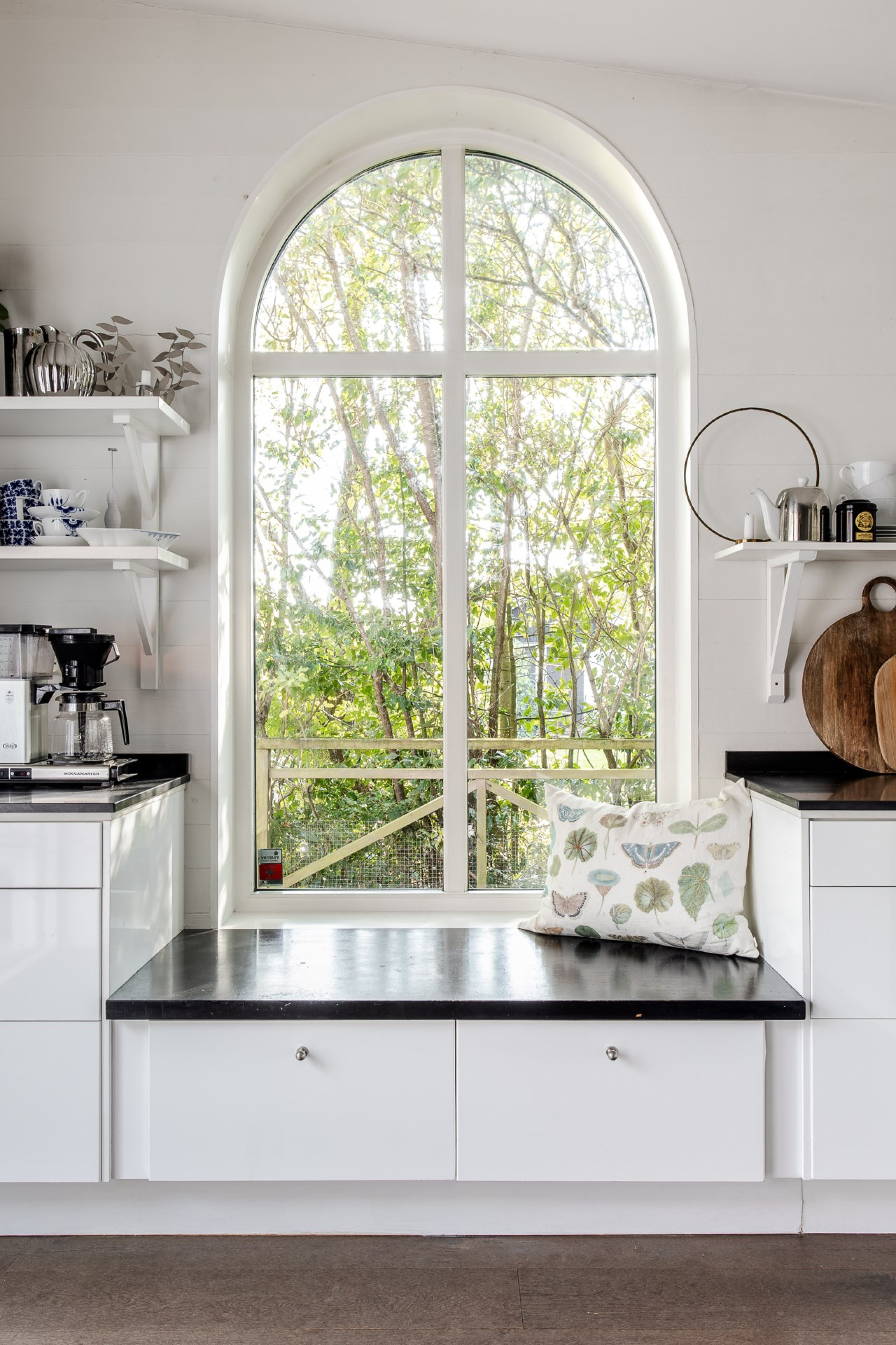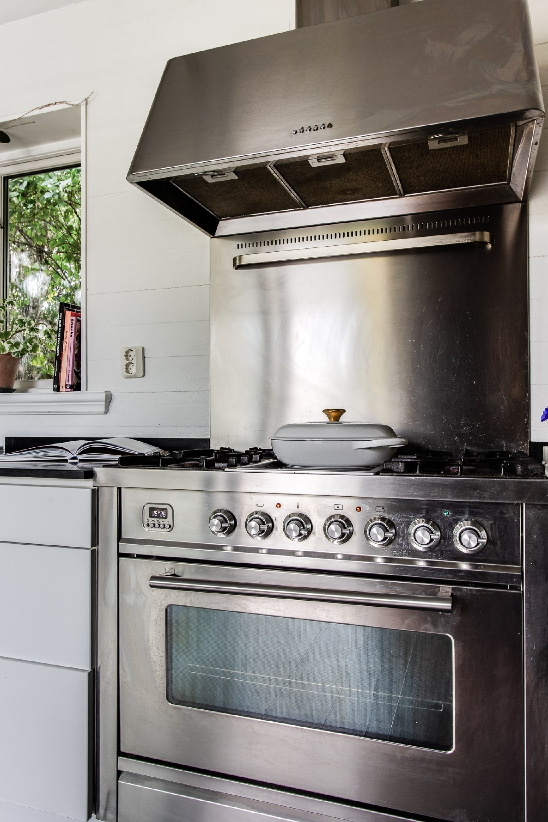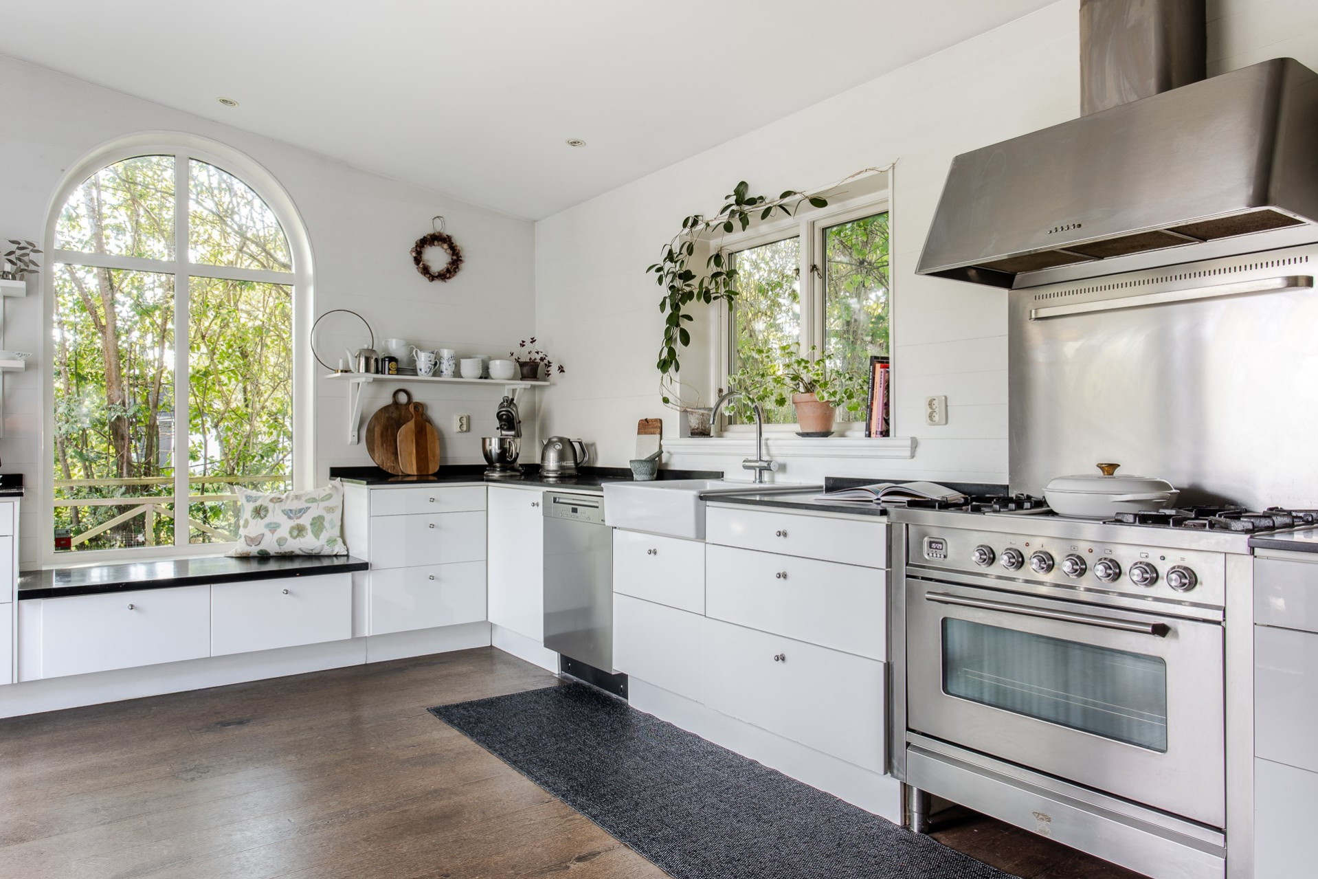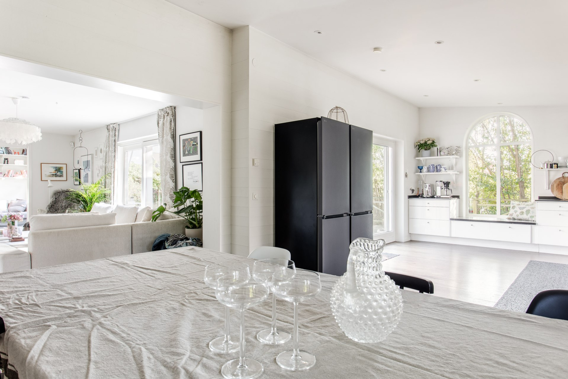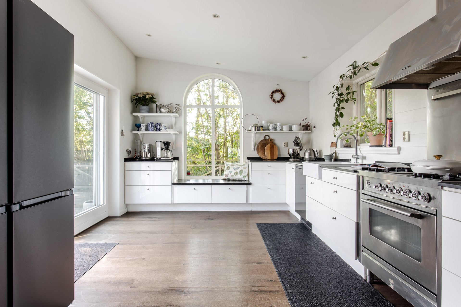 Ett helt underbart rum med otroligt vackert fönster med rundad topp samt skjutdörrar ut till uteplatsen. Väl tilltagna arbetsytor samt mysig sittbänk under det vackra fönstret. Plats för riktigt långbord om man om man planerar stora middagsbjudningar. Bänkskiva i smal svart granit, vita skåpsluckor, rejäl vask i porslin samt lyxig rostfri gasspis från Ilve med tillhörande fläkt ovan. Hel kyl och frys samt diskmaskin finns också. Snyggt Ekgolv som flyter in i vardagsrumsdelen samt liggande vitmålad träpanel på väggen.