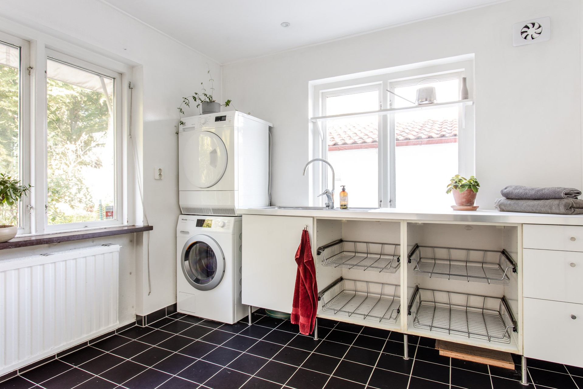 Totalrenoverad 2009 med grått klinkergolv (golvvärme), spotlights, extremt mycket förvaring samt arbetsbänk med vask. Dubbla fönster ger härligt ljusinsläpp. Ny tvättmaskin 2019, torktumlare. Trappa ner i källaren.
