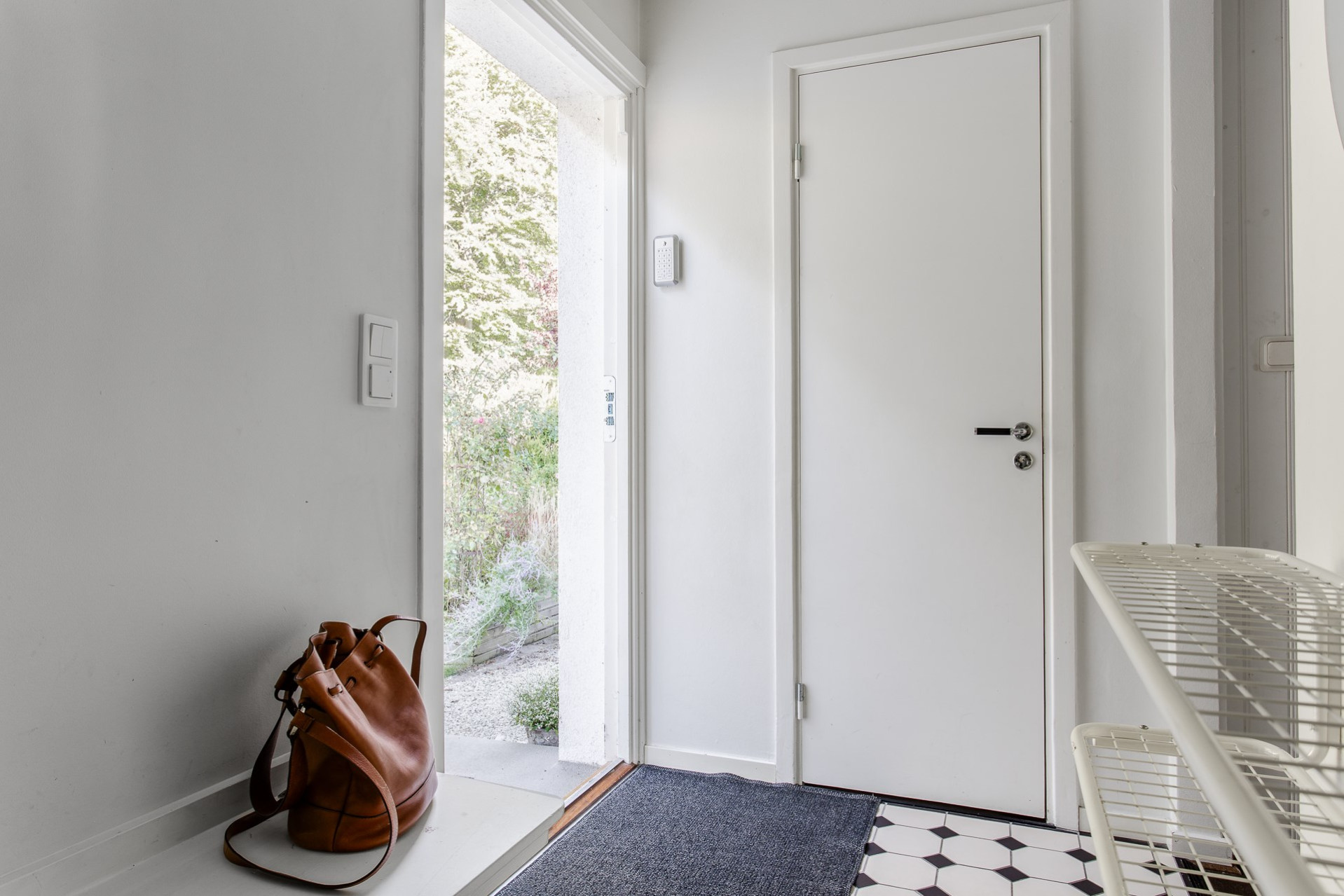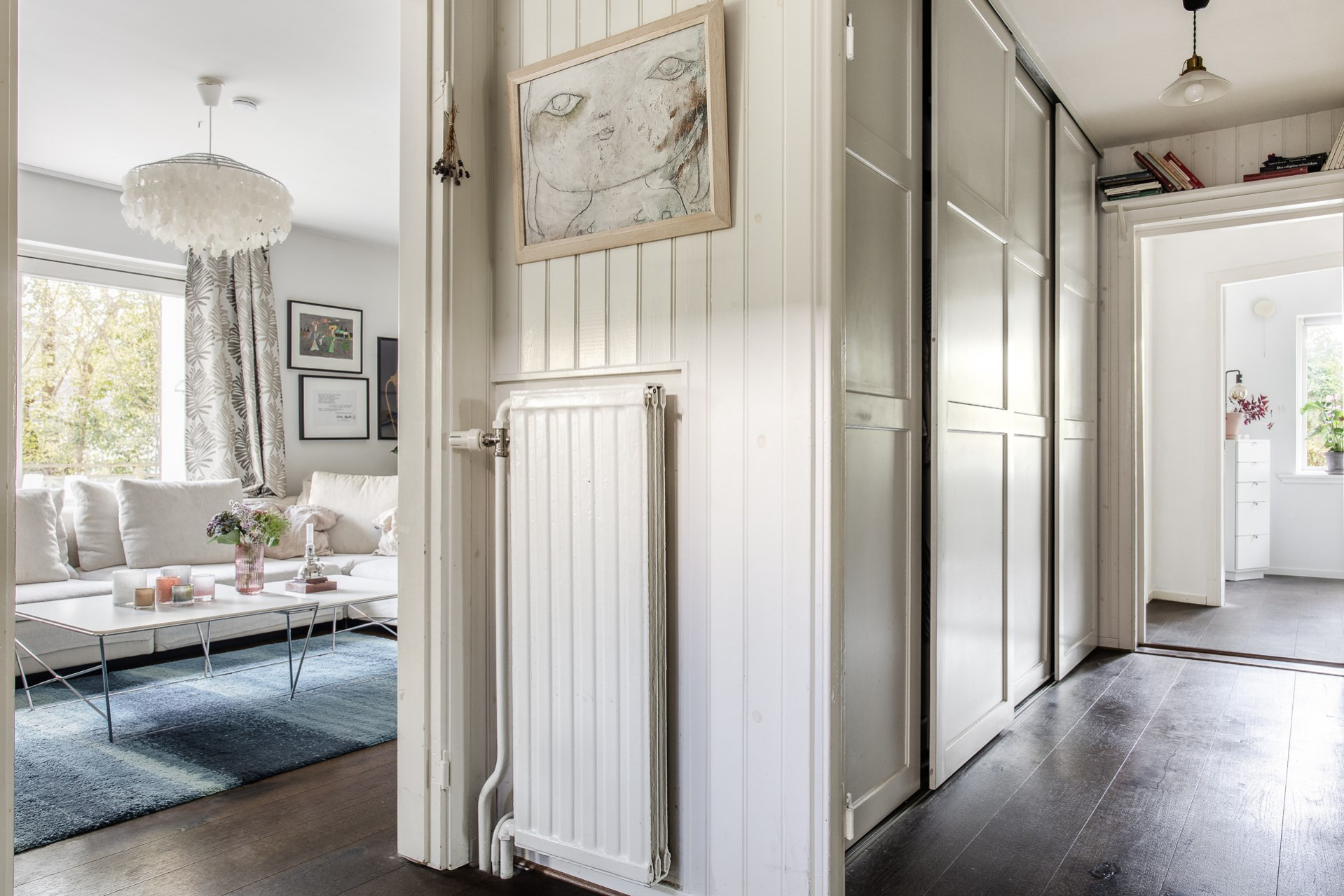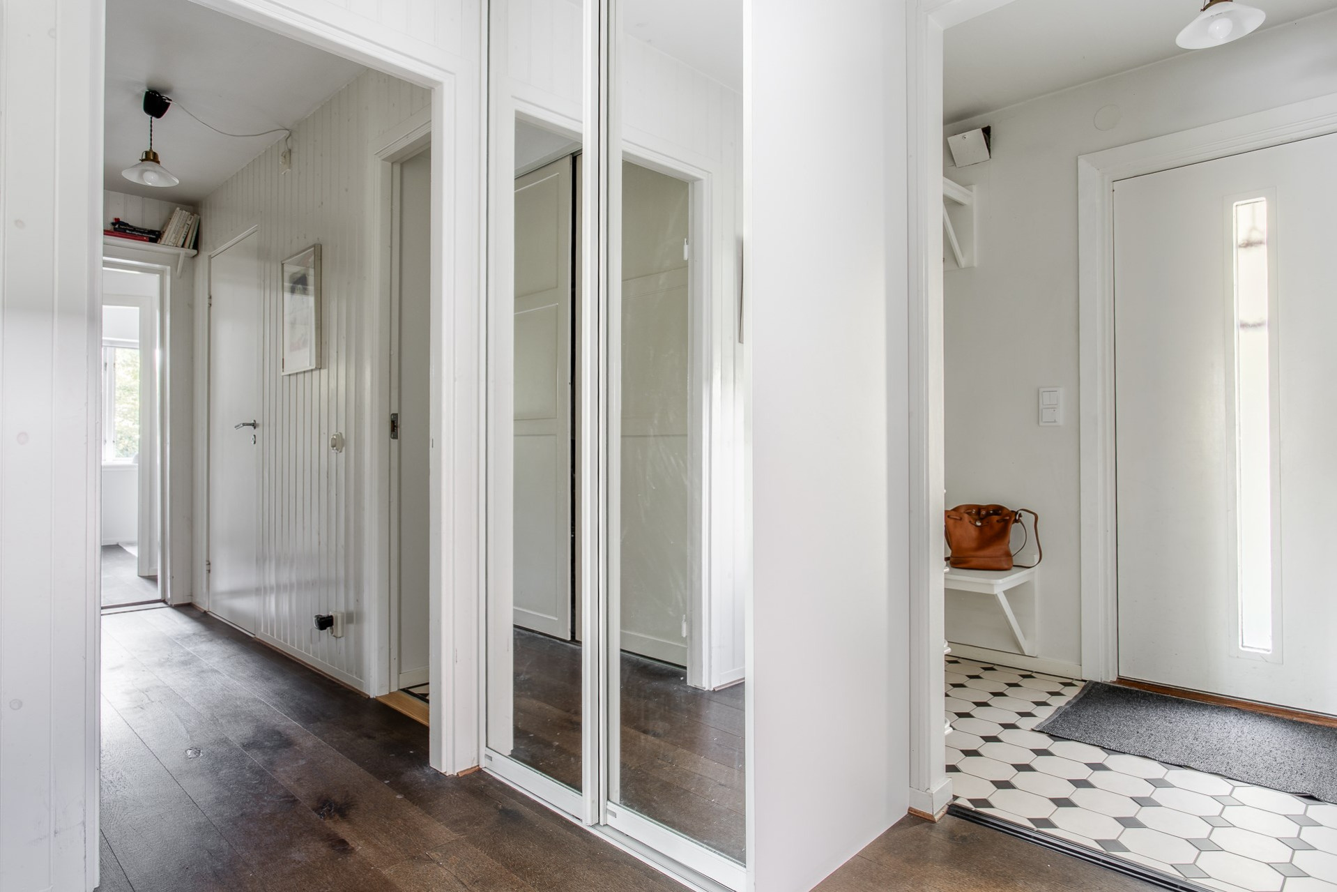 Nyrenoverad 2017 med nytt snyggt klinkergolv (golvvärme) samt gott om plats för avhängning. Hallen fortsätter in med massvis av platsbyggd förvaring via skjutdörrsgarderober.