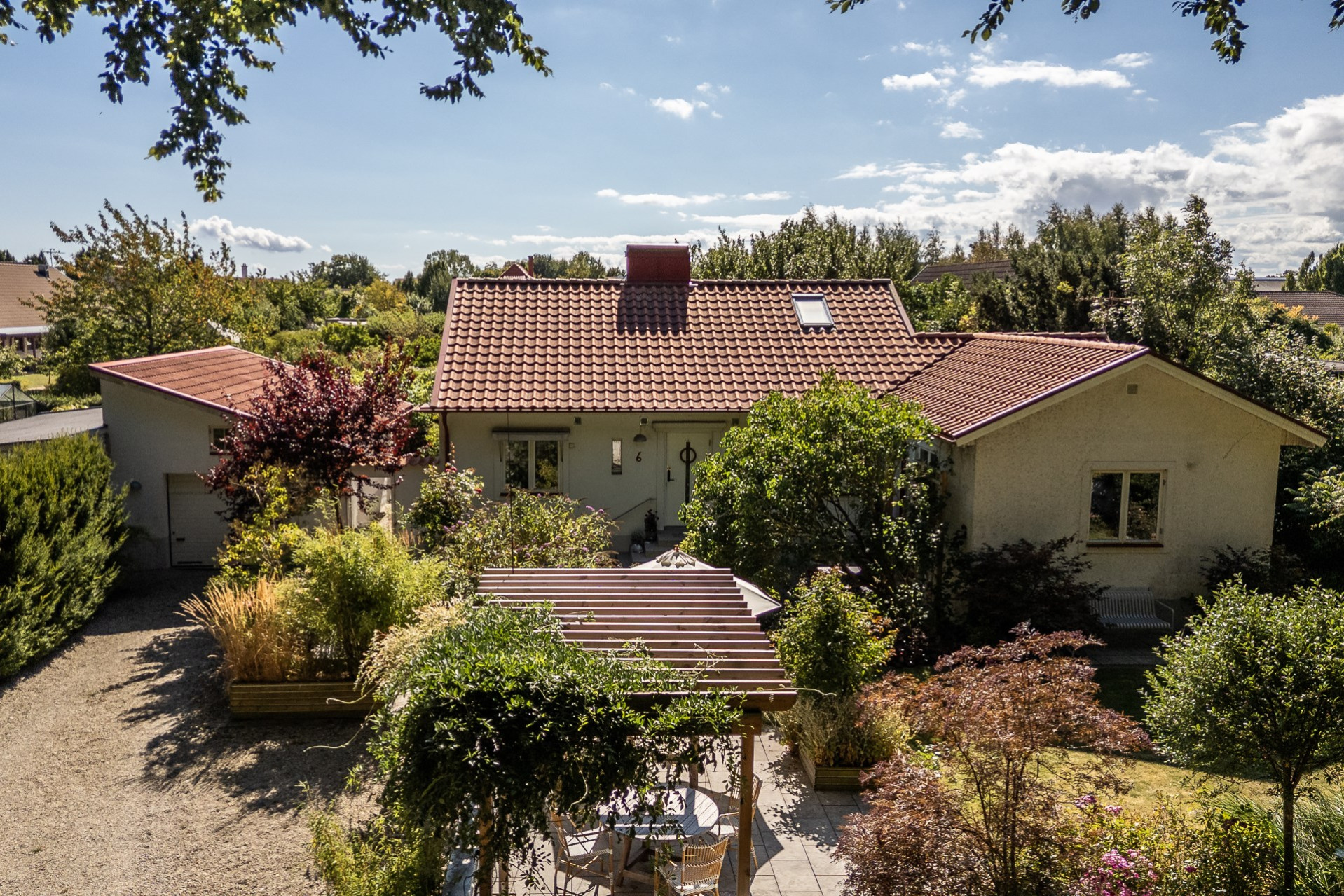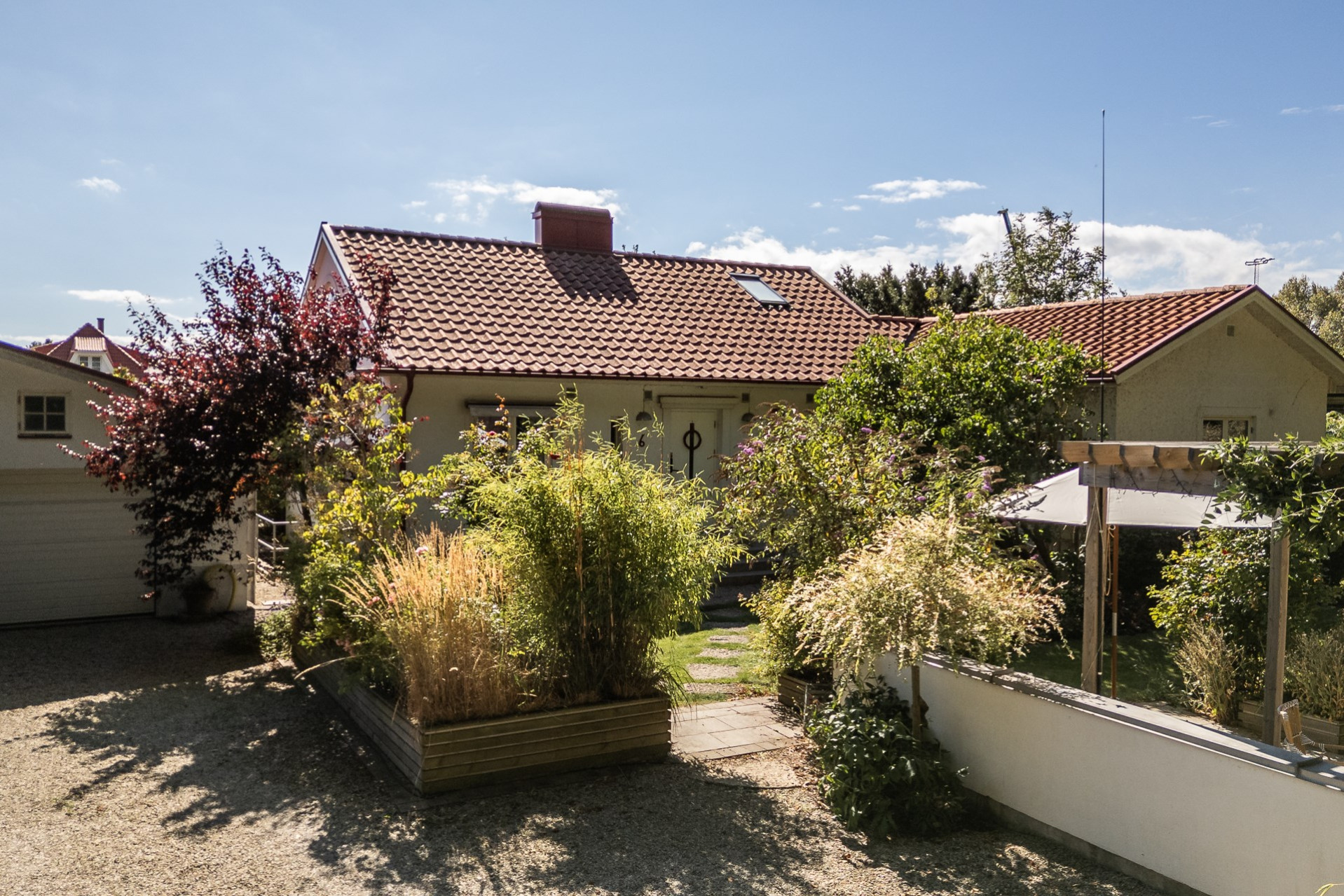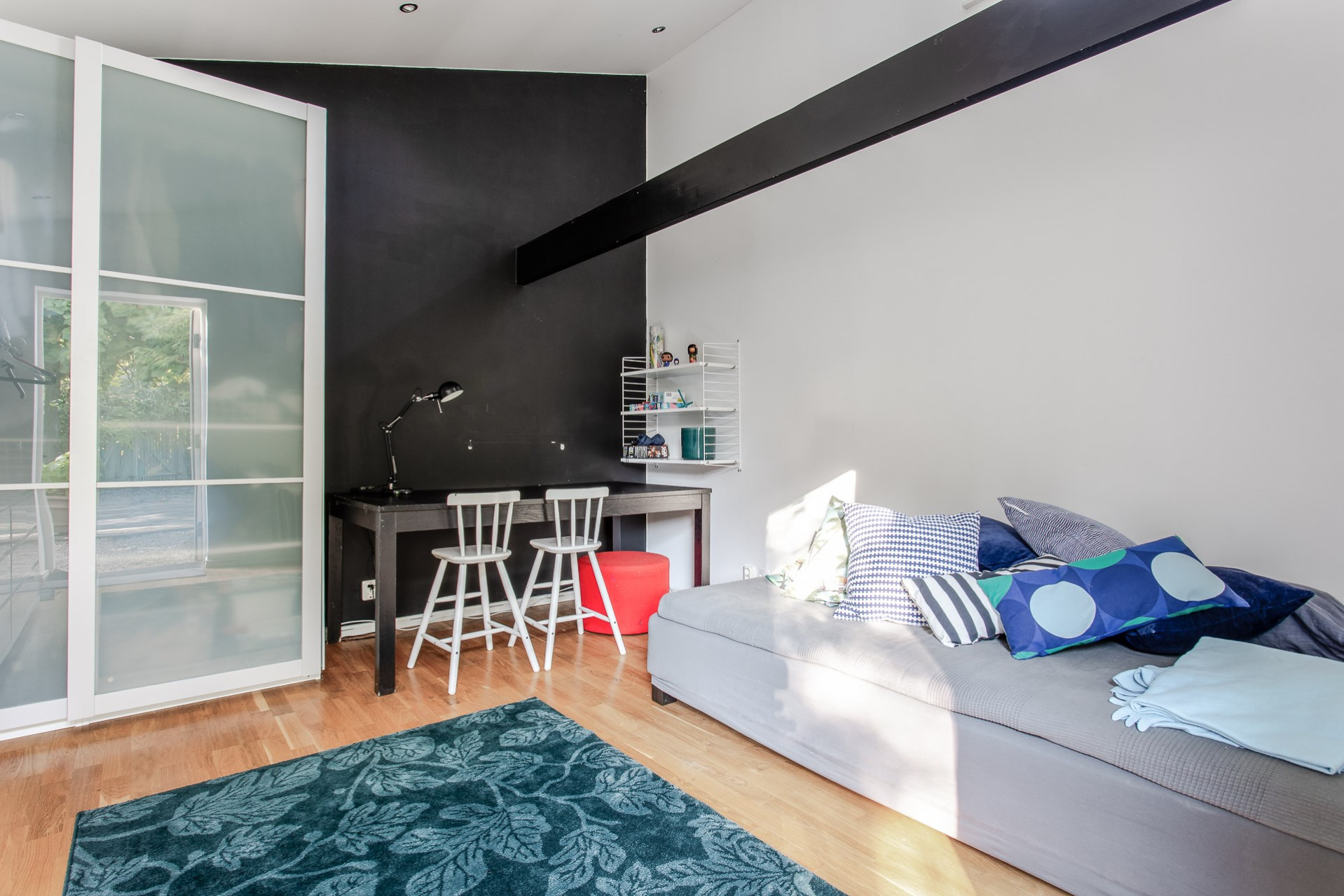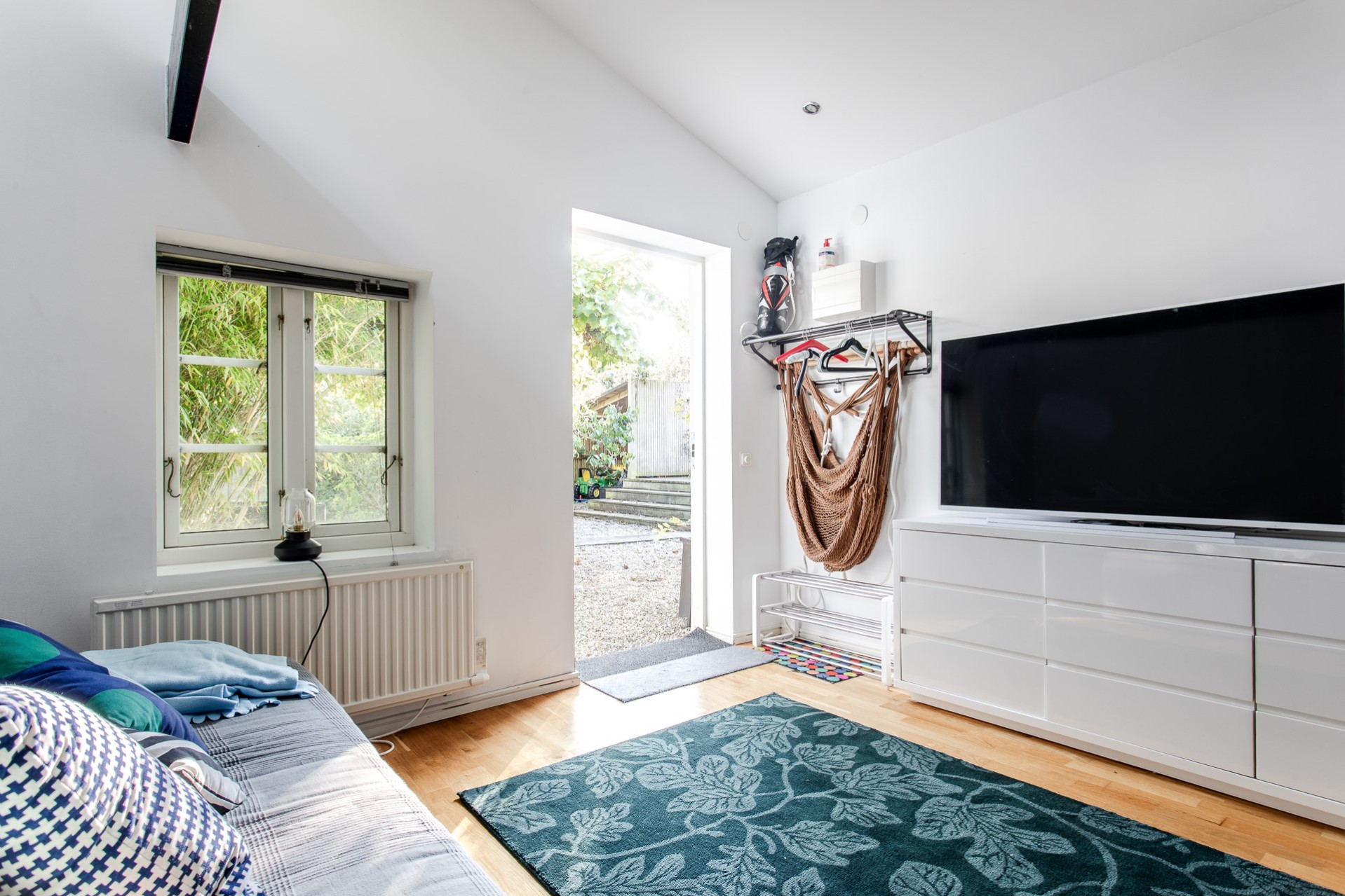 Från trädgården, och bakom garaget, finns ett isolerat och uppvärmt rum med egen entré samt fönster. Öppet till nock, parkettgolv. Perfekt yta för kontor, ateljé eller tonårsrum.