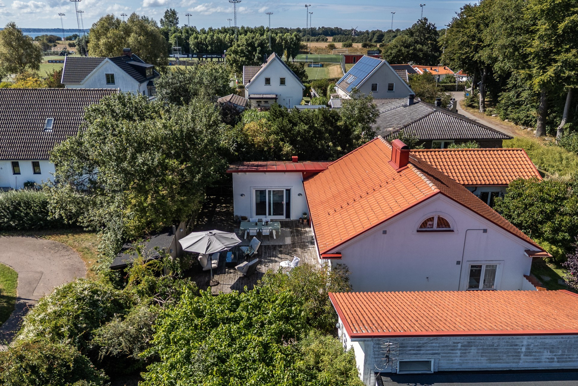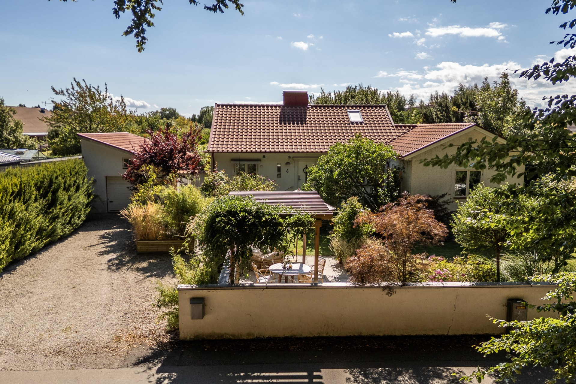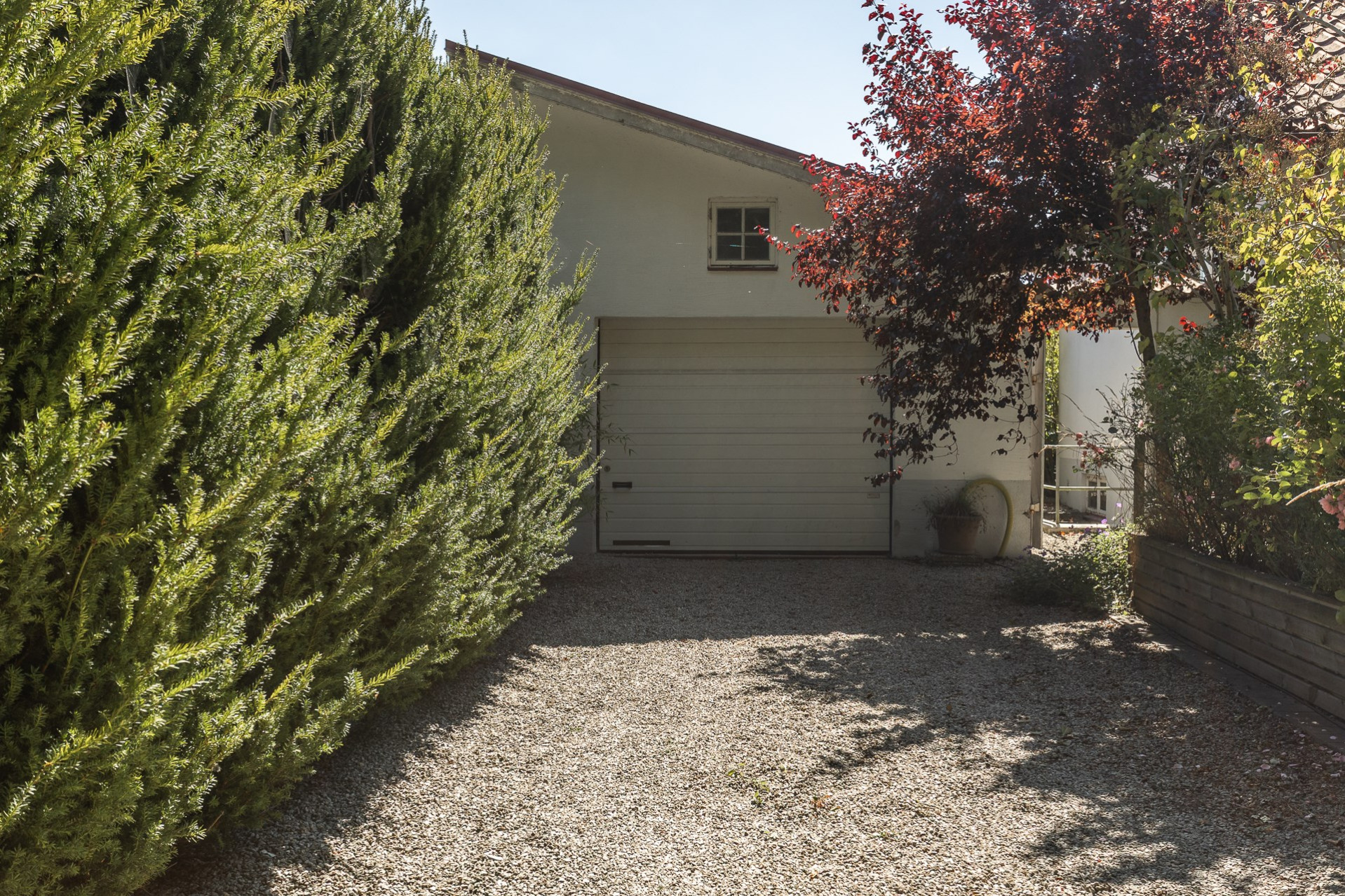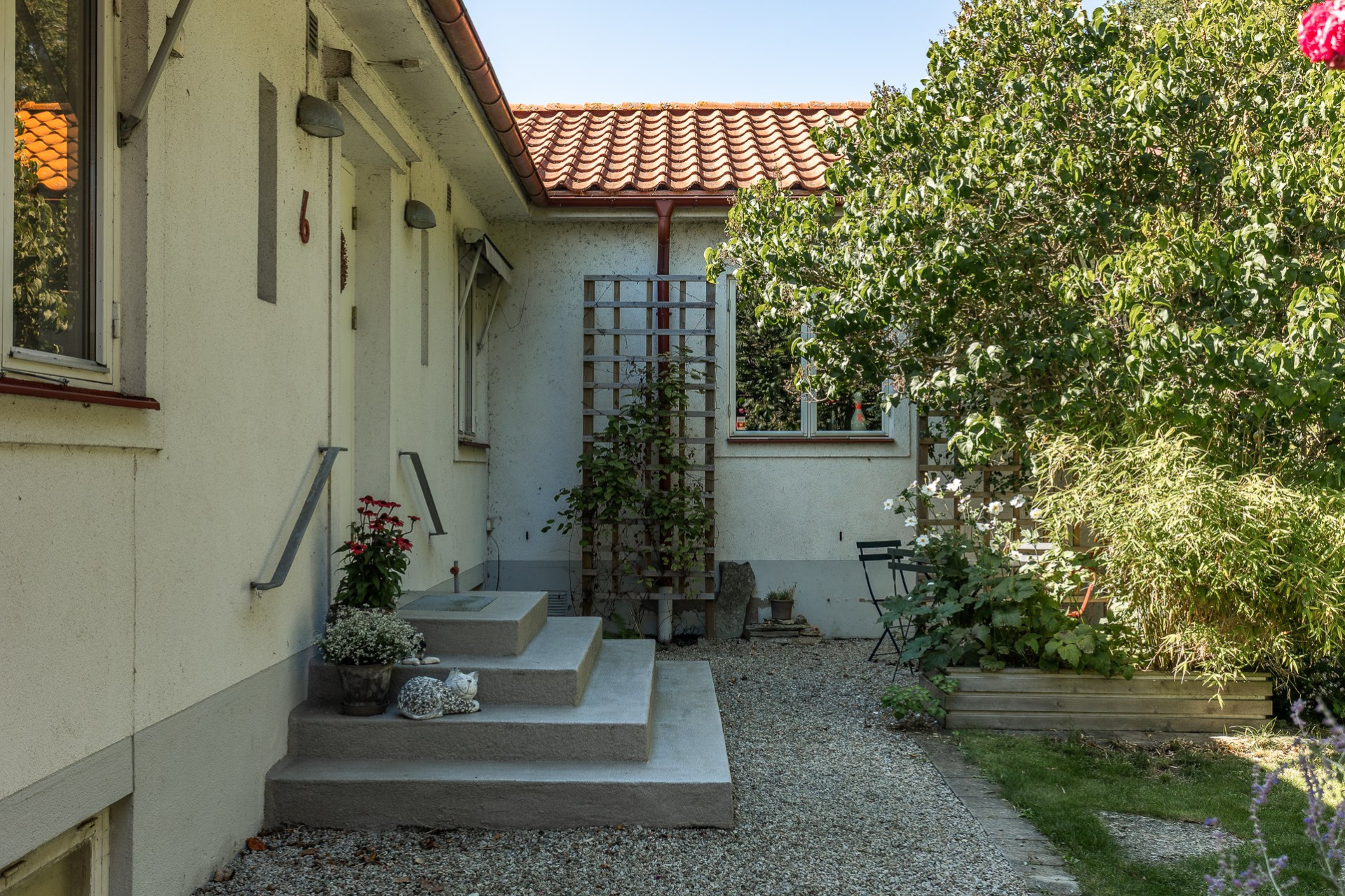 Från trädgården, och bakom garaget, finns ett isolerat och uppvärmt rum med egen entré samt fönster. Öppet till nock, parkettgolv. Perfekt yta för kontor, ateljé eller tonårsrum.