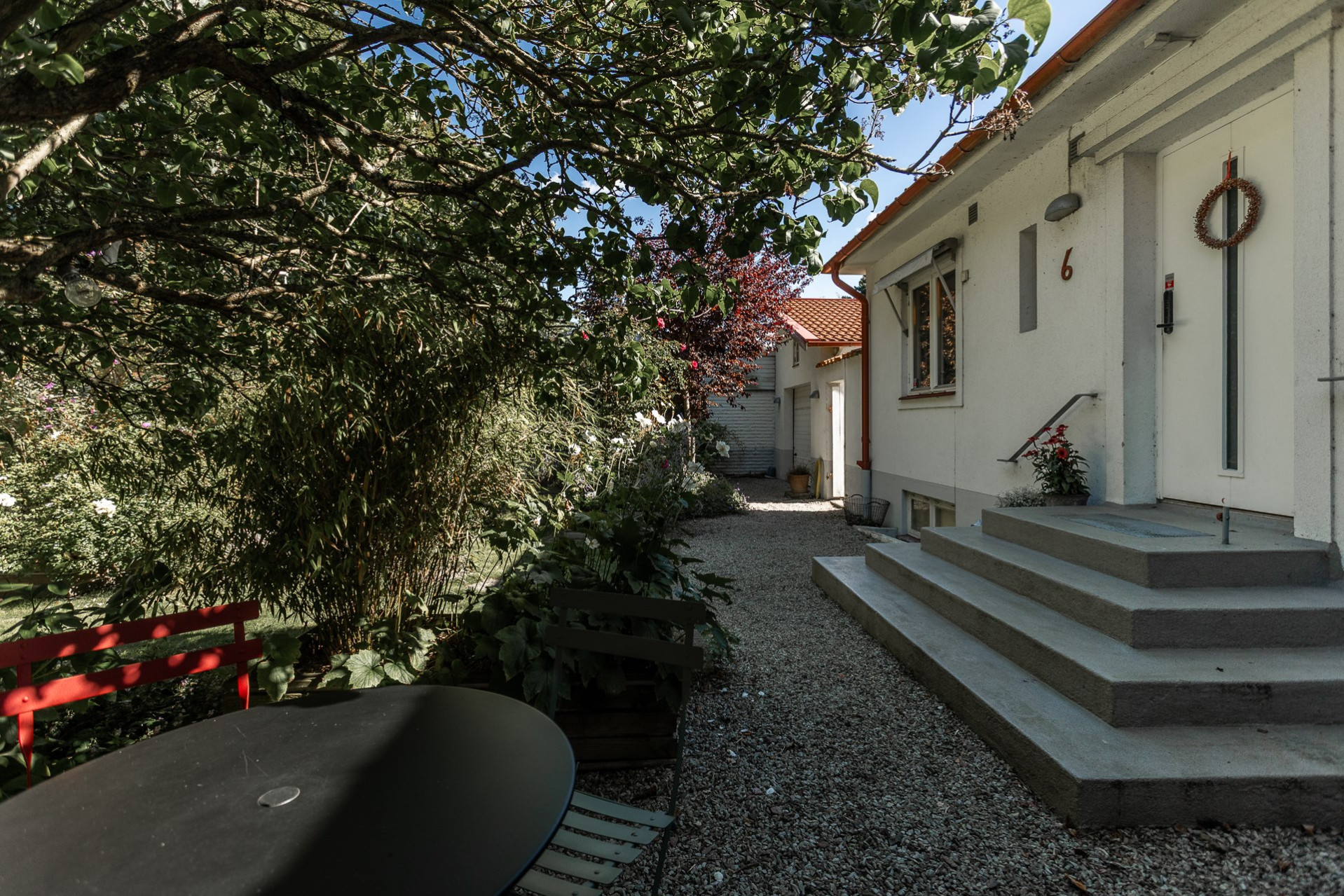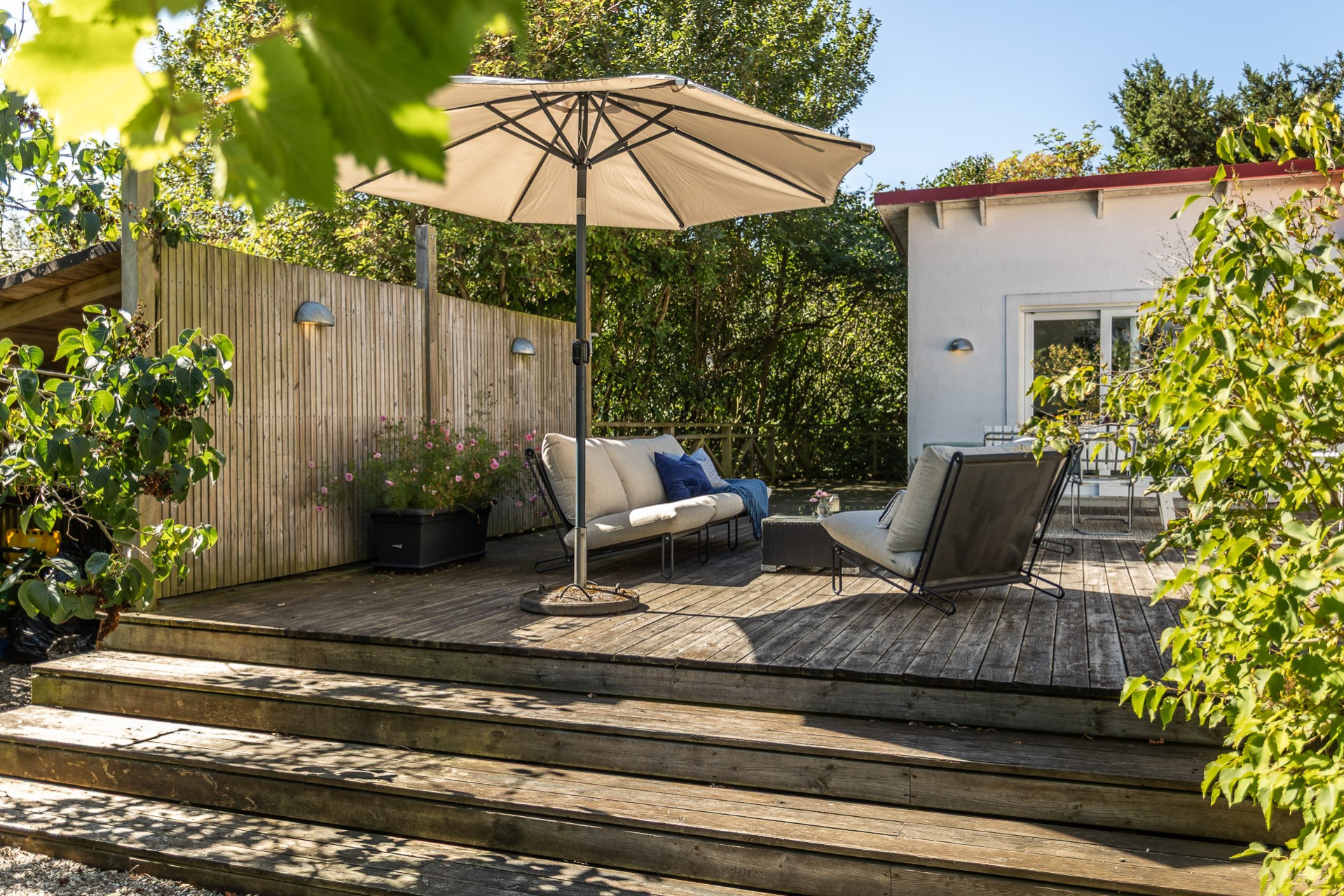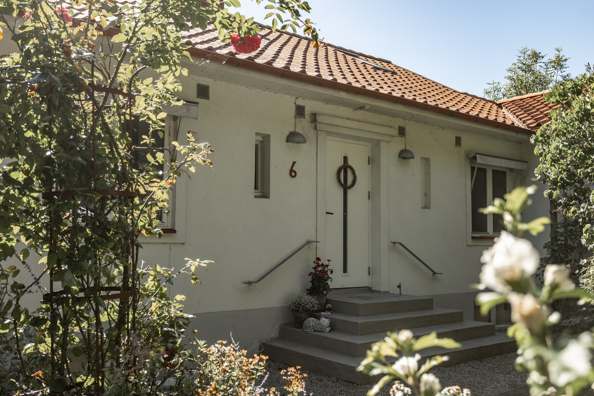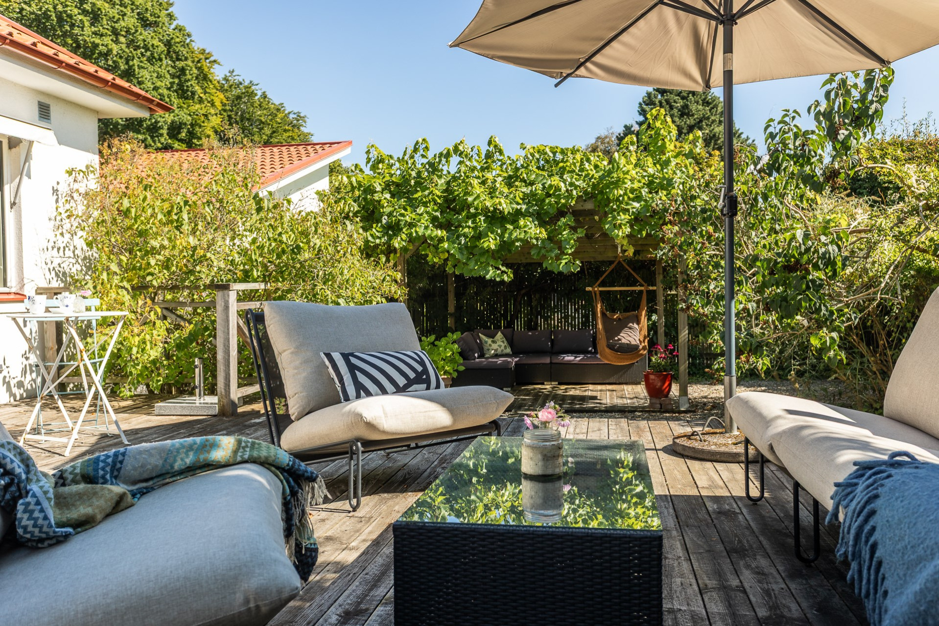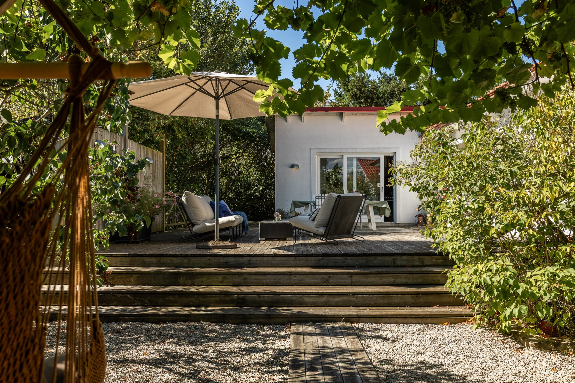 Från trädgården, och bakom garaget, finns ett isolerat och uppvärmt rum med egen entré samt fönster. Öppet till nock, parkettgolv. Perfekt yta för kontor, ateljé eller tonårsrum.