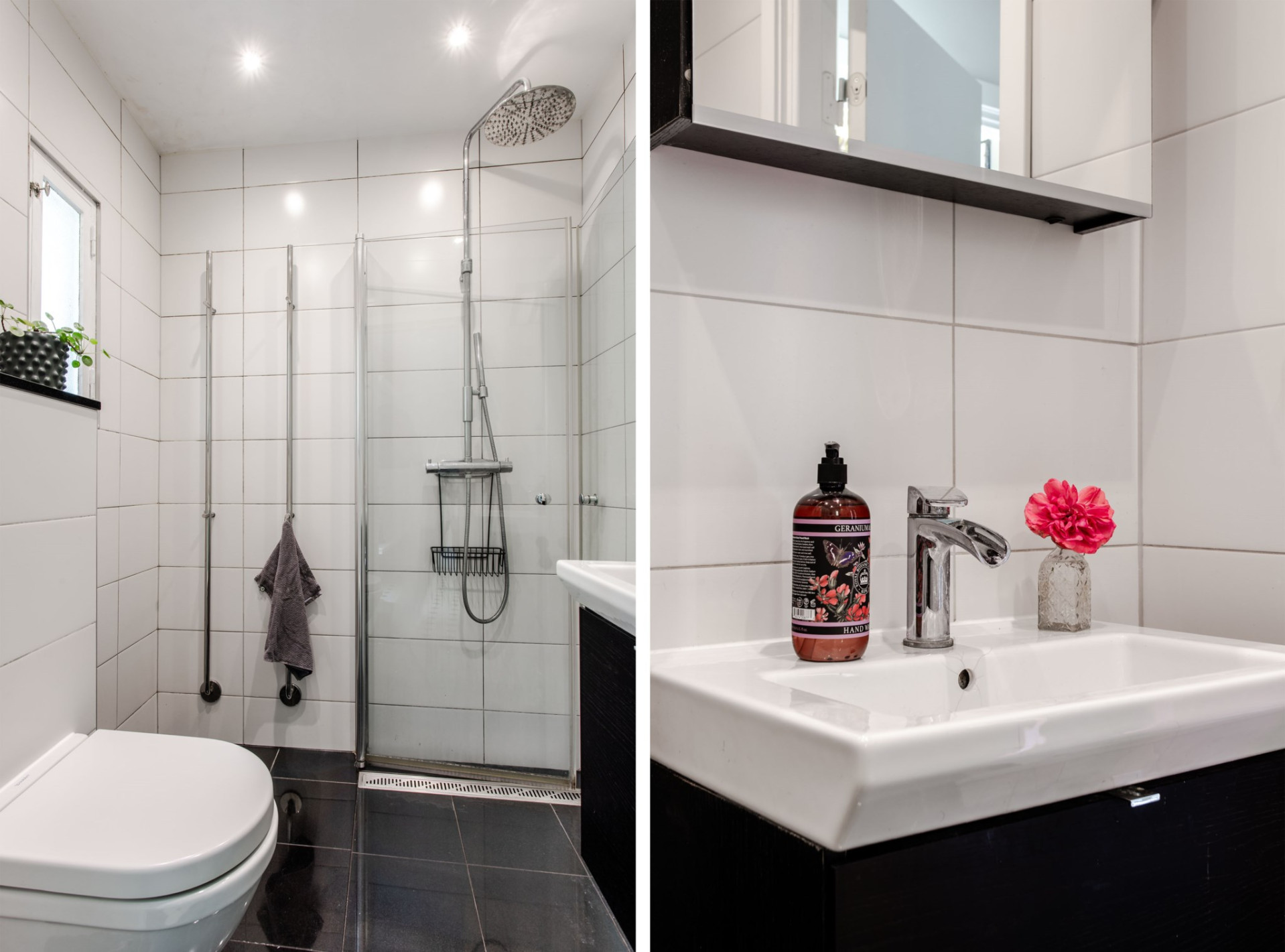 Smakfullt renoverat 2011 med svart granitgolv och vita kaklade väggar. Kommod med handfat, spegelskåp, vägghängd toalett samt dusch med glasdörrar. Handdukstork, golvvärme samt spotlights i taket.