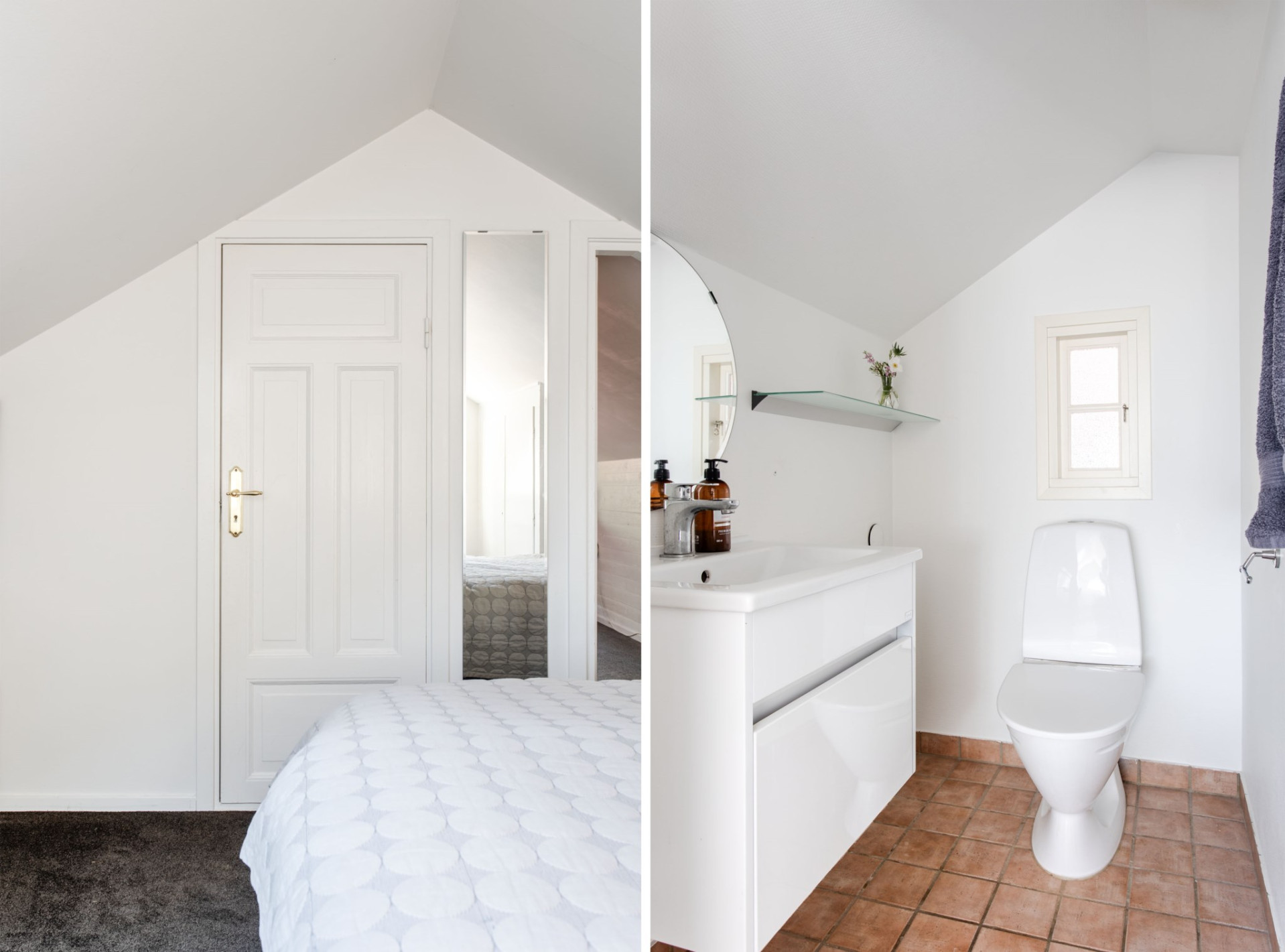 Bostadens fjärde sovrum ligger även här uppe, privat och rymligt nog för en dubbelsäng och skrivbordshörna samt med god förvaring. Heltäckningsmatta. Tillhörande toalett och vask finns också.