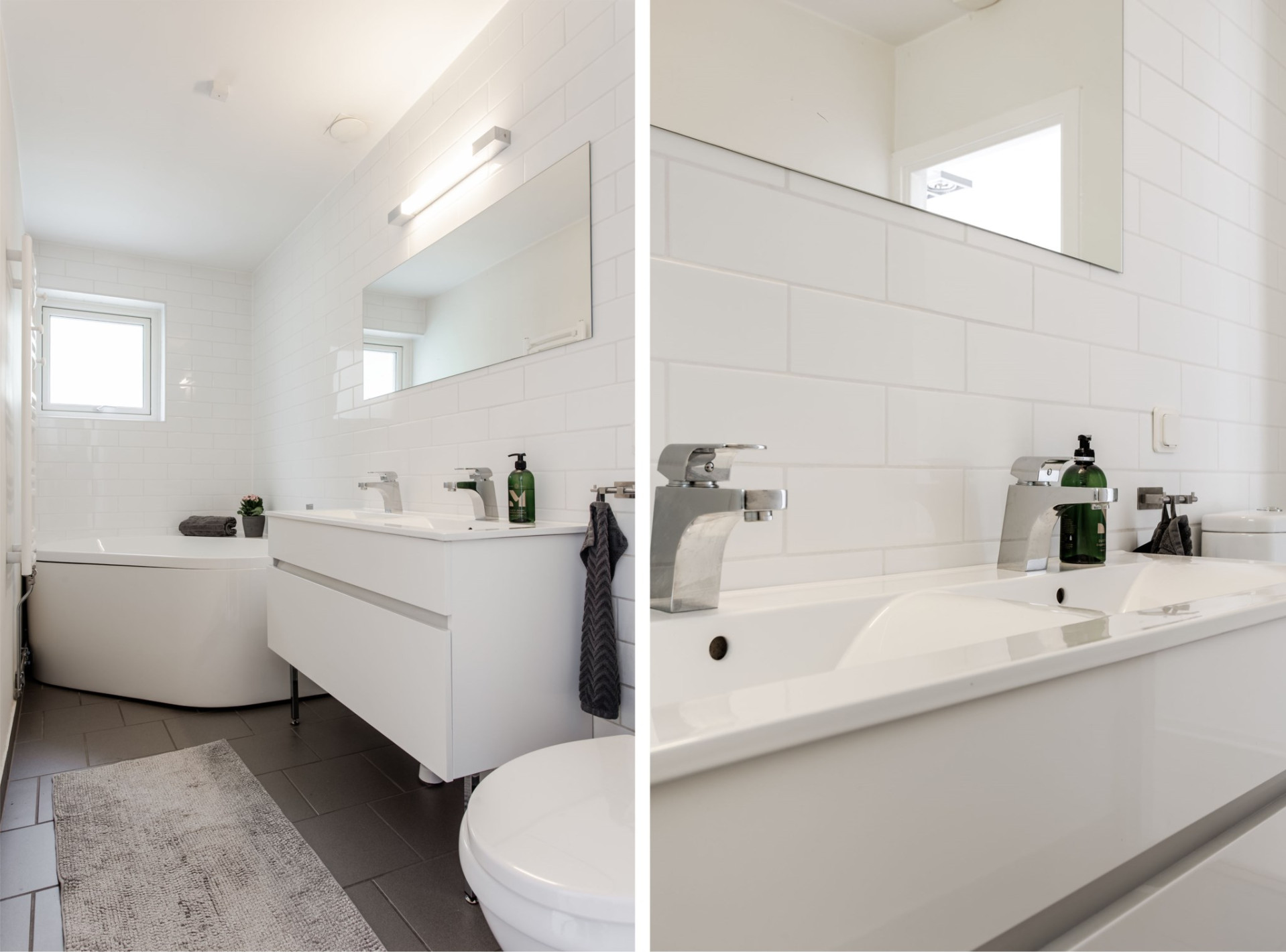 Helkaklat och renoverat 2013 med grått klinkergolv och vita kaklade väggar. Toalett, dubbelvask med förvaring, spegel med belysning samt enormt badkar.