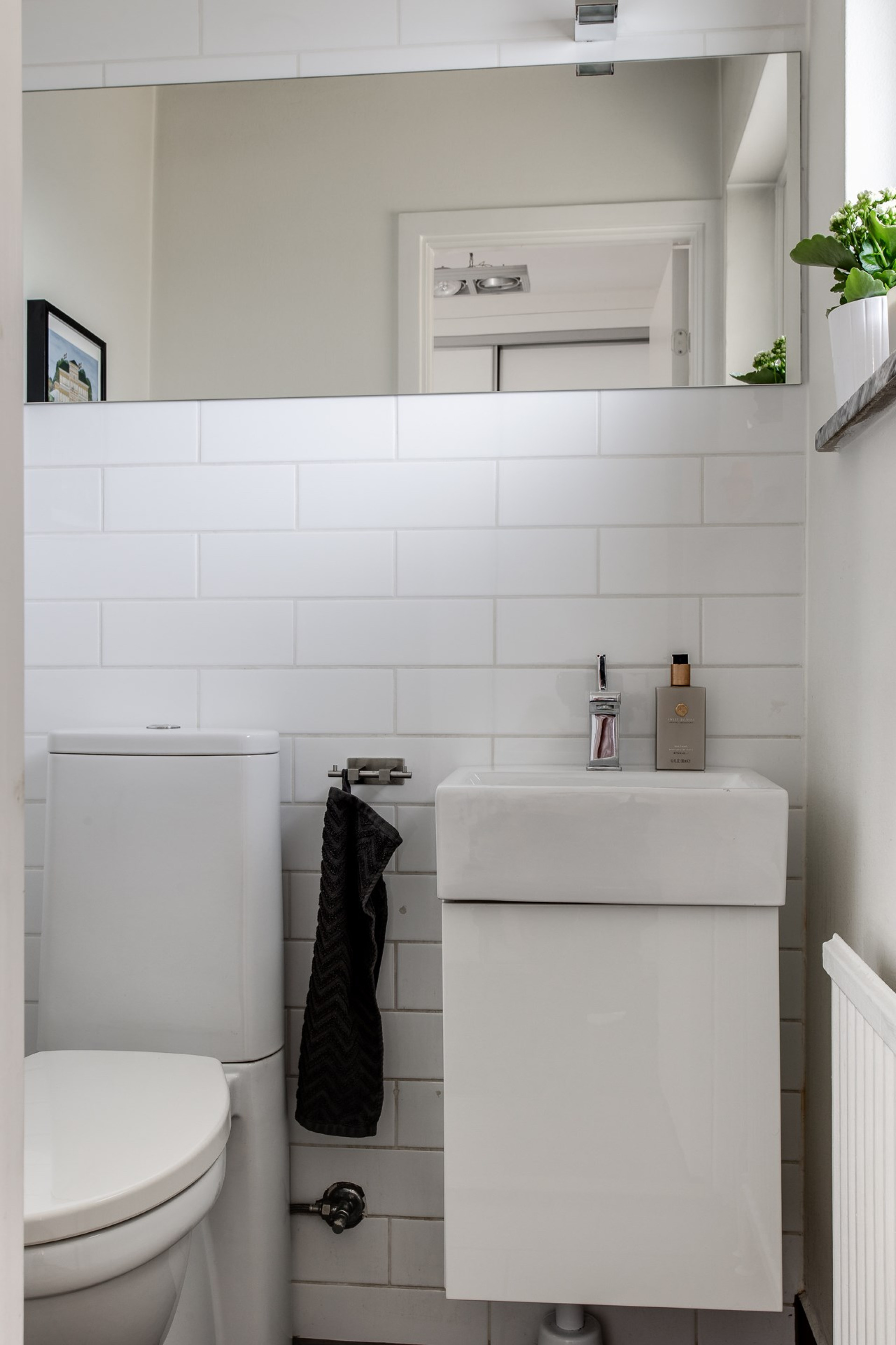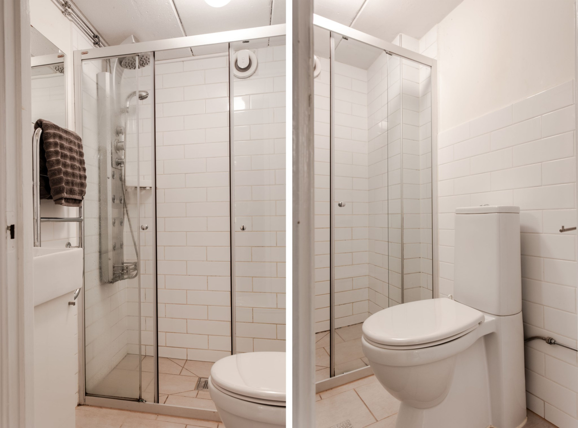 Renoverat 2013 med ljust klinkergolv och vita kaklade väggar. Utrustat med dusch, toalett samt vask med förvaring.