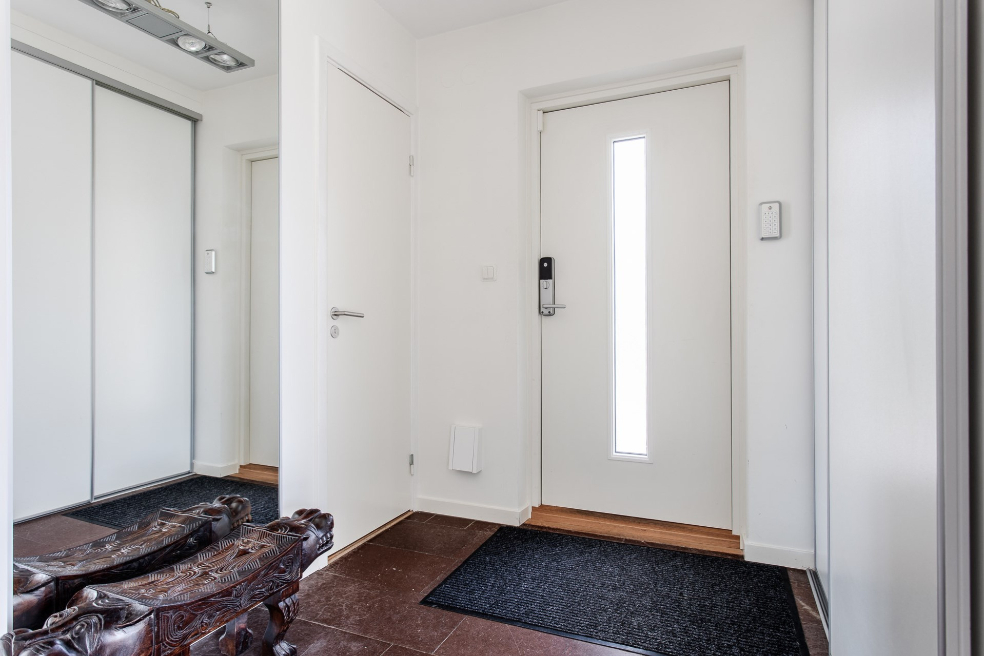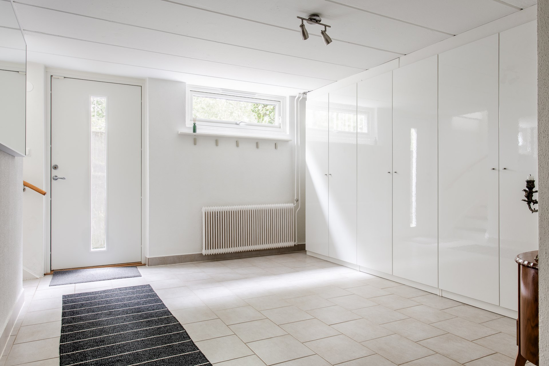 Här finns ytterligare en ingång med helt ny dörr med ljusinsläpp. Gott om garderober, klinkergolv och vita putsade väggar.