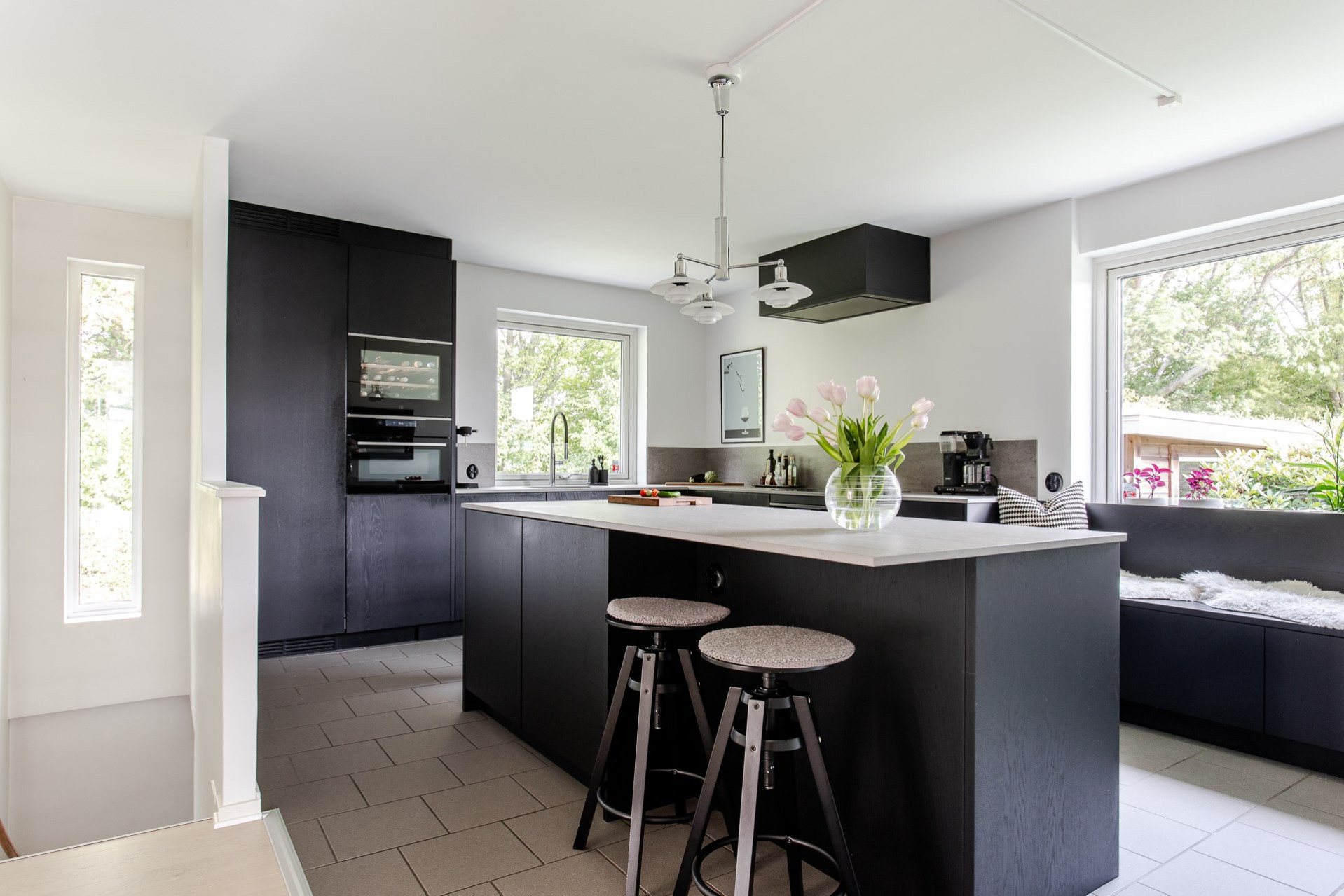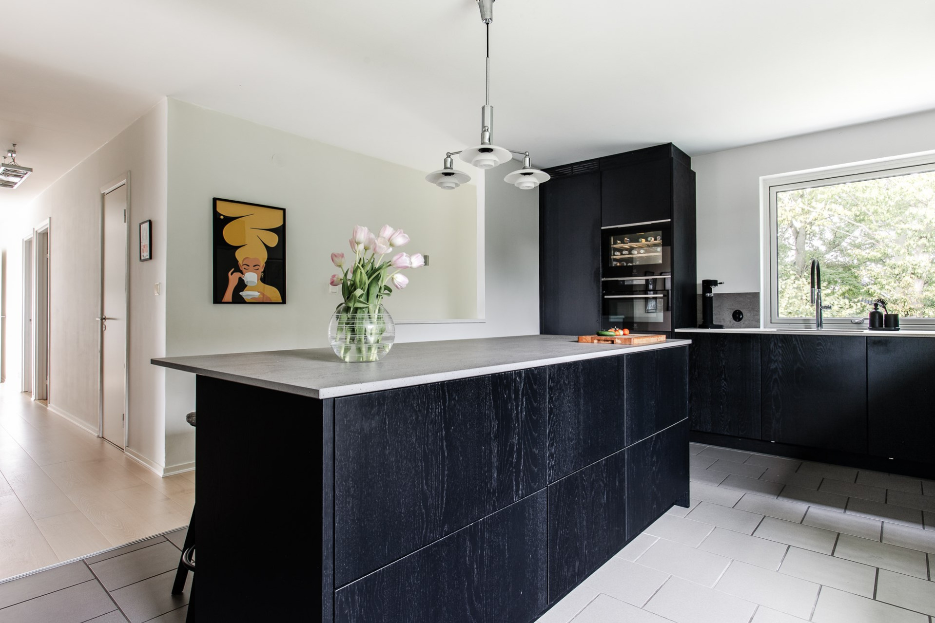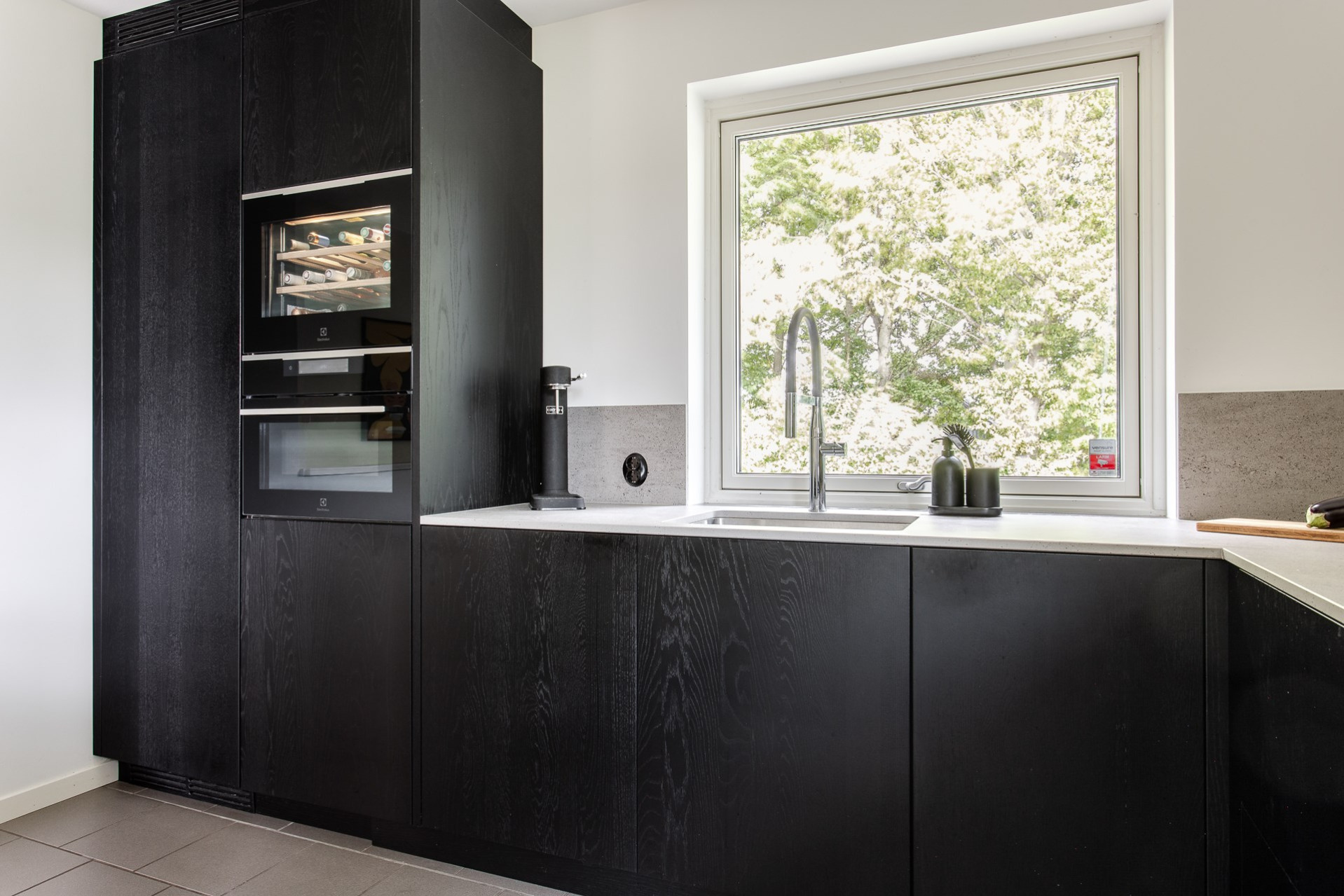 Exklusivt kök från Ballingslöv totalrenoverat 2021. Det är faktiskt så att Ballingslöv har med köket i sin marknadsföring på sin hemsida. Att läsa från Ballingslövs hemsida: Ett svart kök i massivt trä med en härlig köksö och tåliga bänkskivor i Dekton Keon. Här finns gott om arbets- och bänkytor och den svarta luckan känns modern mot den grå stenbänkskivan och de vita väggarna. Det snygga vitrinskåpet från vår Shaker serie ger värme åt köket med sin insida i vitpigmenterat trä. DISKBÄNK: KBX 210-55, Franke. VITVAROR: Kyl och Frys (Electrolux), induktionshäll (70 cm bred Electrolux) Ugn med ångfunktion (Electrolux), Kombi ugn/mikro (Electrolux), Vinkyl (Electrolux) och Fläkt Röros.