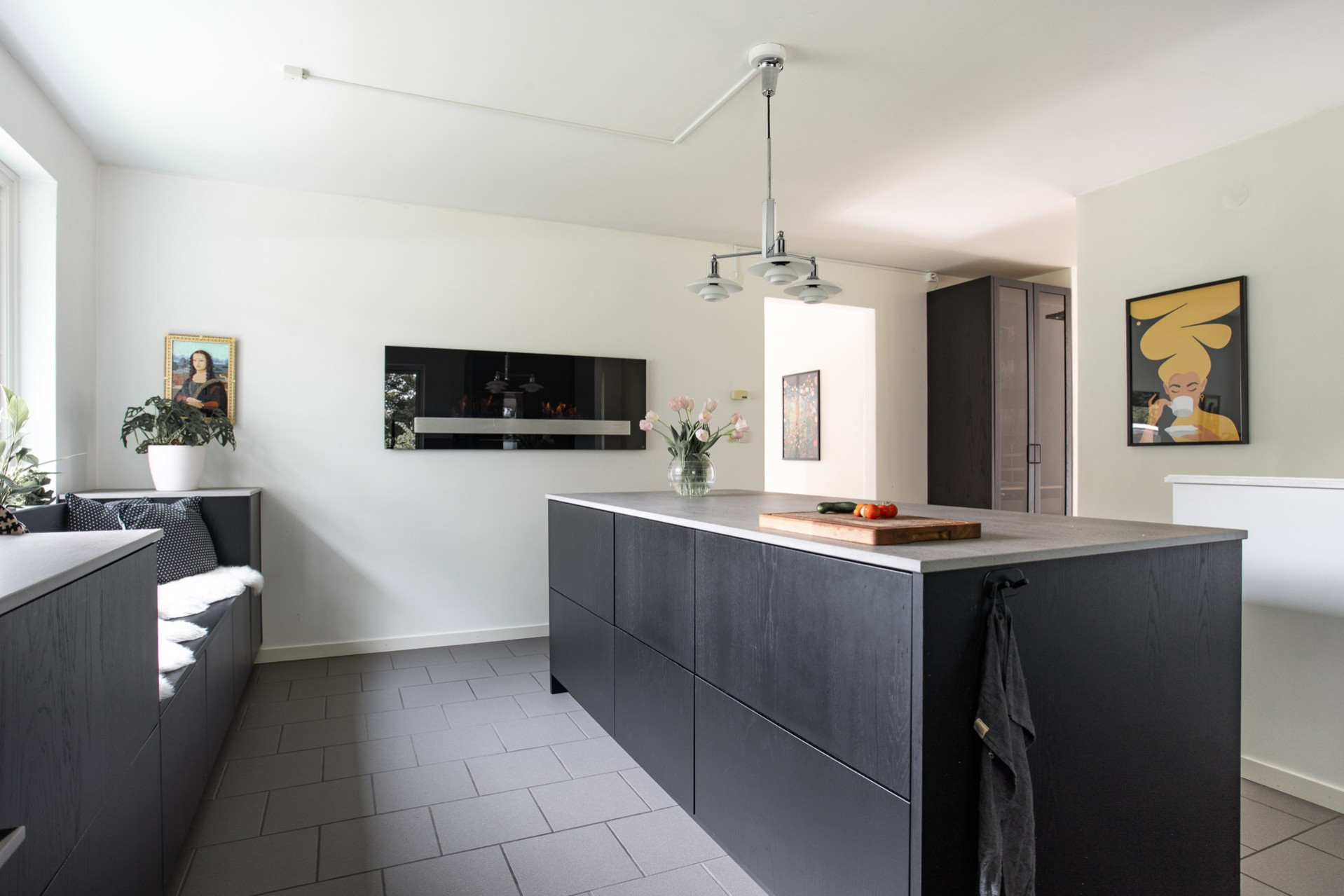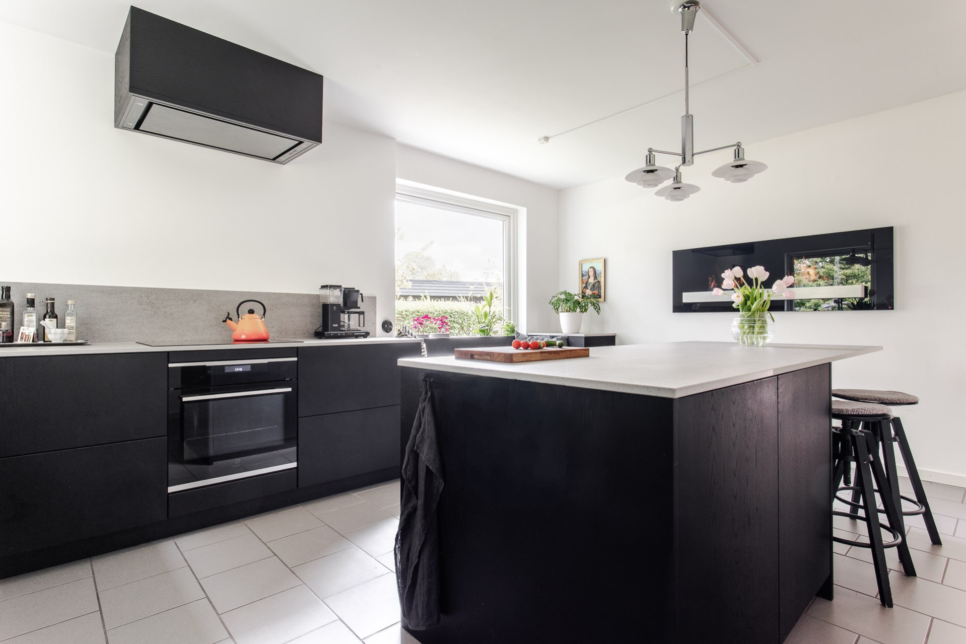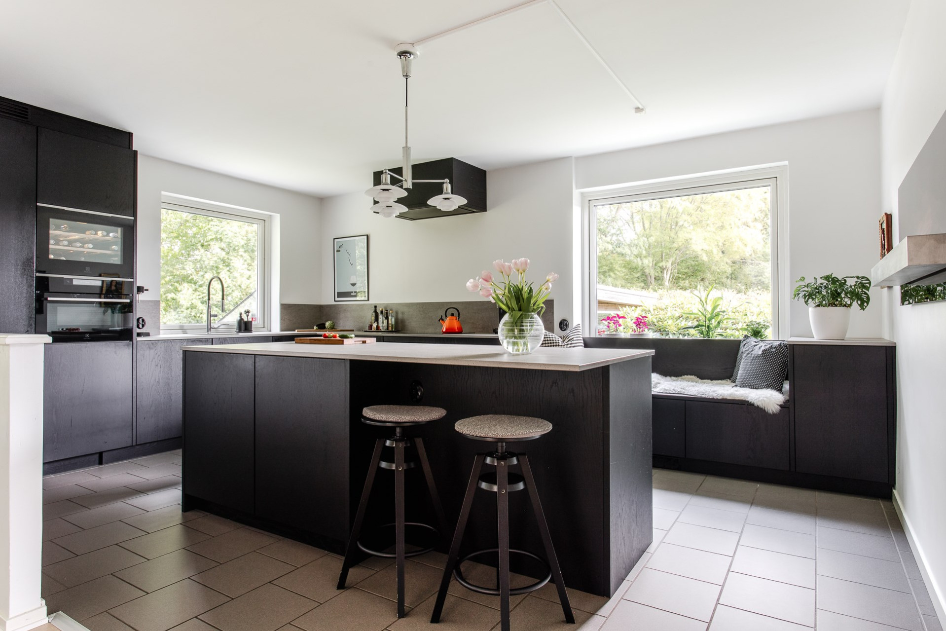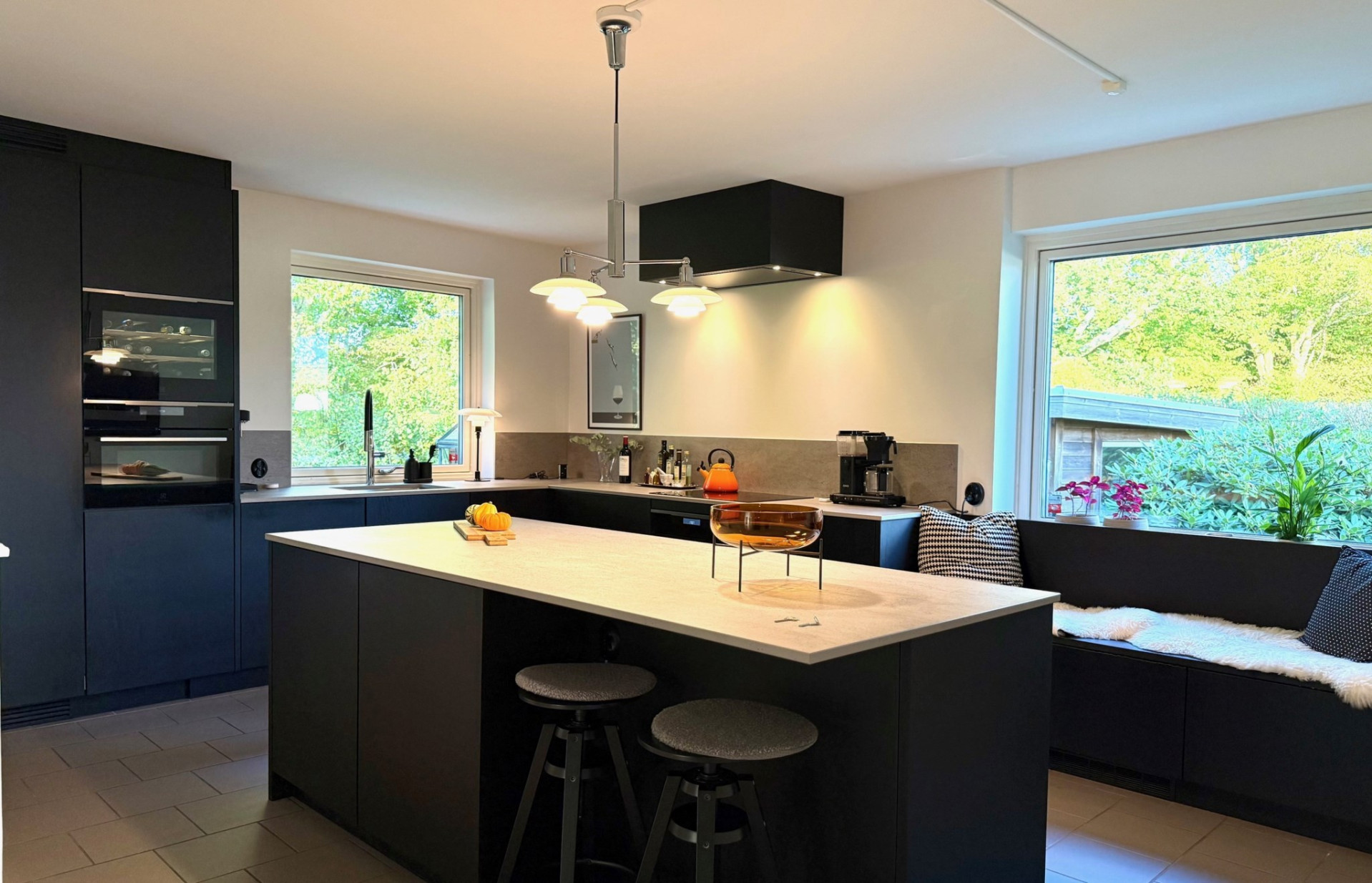 Exklusivt kök från Ballingslöv totalrenoverat 2021. Det är faktiskt så att Ballingslöv har med köket i sin marknadsföring på sin hemsida. Att läsa från Ballingslövs hemsida: Ett svart kök i massivt trä med en härlig köksö och tåliga bänkskivor i Dekton Keon. Här finns gott om arbets- och bänkytor och den svarta luckan känns modern mot den grå stenbänkskivan och de vita väggarna. Det snygga vitrinskåpet från vår Shaker serie ger värme åt köket med sin insida i vitpigmenterat trä. DISKBÄNK: KBX 210-55, Franke. VITVAROR: Kyl och Frys (Electrolux), induktionshäll (70 cm bred Electrolux) Ugn med ångfunktion (Electrolux), Kombi ugn/mikro (Electrolux), Vinkyl (Electrolux) och Fläkt Röros.