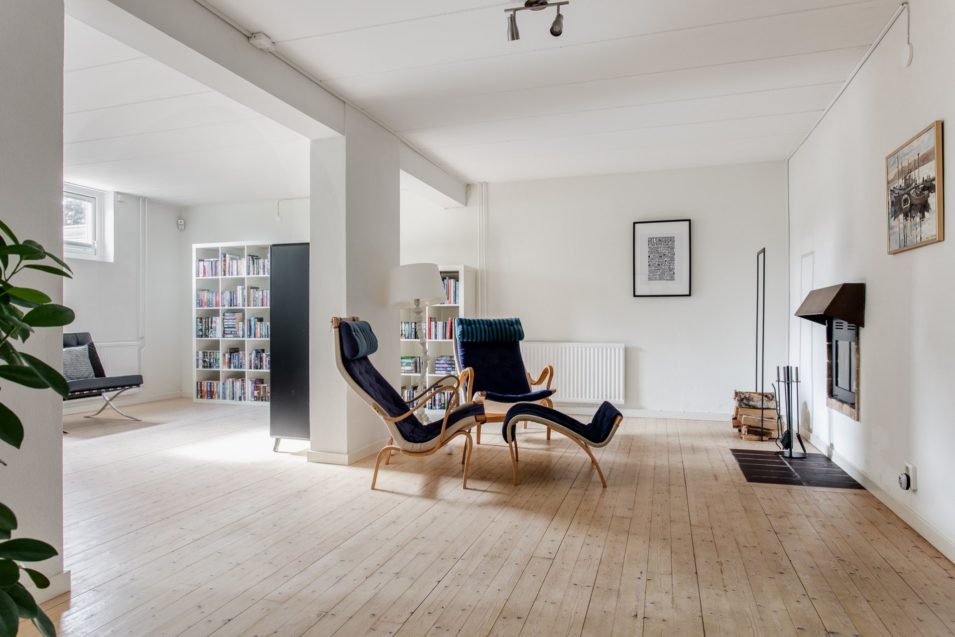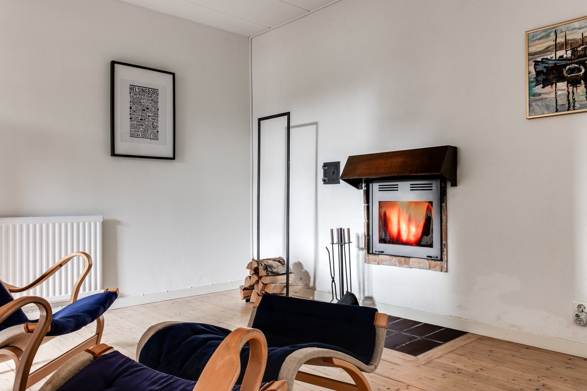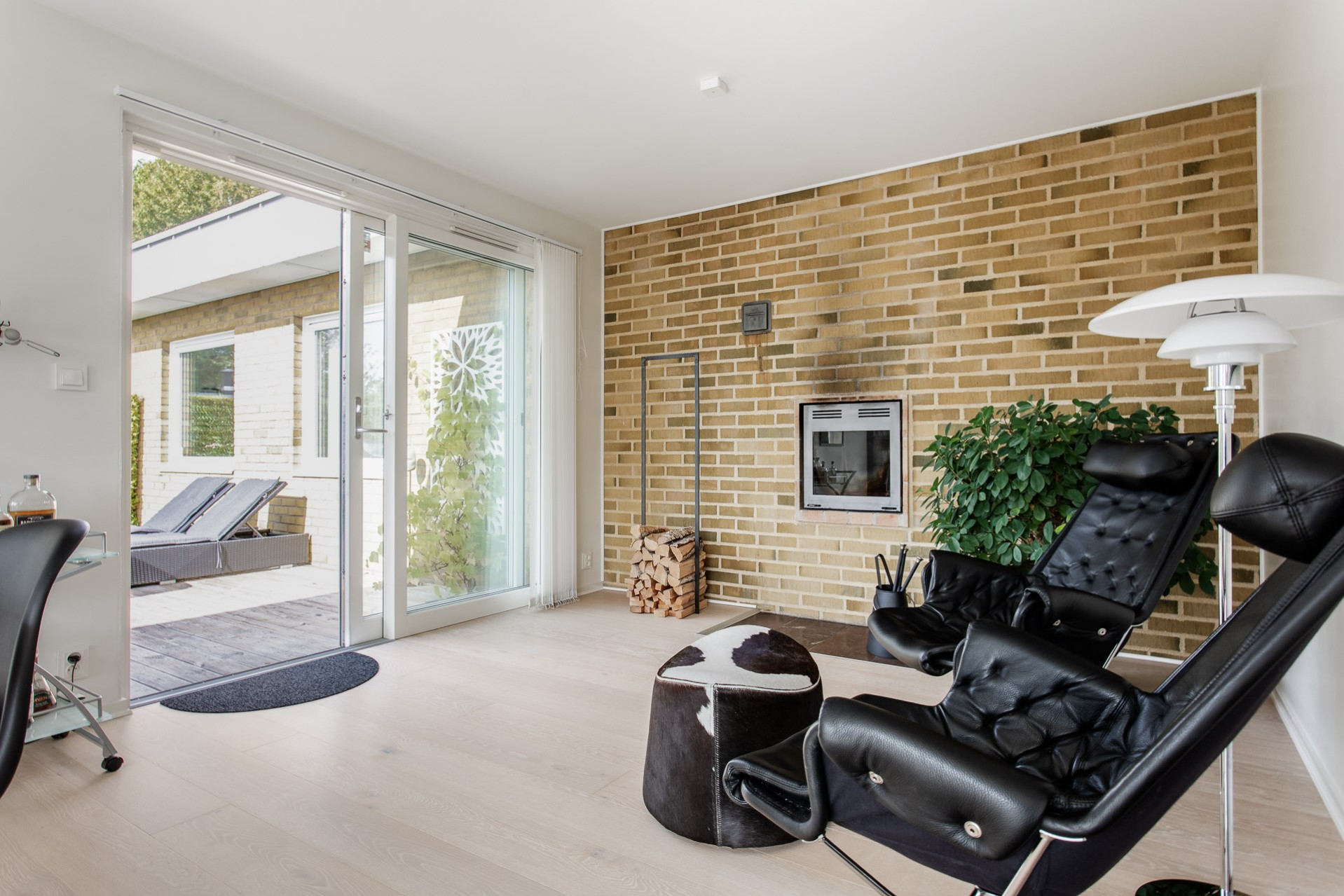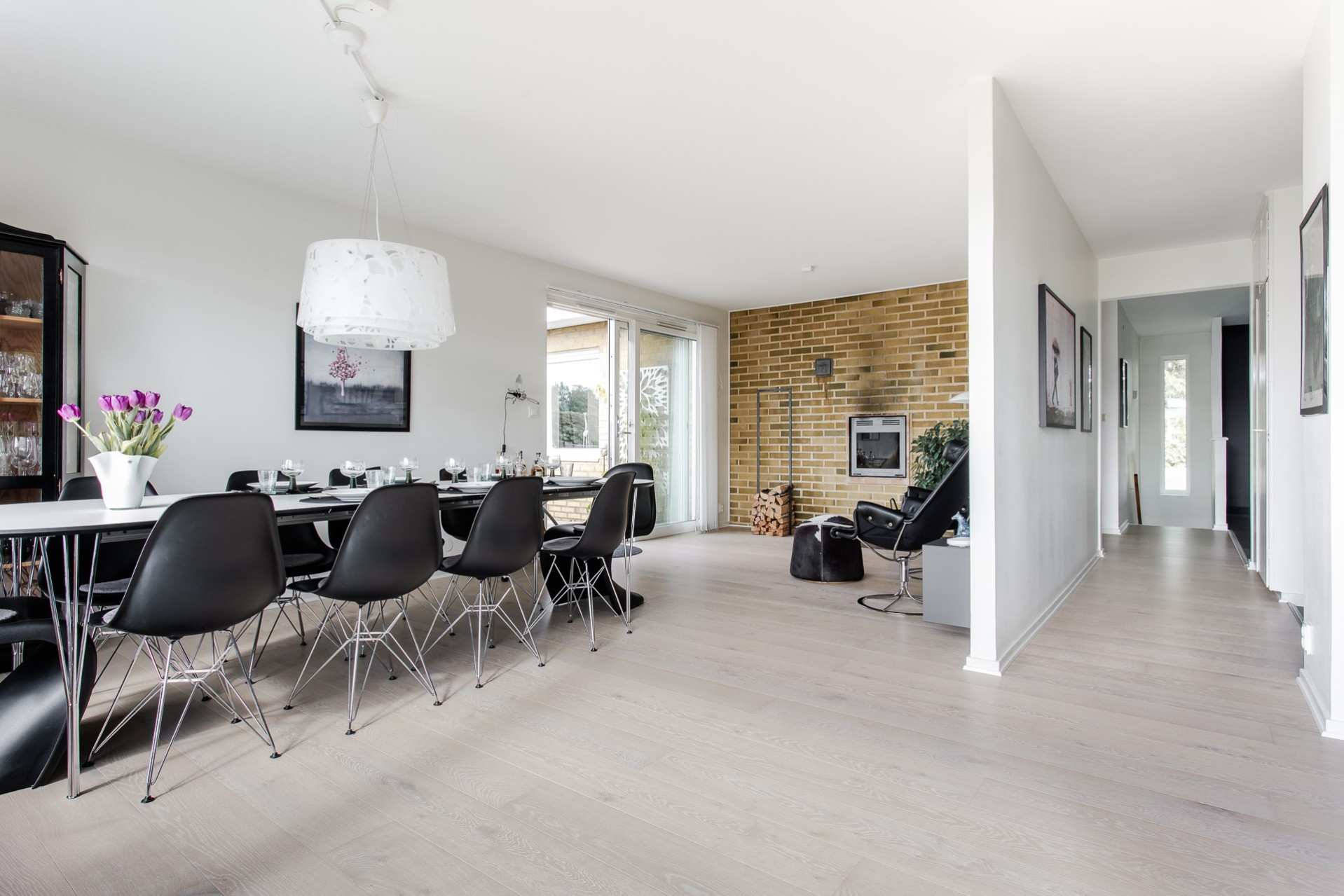 Underbart rum med fönster i tre väderstreck. Genomgående enstavsgolv (nylagt 2019) och vitmålade väggar. Här ryms större matbord, soffgrupp samt ytterligare sittgrupp. Braskamin i tegelväggen förhöjer mysfaktorn samt man har en underbar kontakt med terrassen via ett glasat skjutparti.