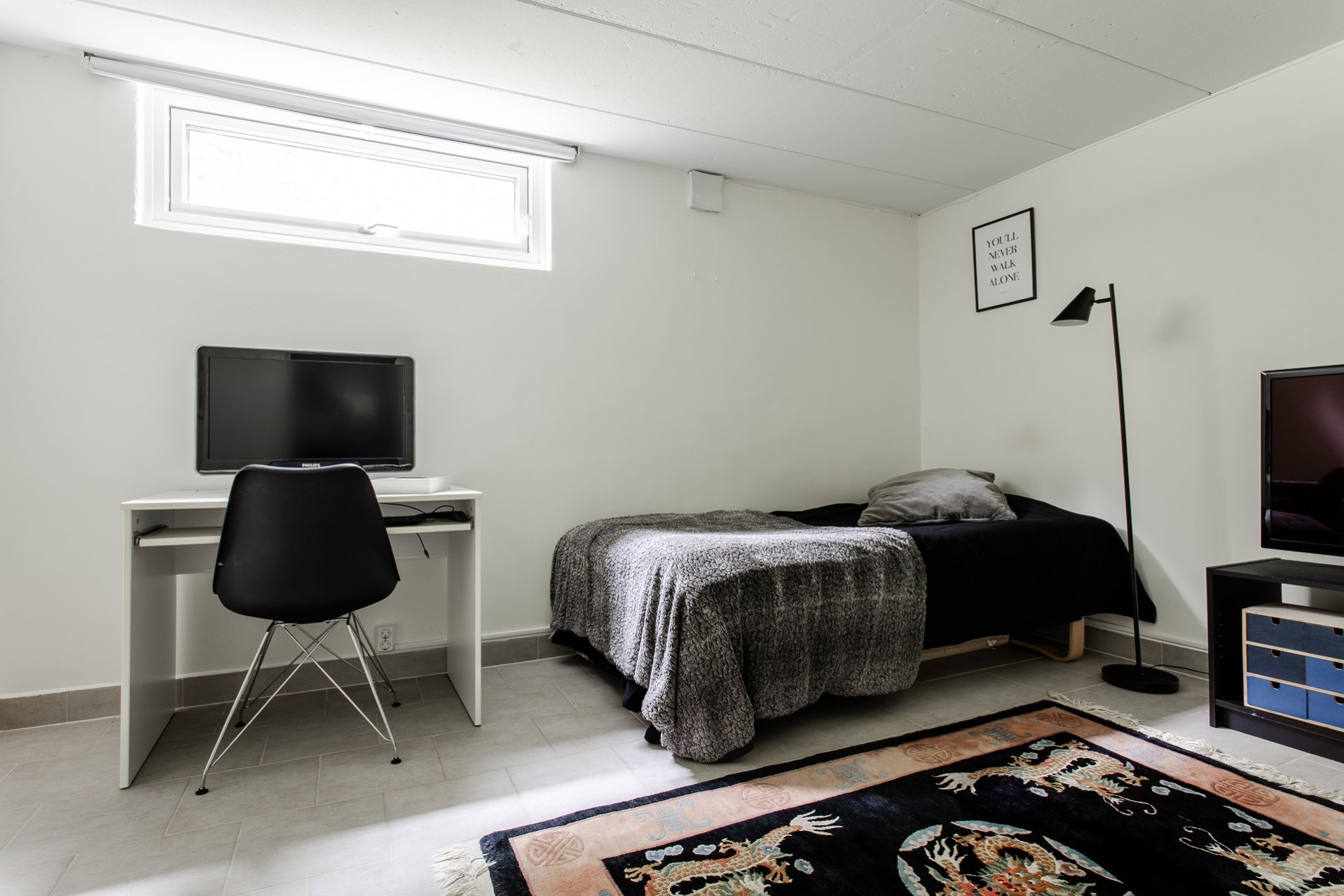 Två trappsteg ner ligger den stora och härliga gillestugan på närmre 45 kvm. Här ges plats åt både pingis-/biljardbord och soffhörna. Braskamin förhöjer mysfaktorn och de extra utgrävda fönsterna ger ett bra ljusinsläpp.