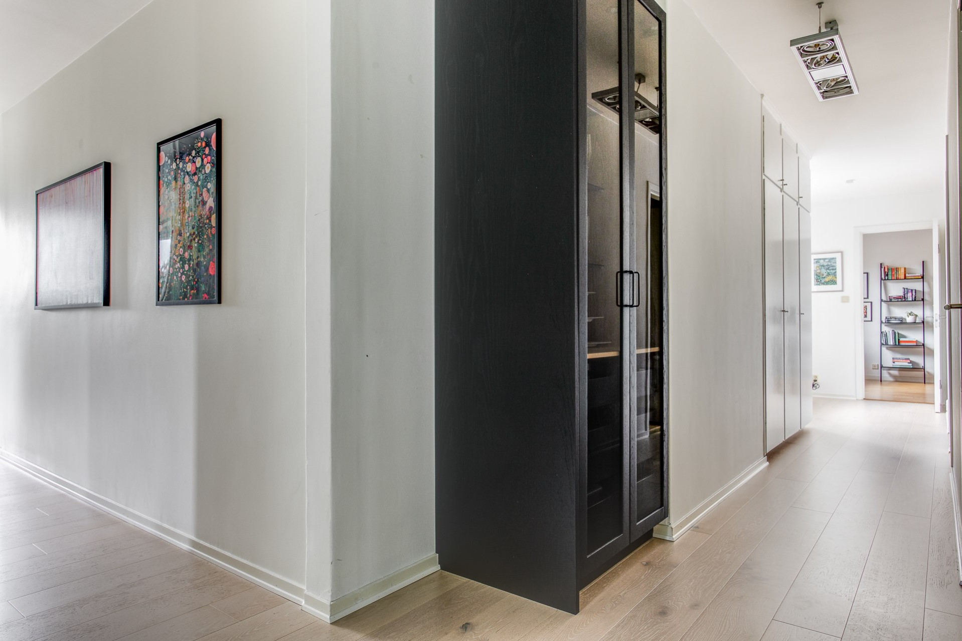 Ölandssten på golvet och förvaring via garderober med skjutdörrar.