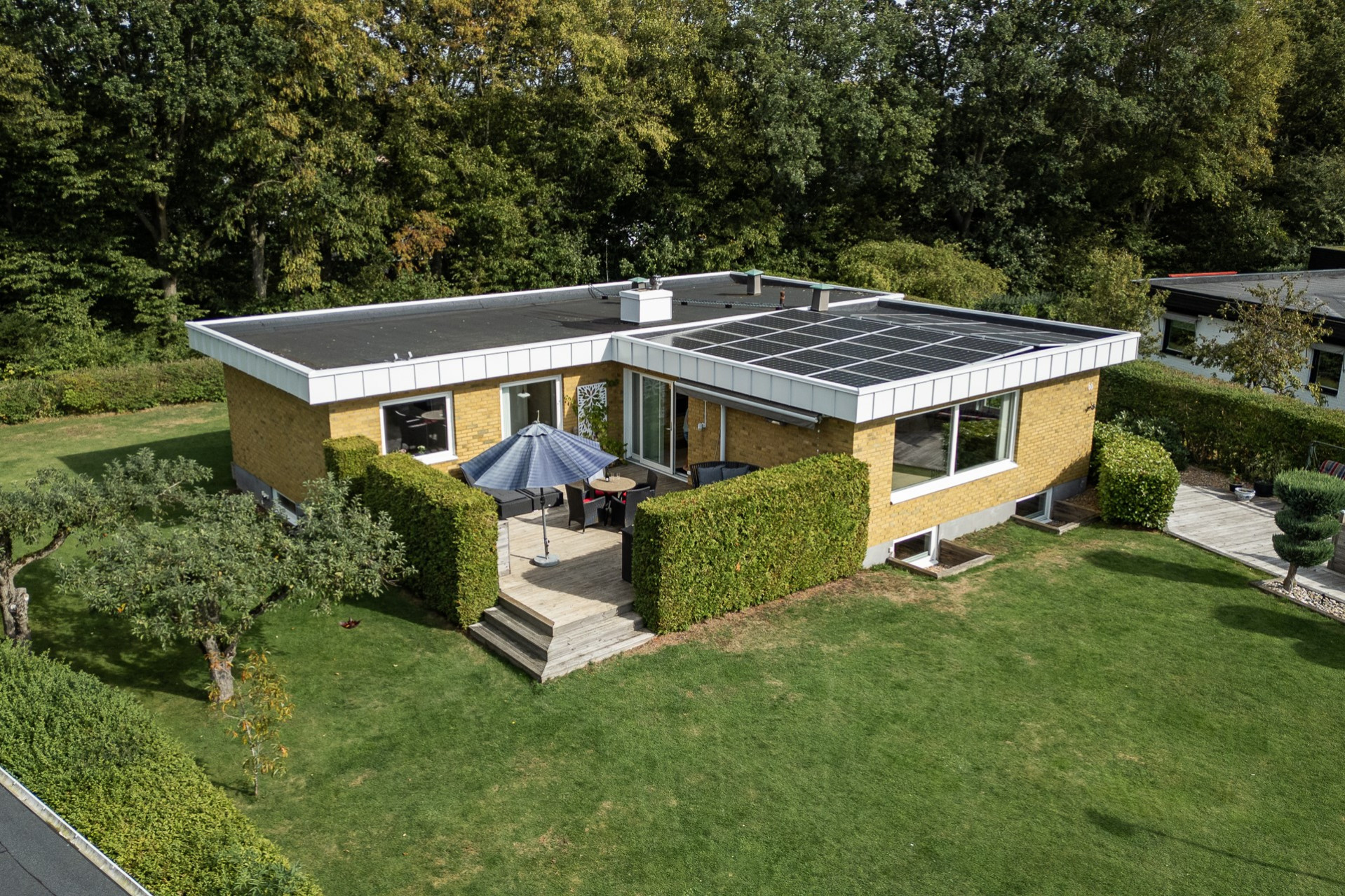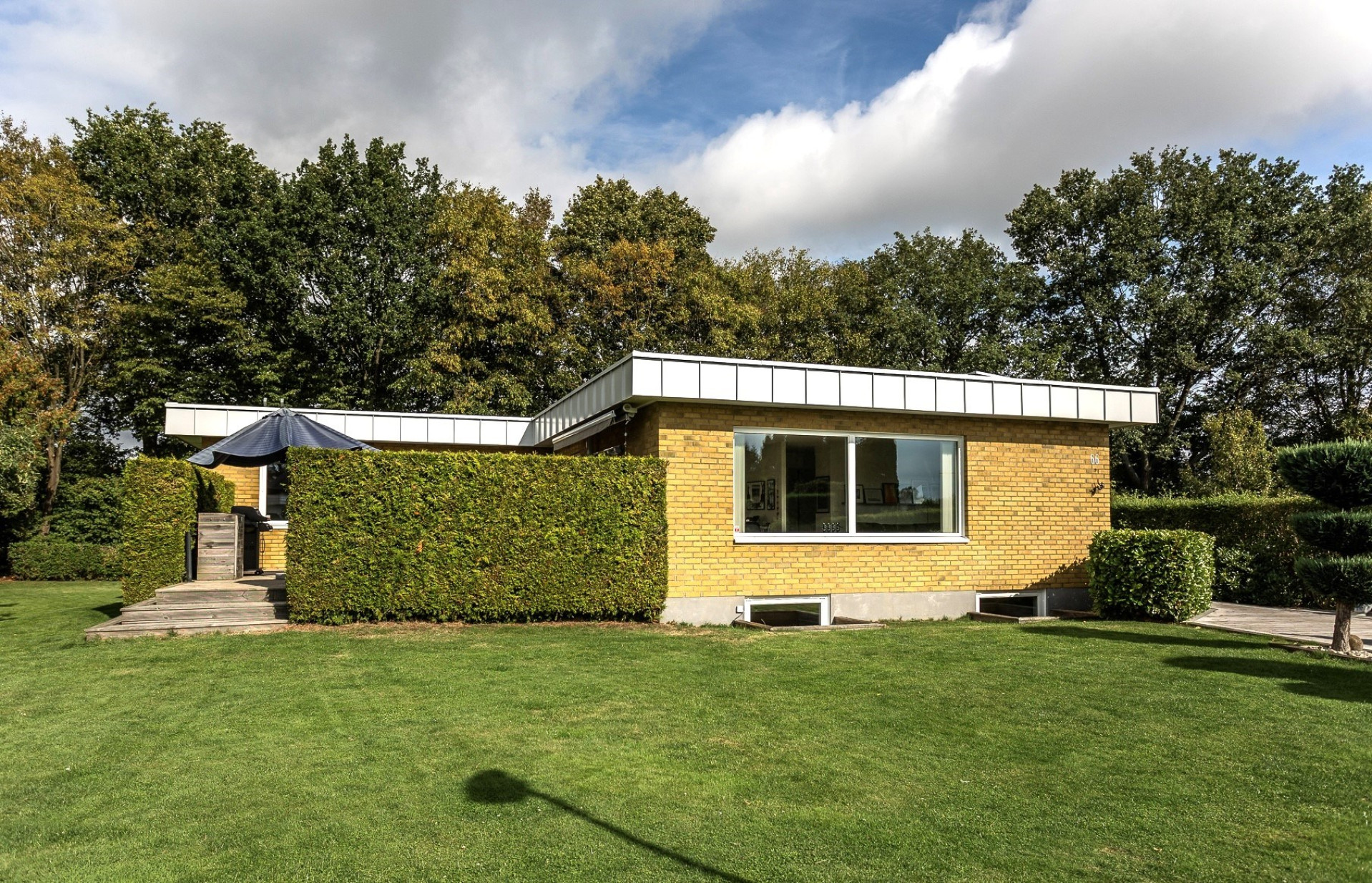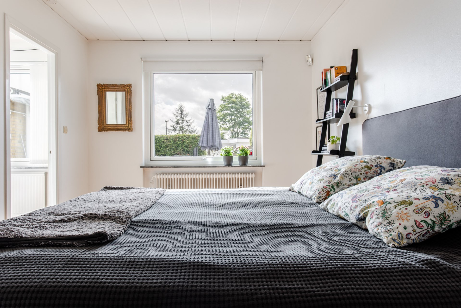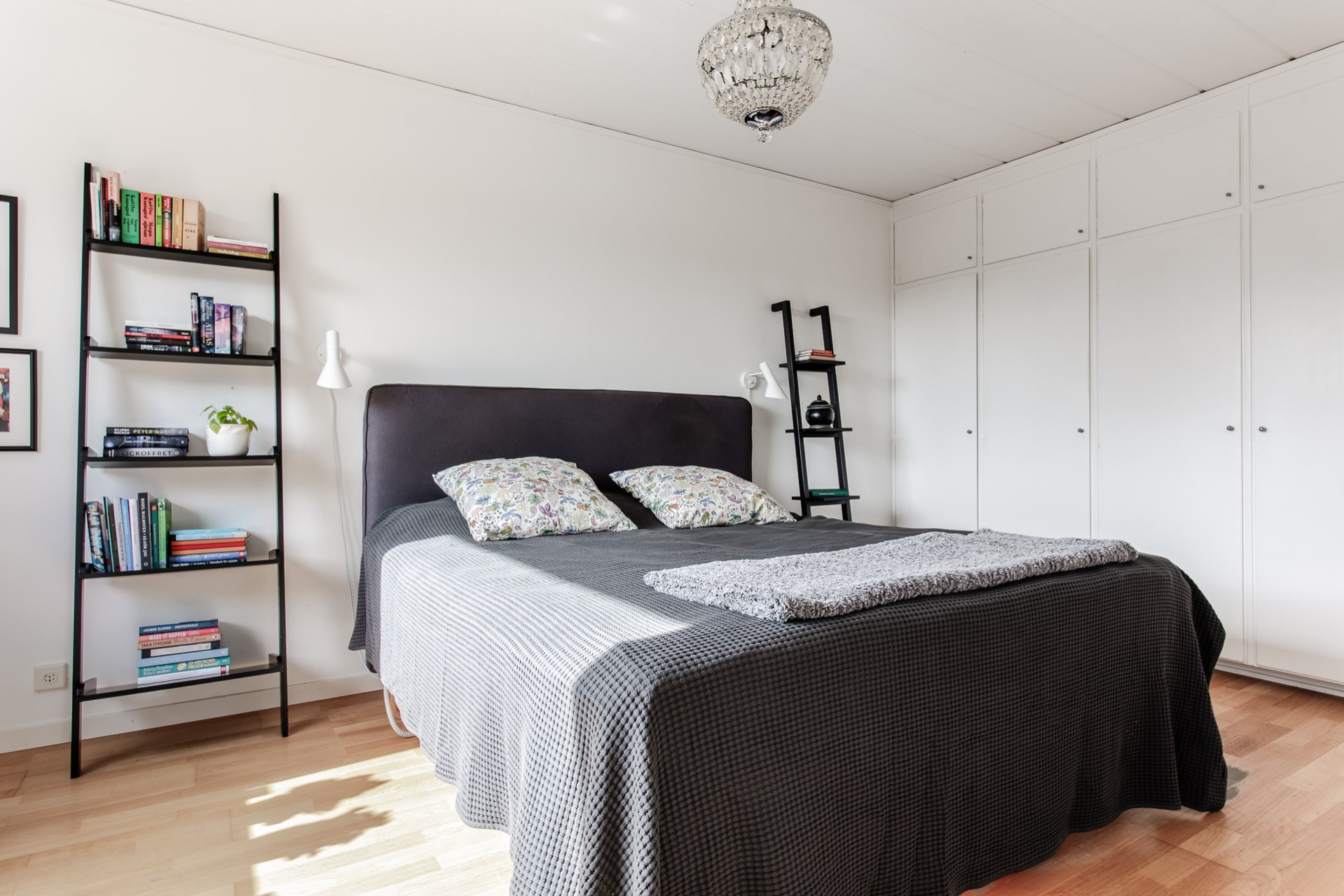 längst in ligger det största sovrummet på entréplan. Parkettgolv, vita väggar samt en hel vägg utgör förvaring.