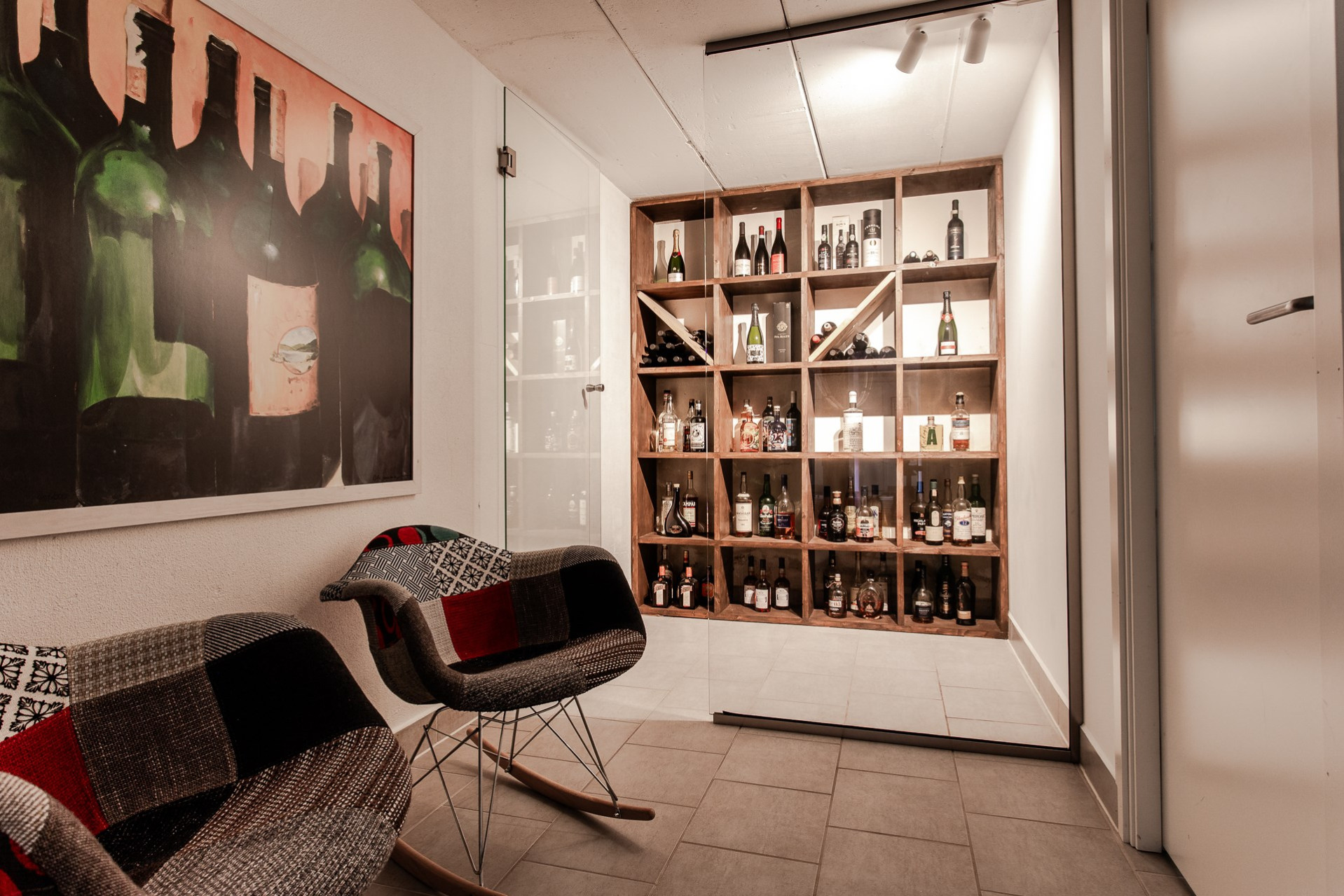 Längst in, bakom glaspartier, förvarar man vinerna.