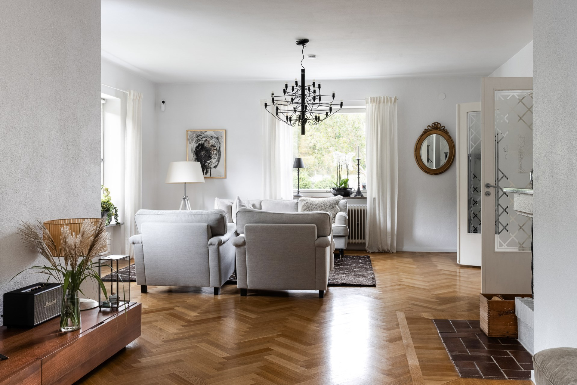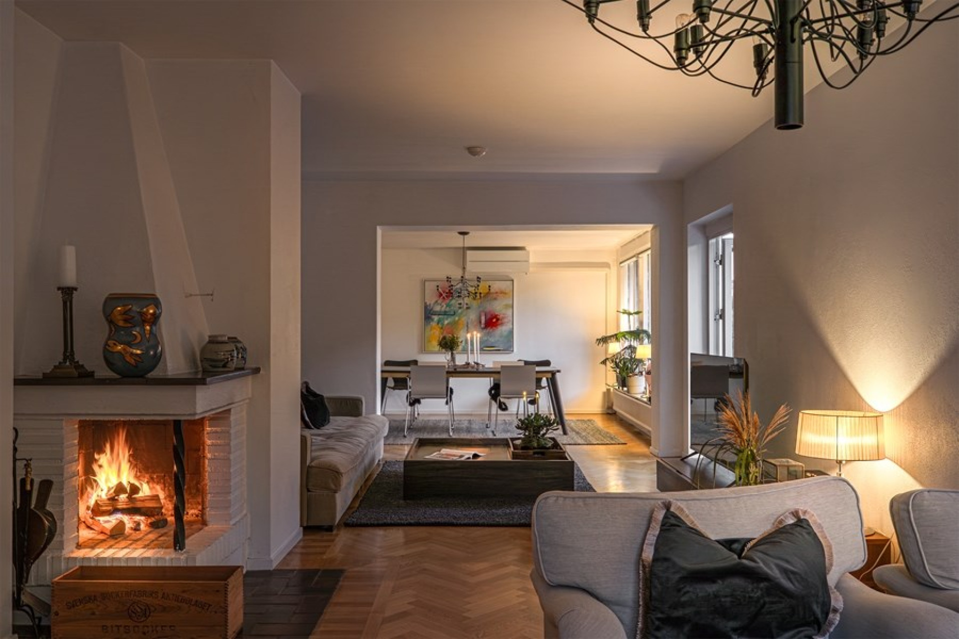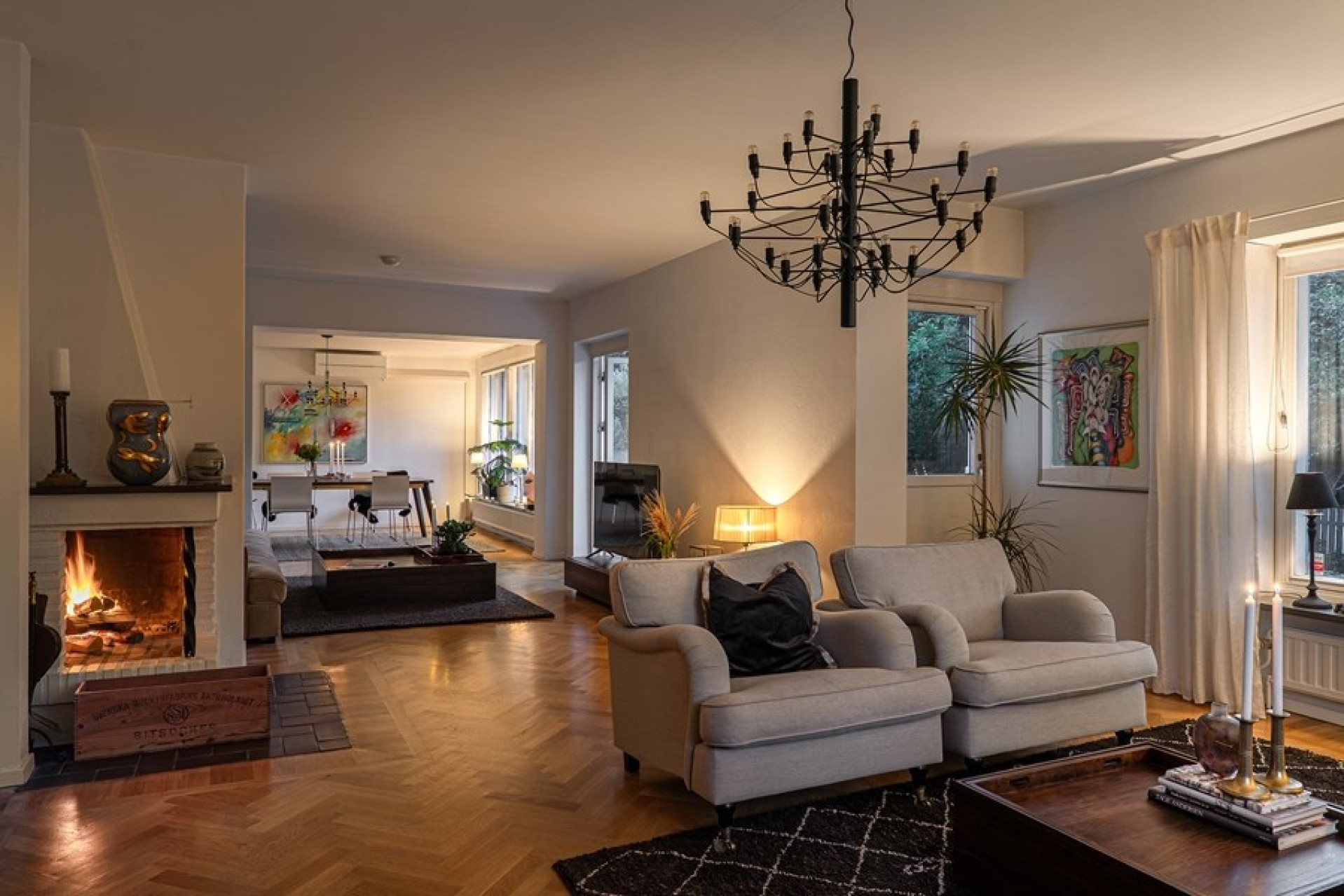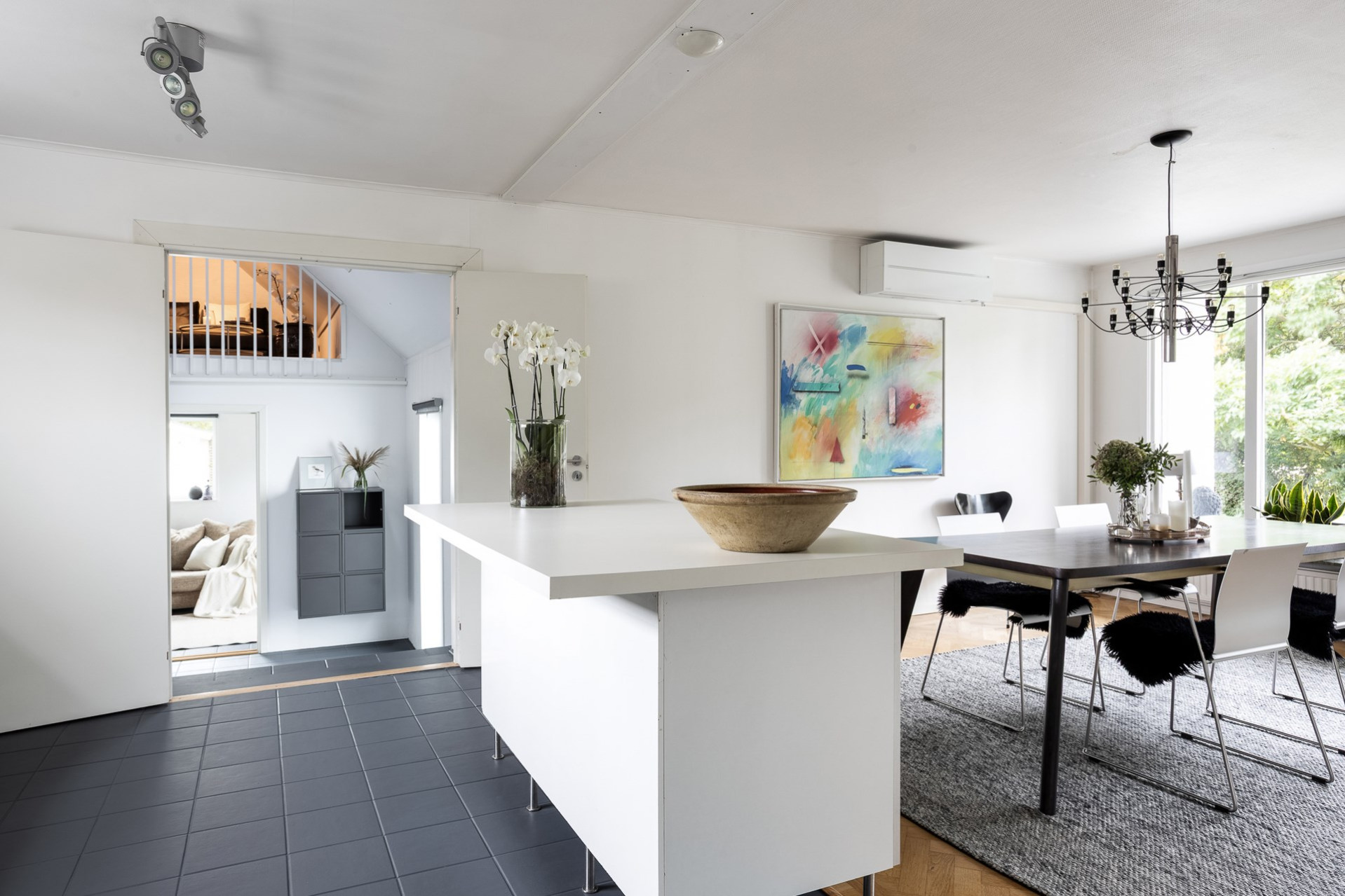 Helt underbara sällskapsytor med fantastiskt ljusinsläpp och vacker fiskbensparkett som flyter genom rummen. Här ges plats till soffgrupp, loungemöblemang samt ett rejält matsalsbord för lätt 12-14 personer. Intill matsalen finns extra förvaring. Man har en fin kontakt med verandan via pardörrar. Braskamin.
