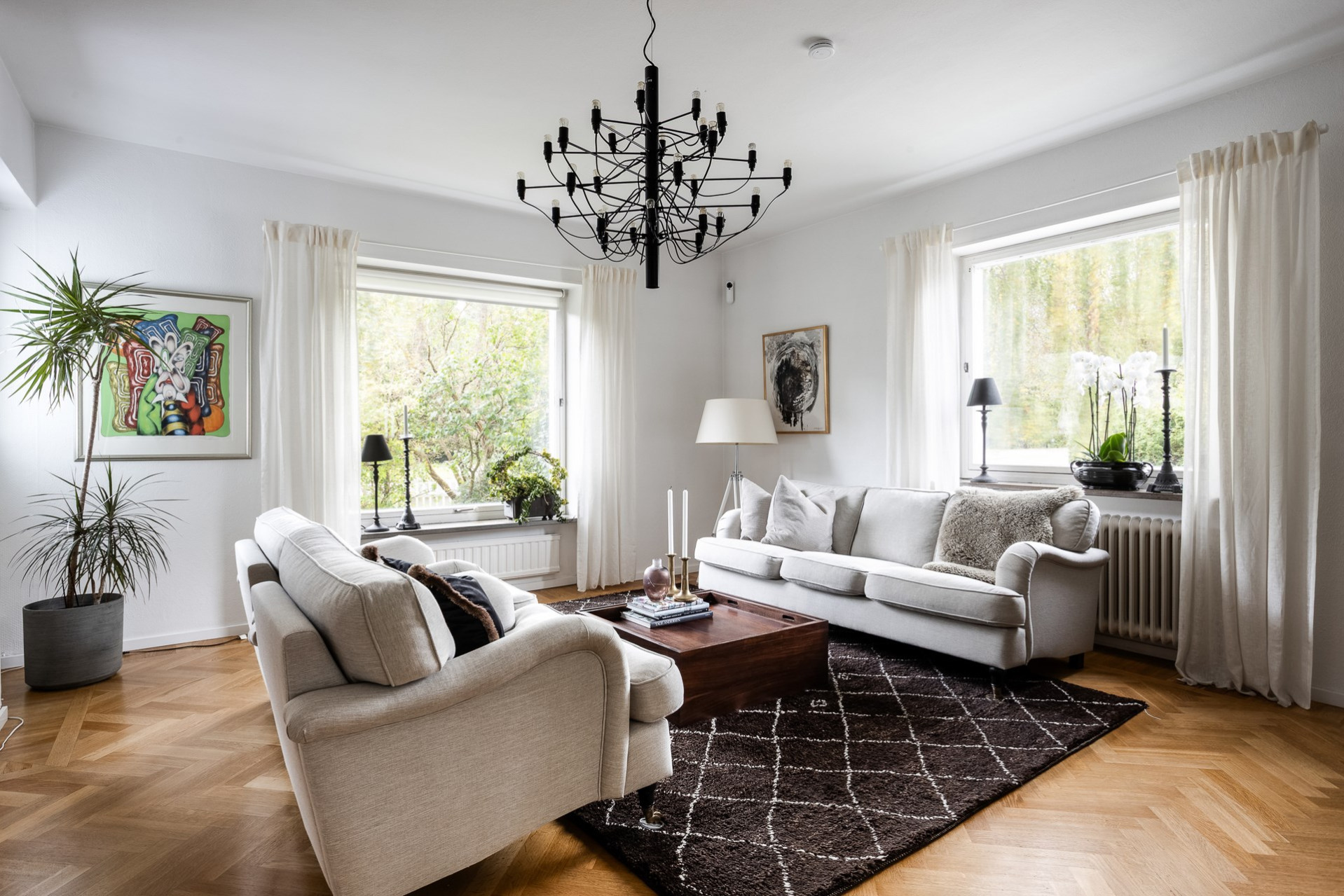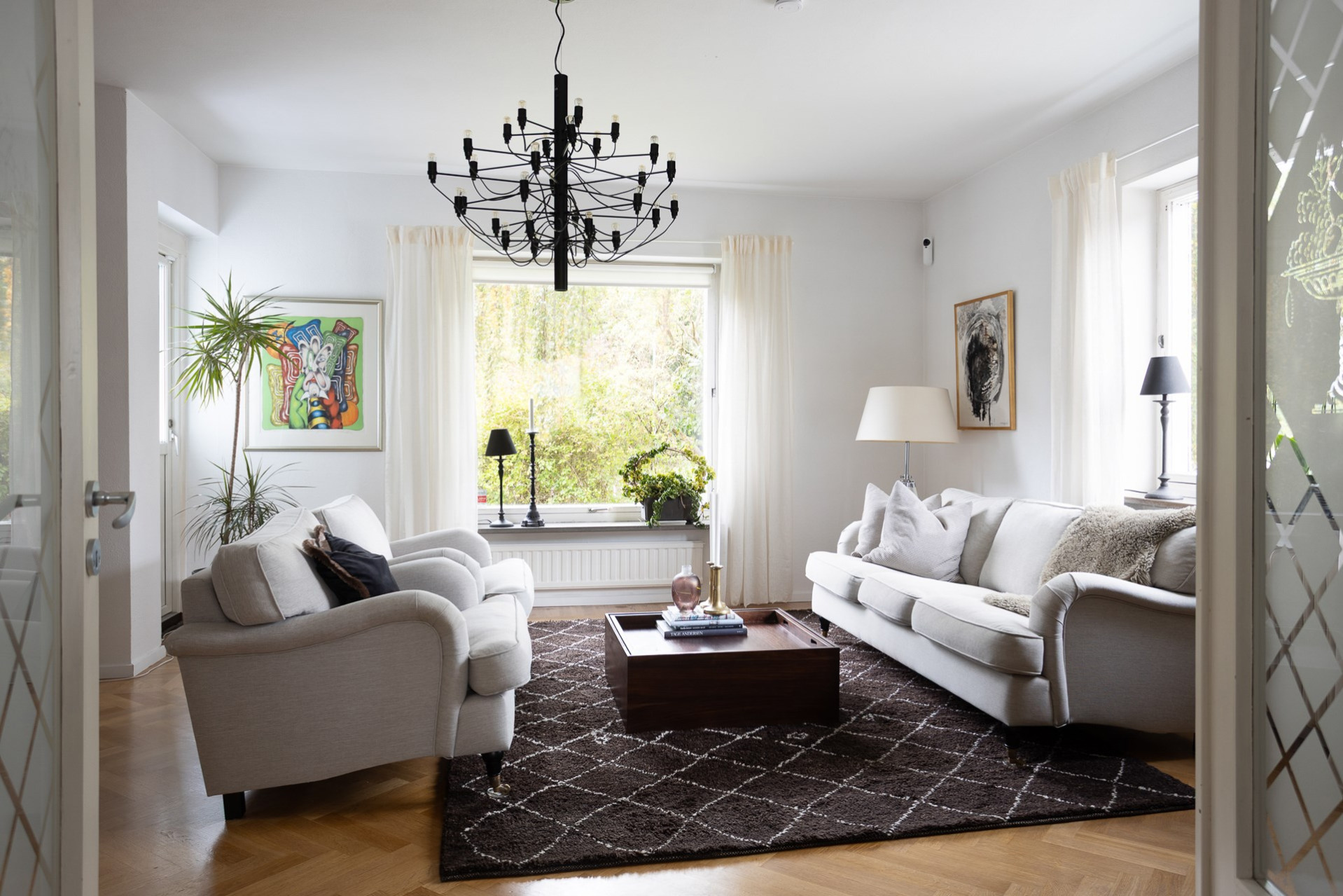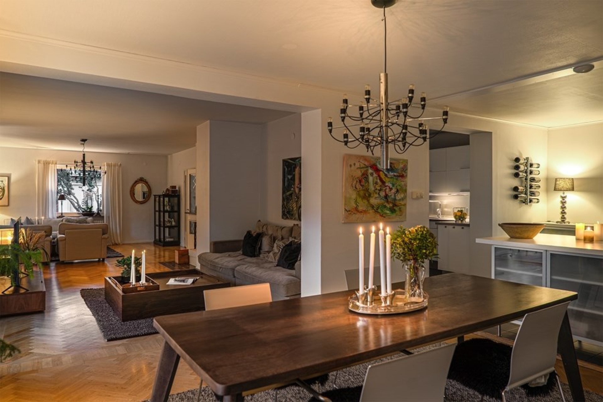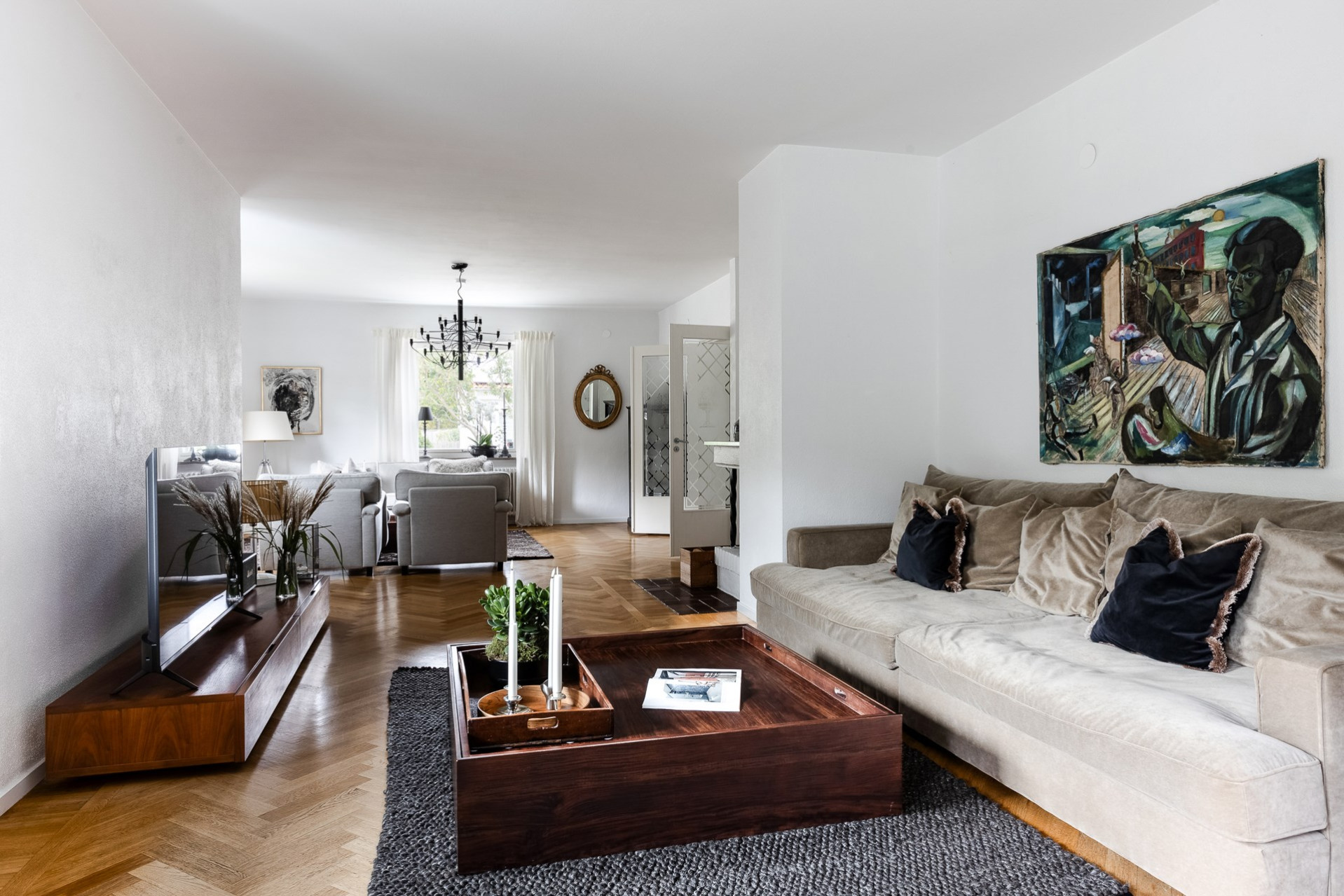 Helt underbara sällskapsytor med fantastiskt ljusinsläpp och vacker fiskbensparkett som flyter genom rummen. Här ges plats till soffgrupp, loungemöblemang samt ett rejält matsalsbord för lätt 12-14 personer. Intill matsalen finns extra förvaring. Man har en fin kontakt med verandan via pardörrar. Braskamin.