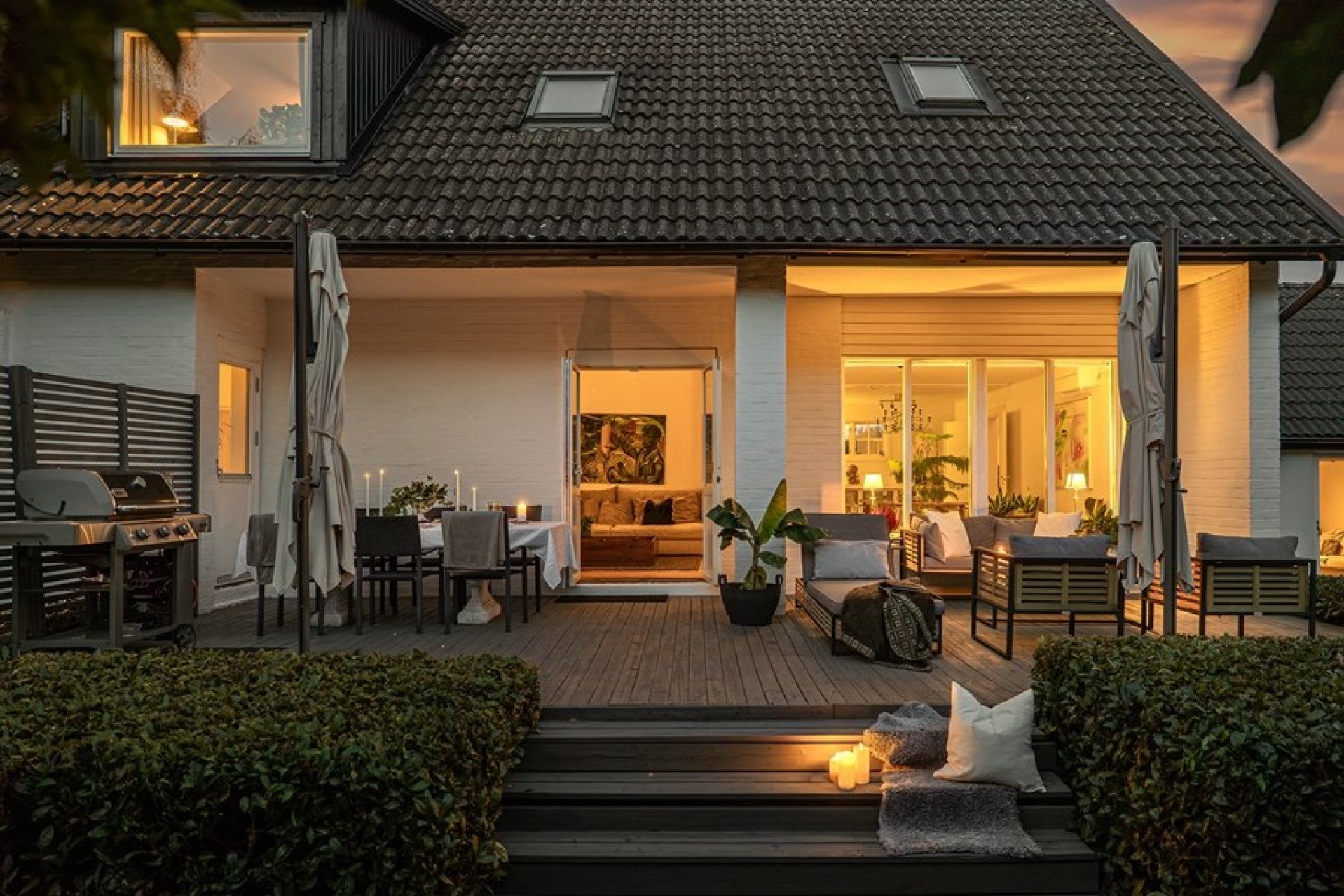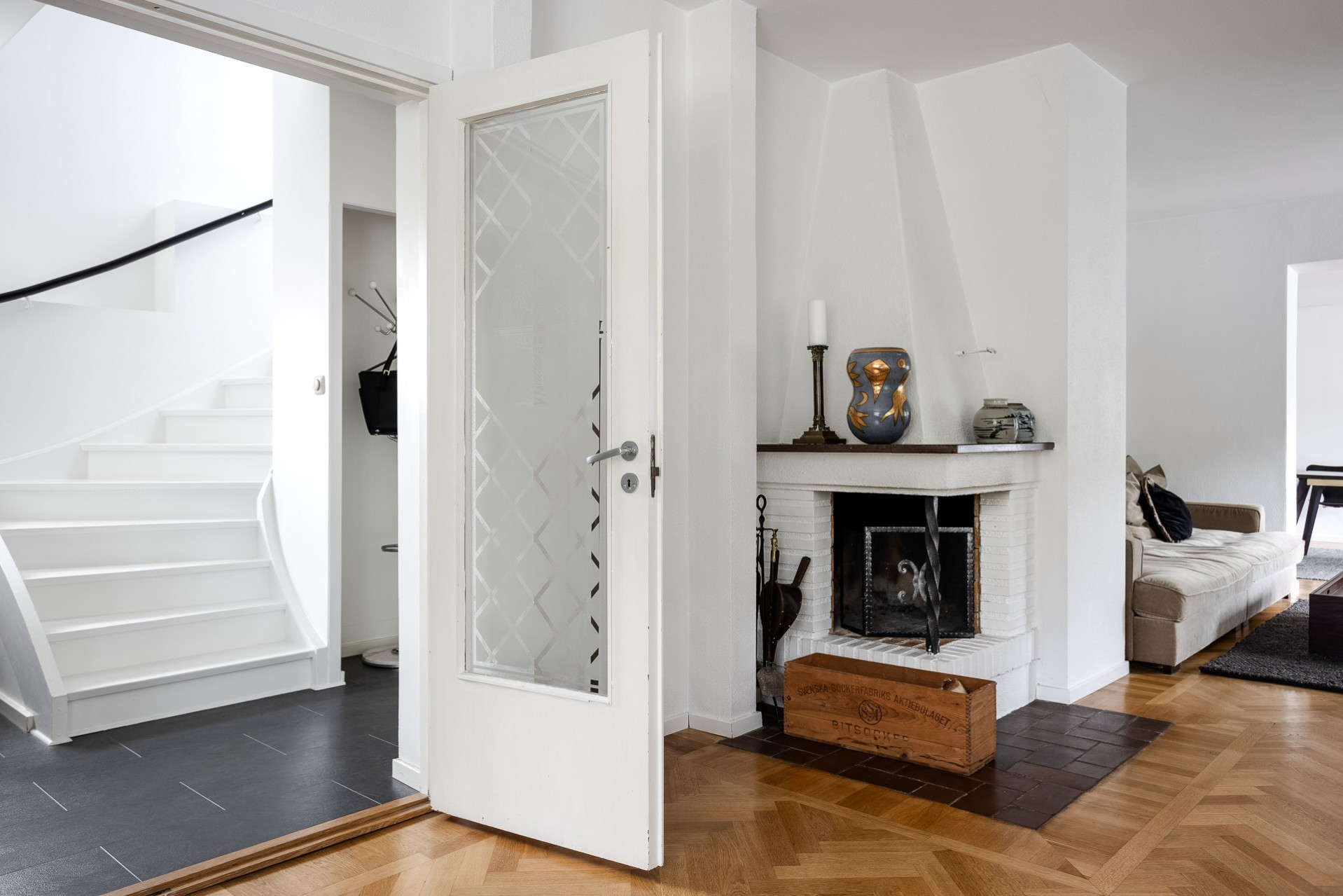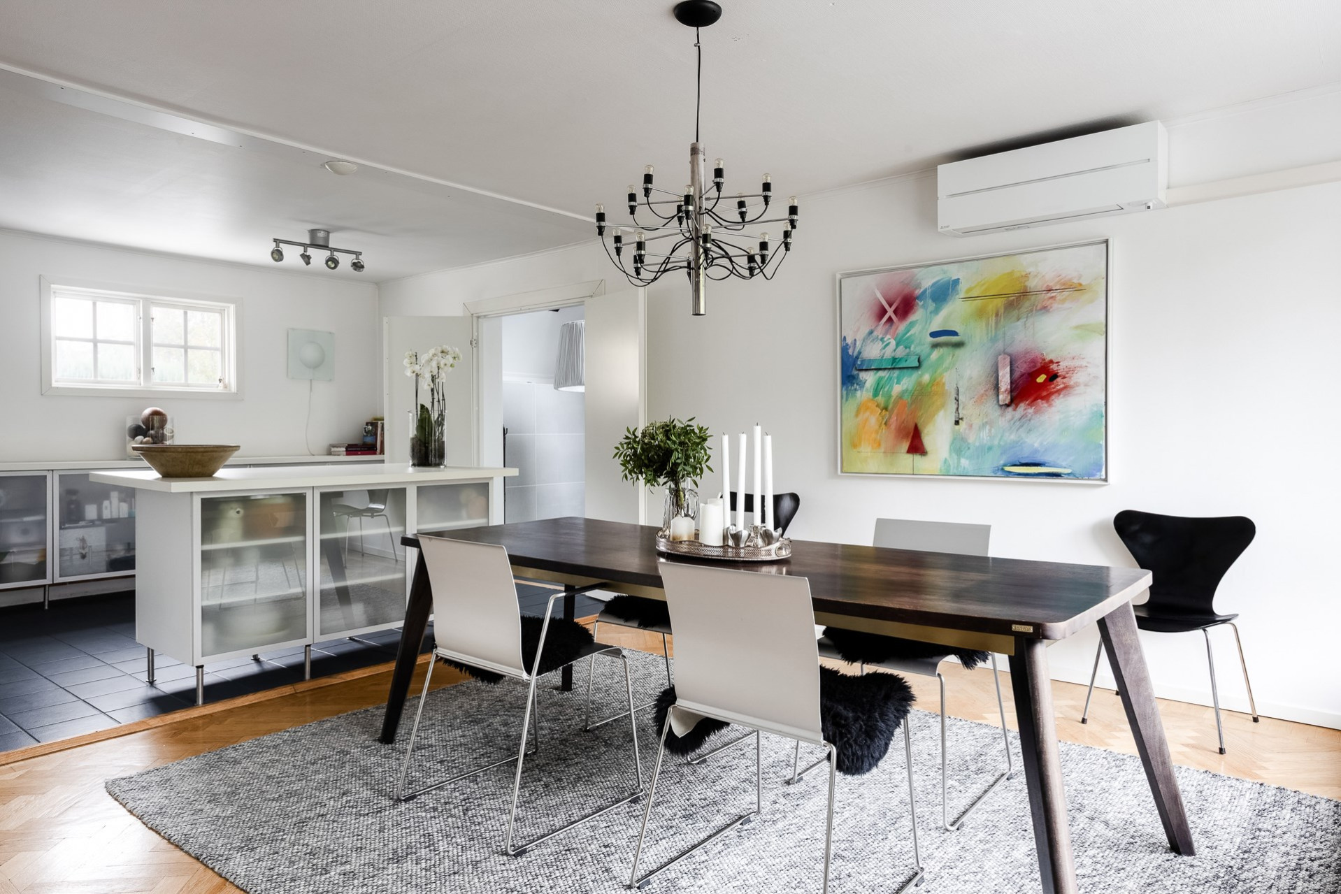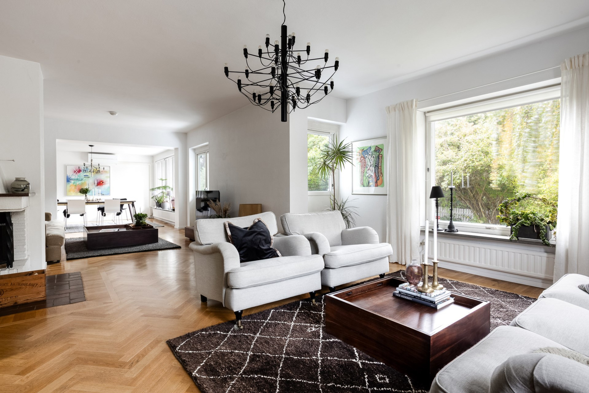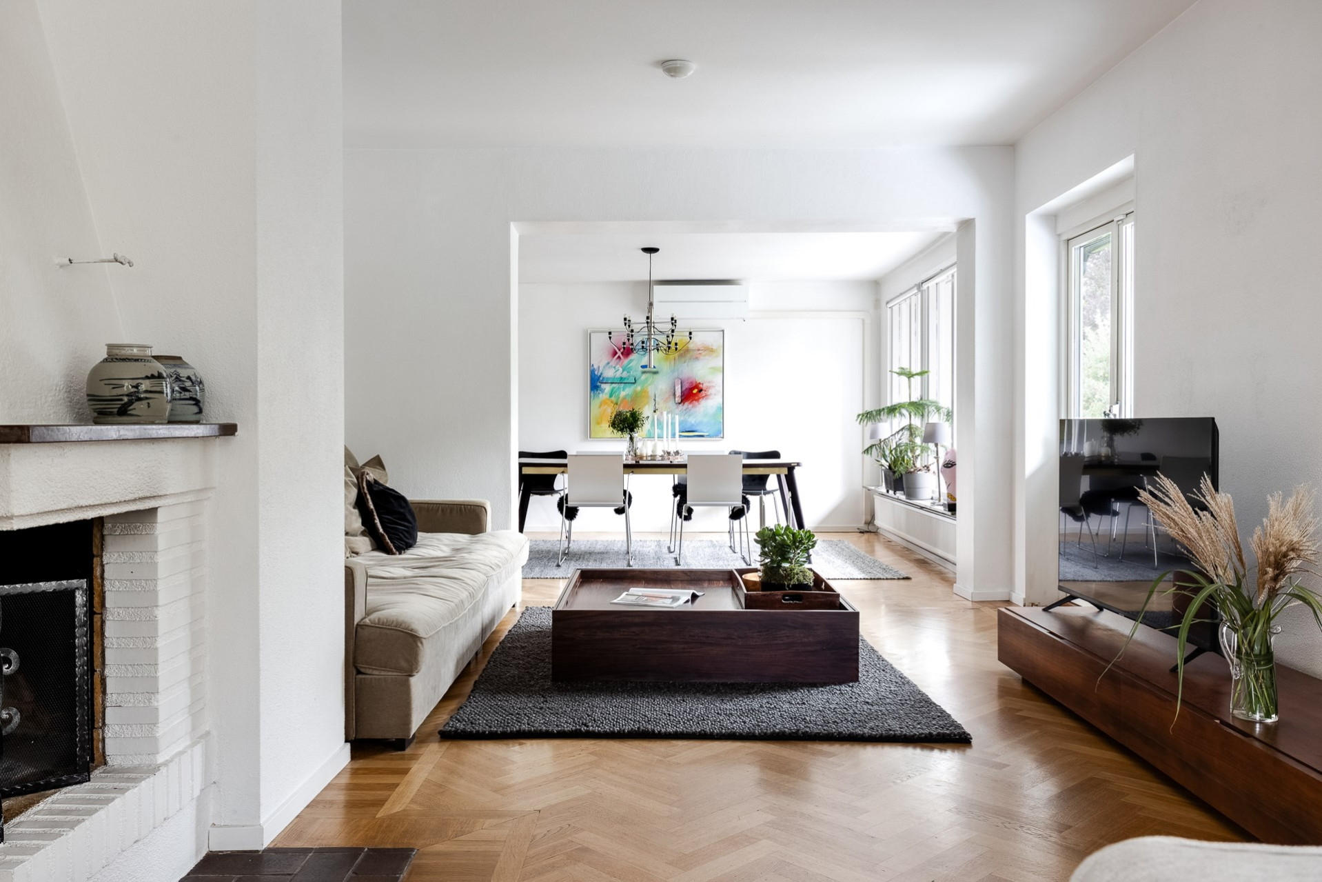 Helt underbara sällskapsytor med fantastiskt ljusinsläpp och vacker fiskbensparkett som flyter genom rummen. Här ges plats till soffgrupp, loungemöblemang samt ett rejält matsalsbord för lätt 12-14 personer. Intill matsalen finns extra förvaring. Man har en fin kontakt med verandan via pardörrar. Braskamin.