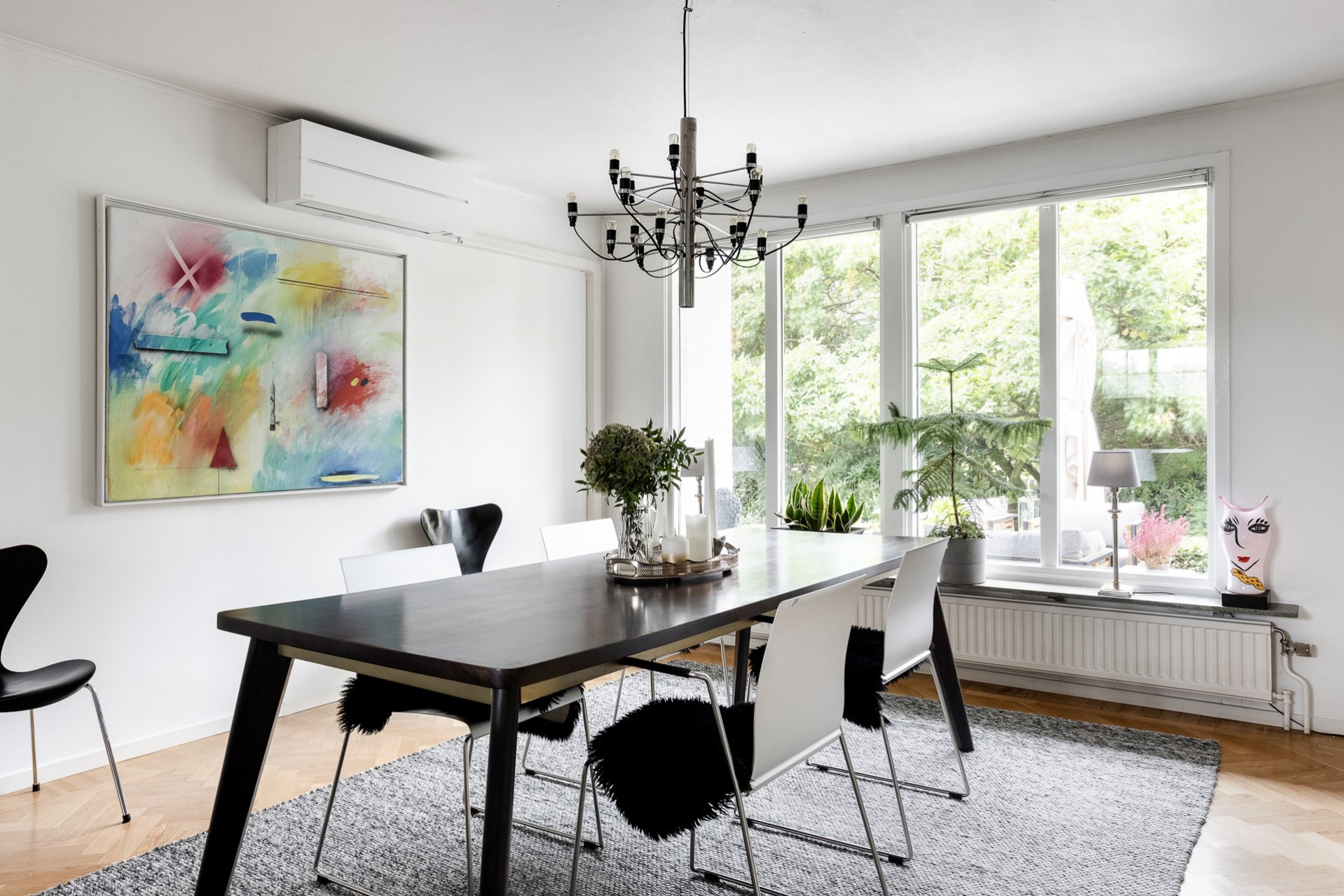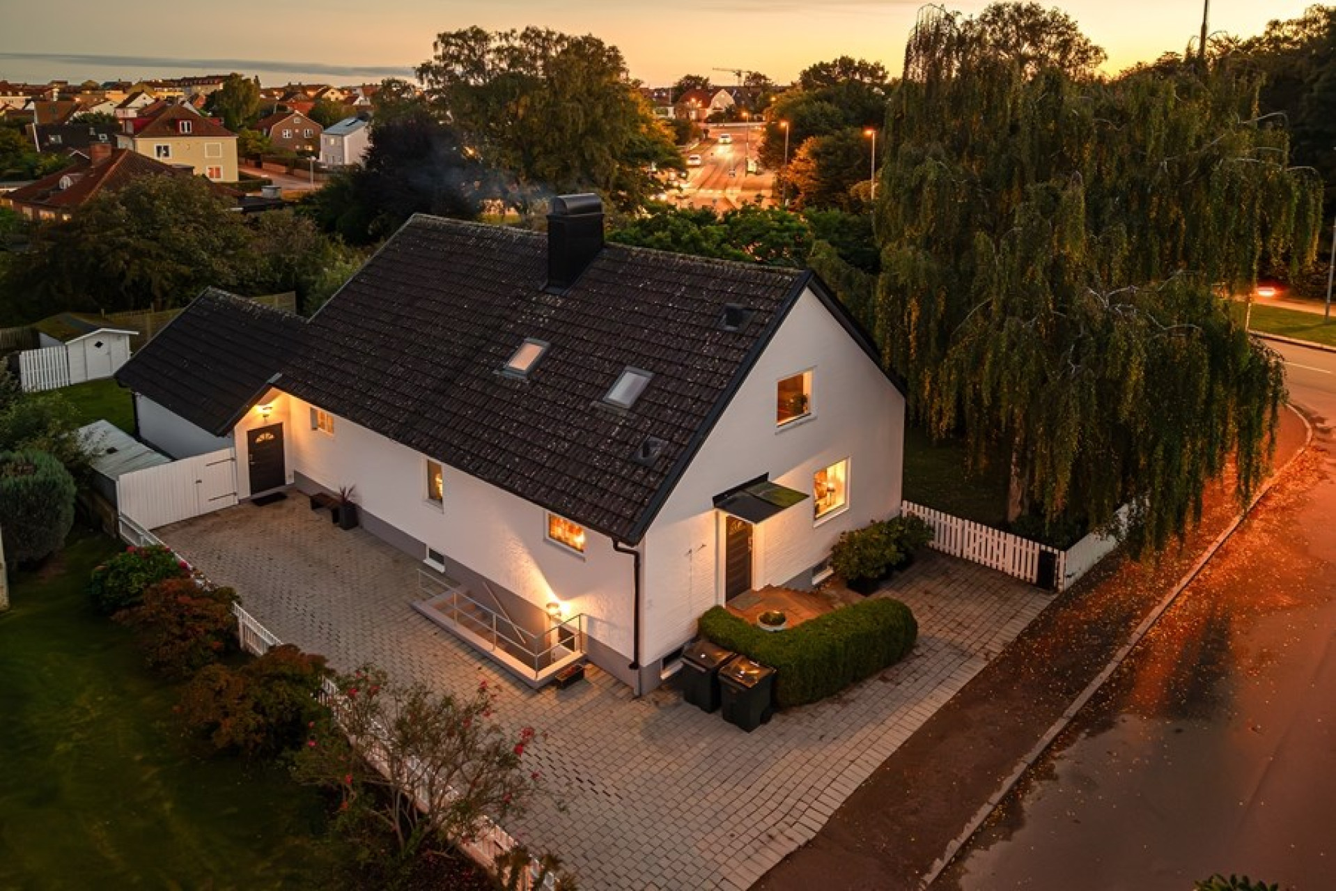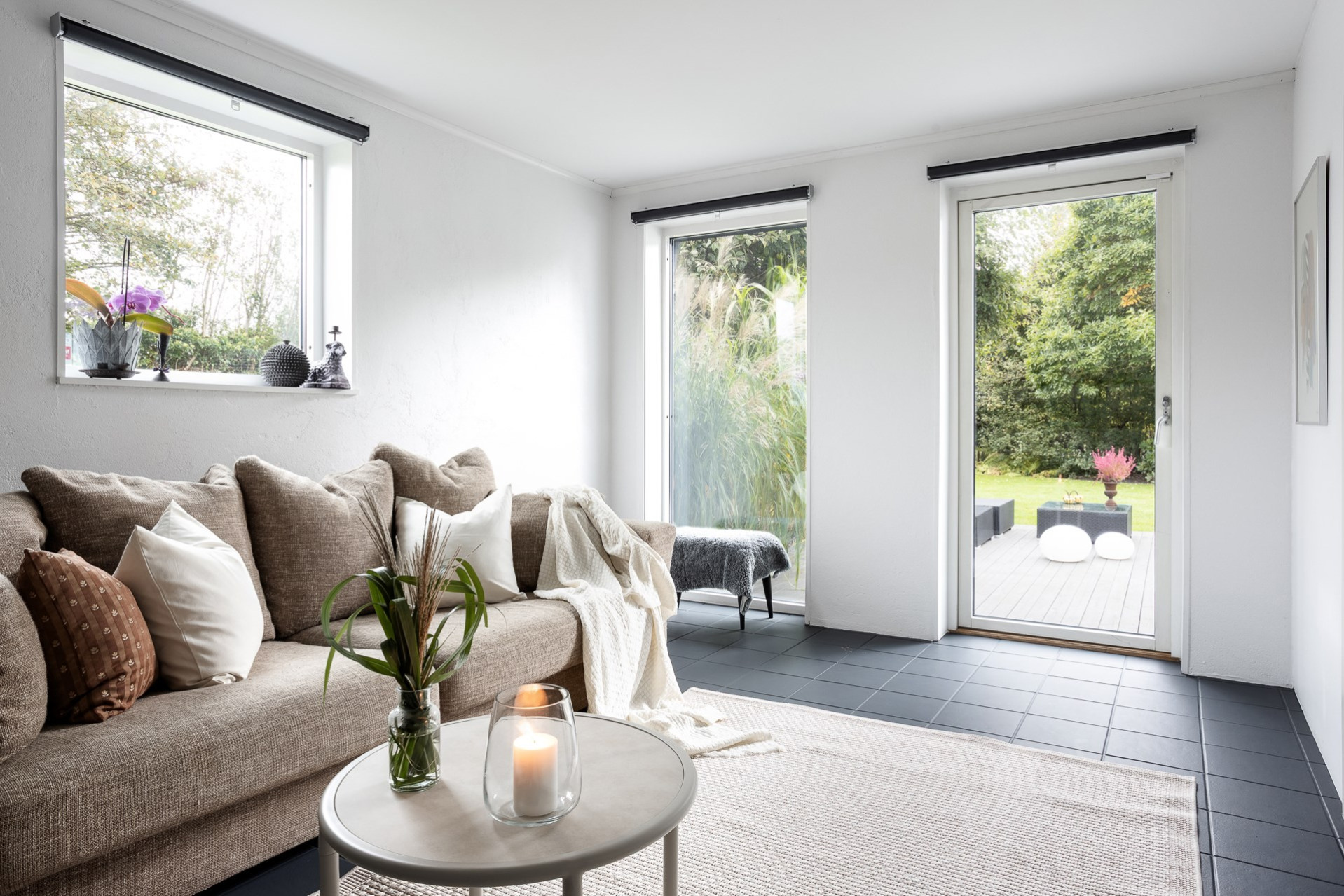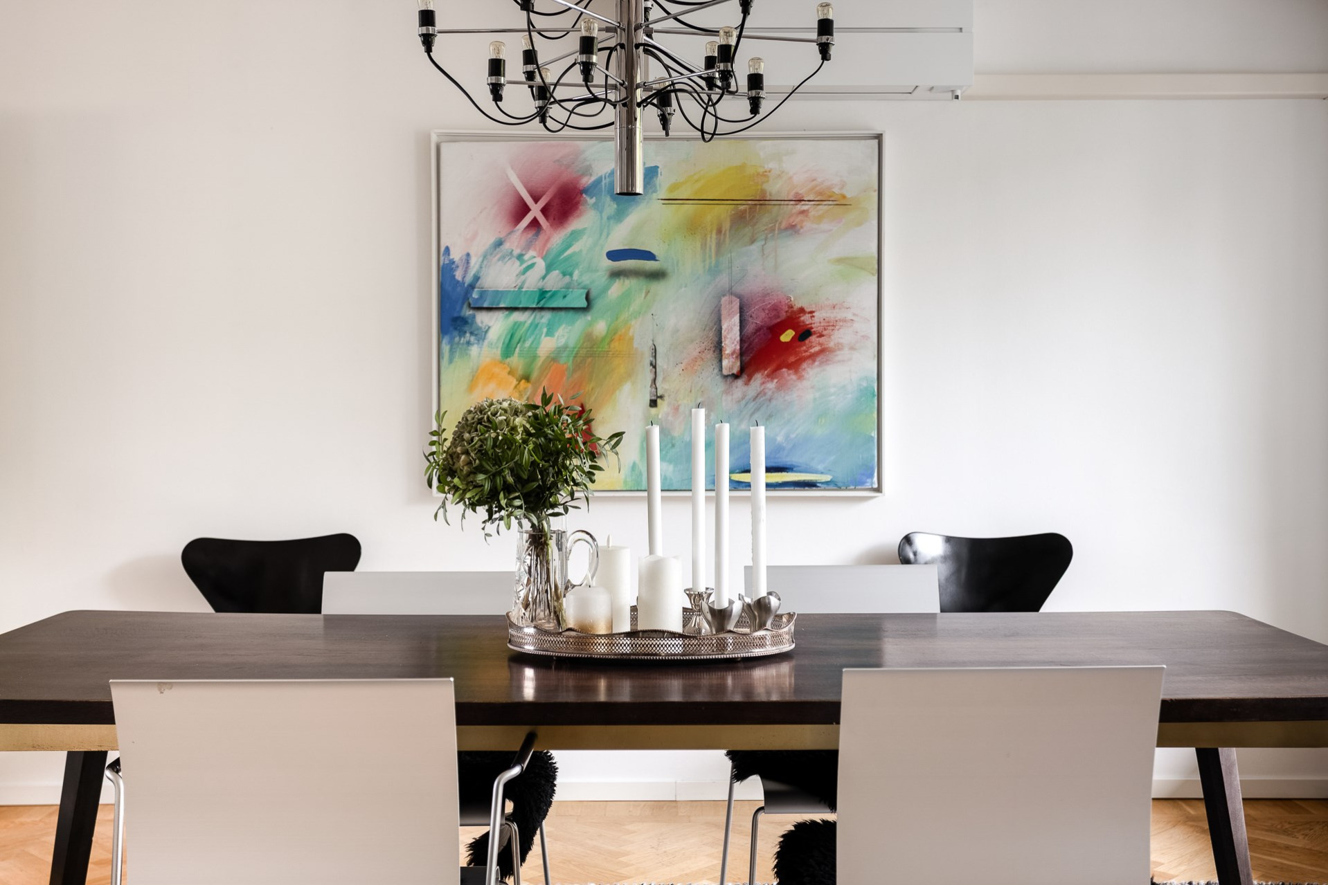 Helt underbara sällskapsytor med fantastiskt ljusinsläpp och vacker fiskbensparkett som flyter genom rummen. Här ges plats till soffgrupp, loungemöblemang samt ett rejält matsalsbord för lätt 12-14 personer. Intill matsalen finns extra förvaring. Man har en fin kontakt med verandan via pardörrar. Braskamin.