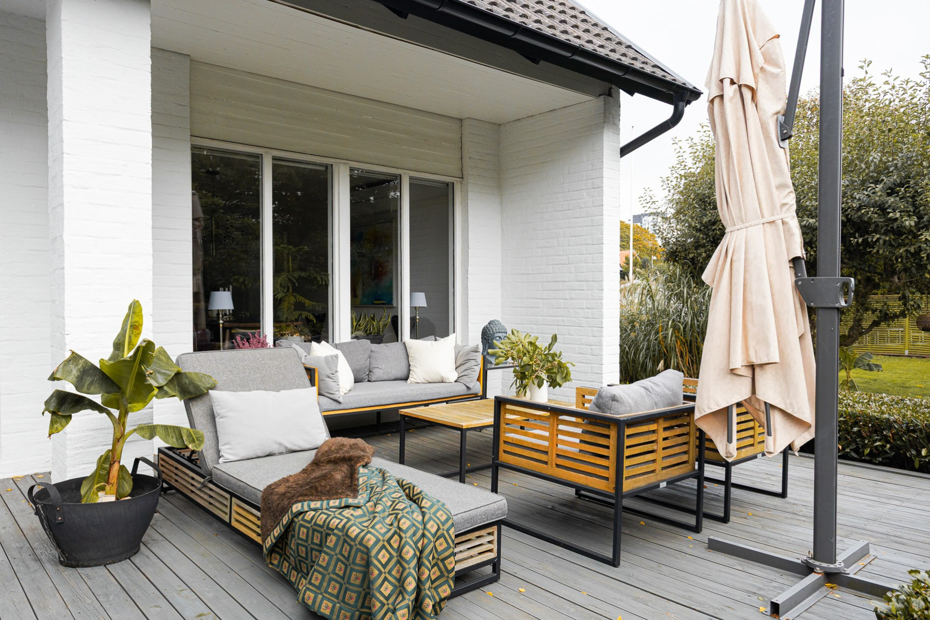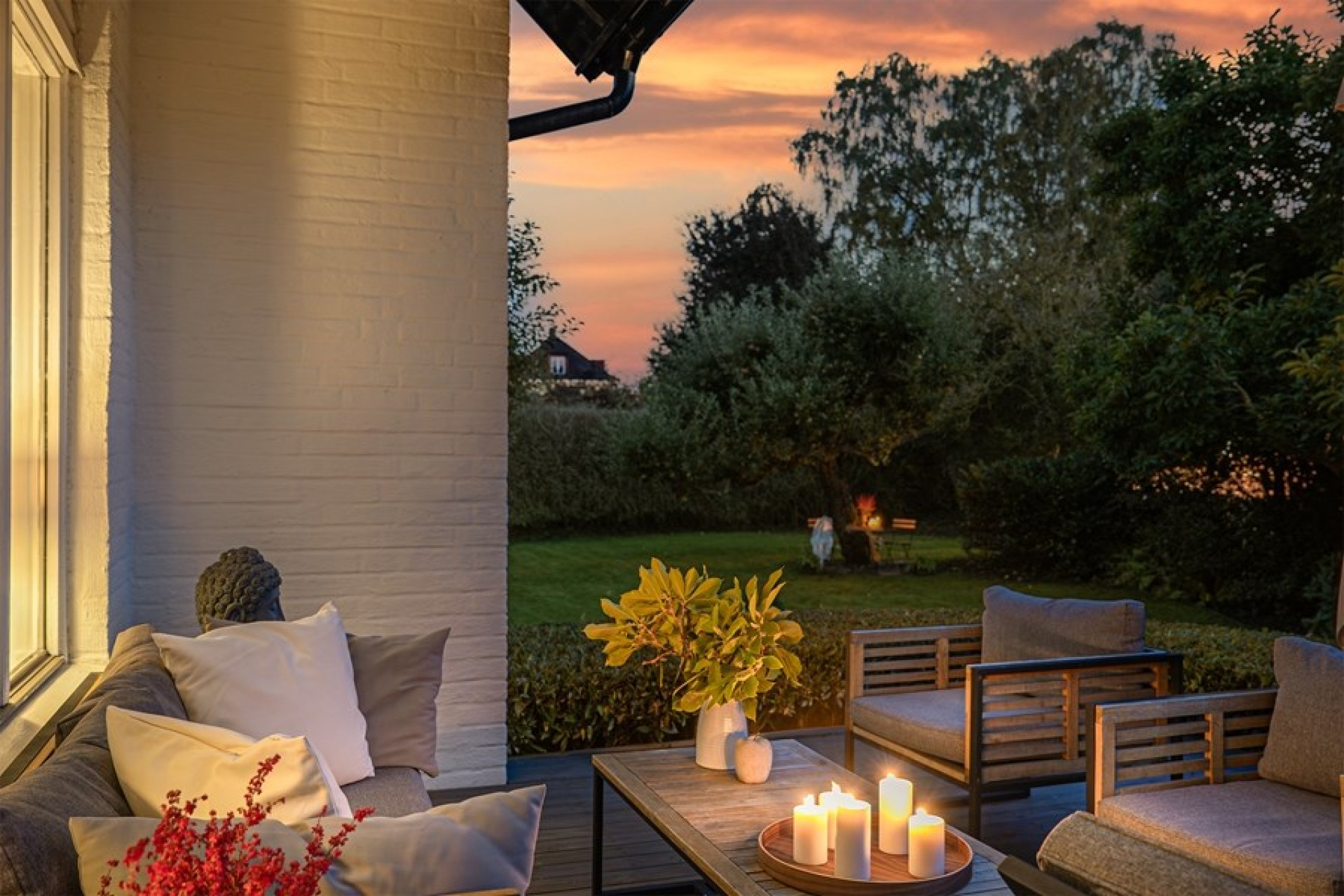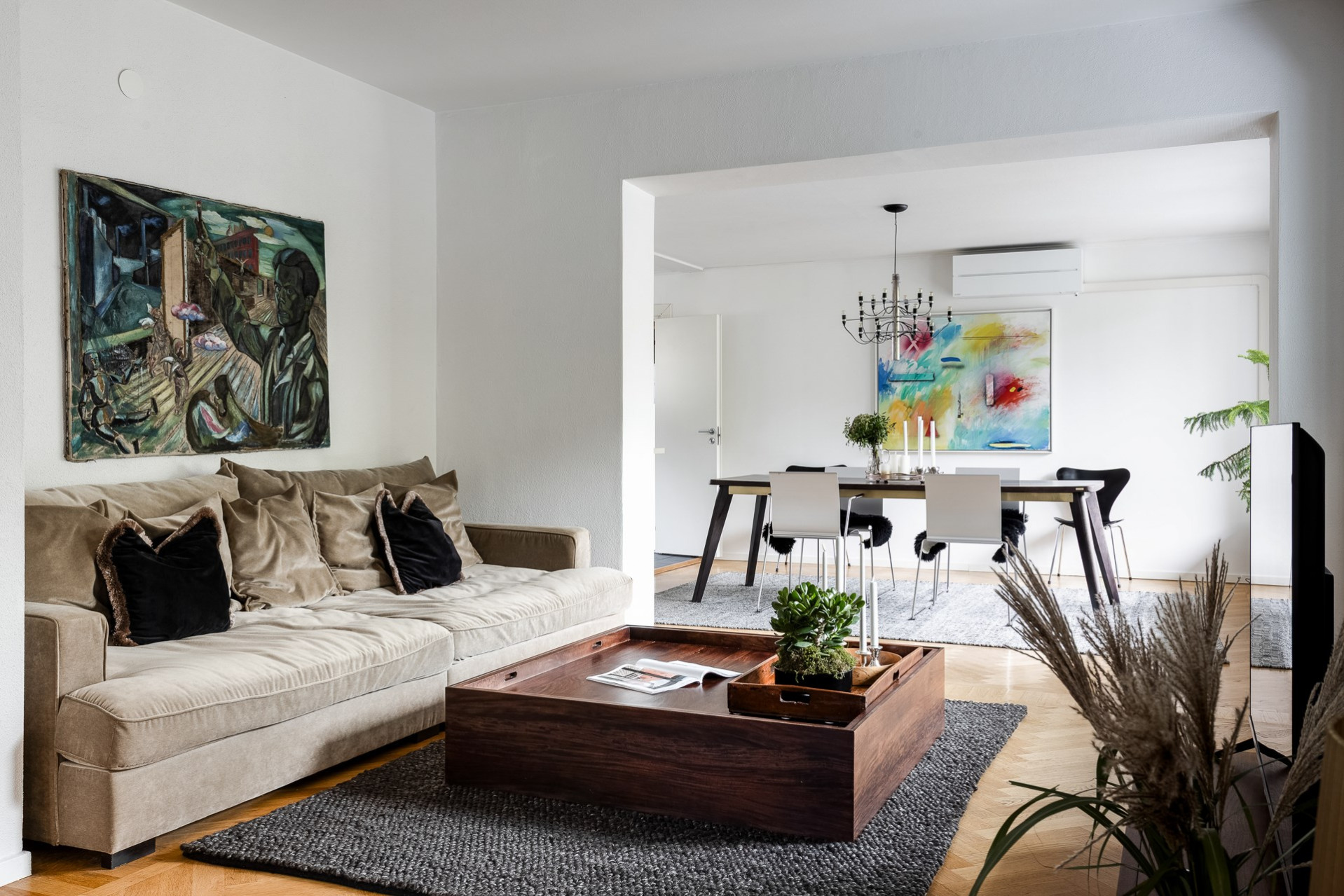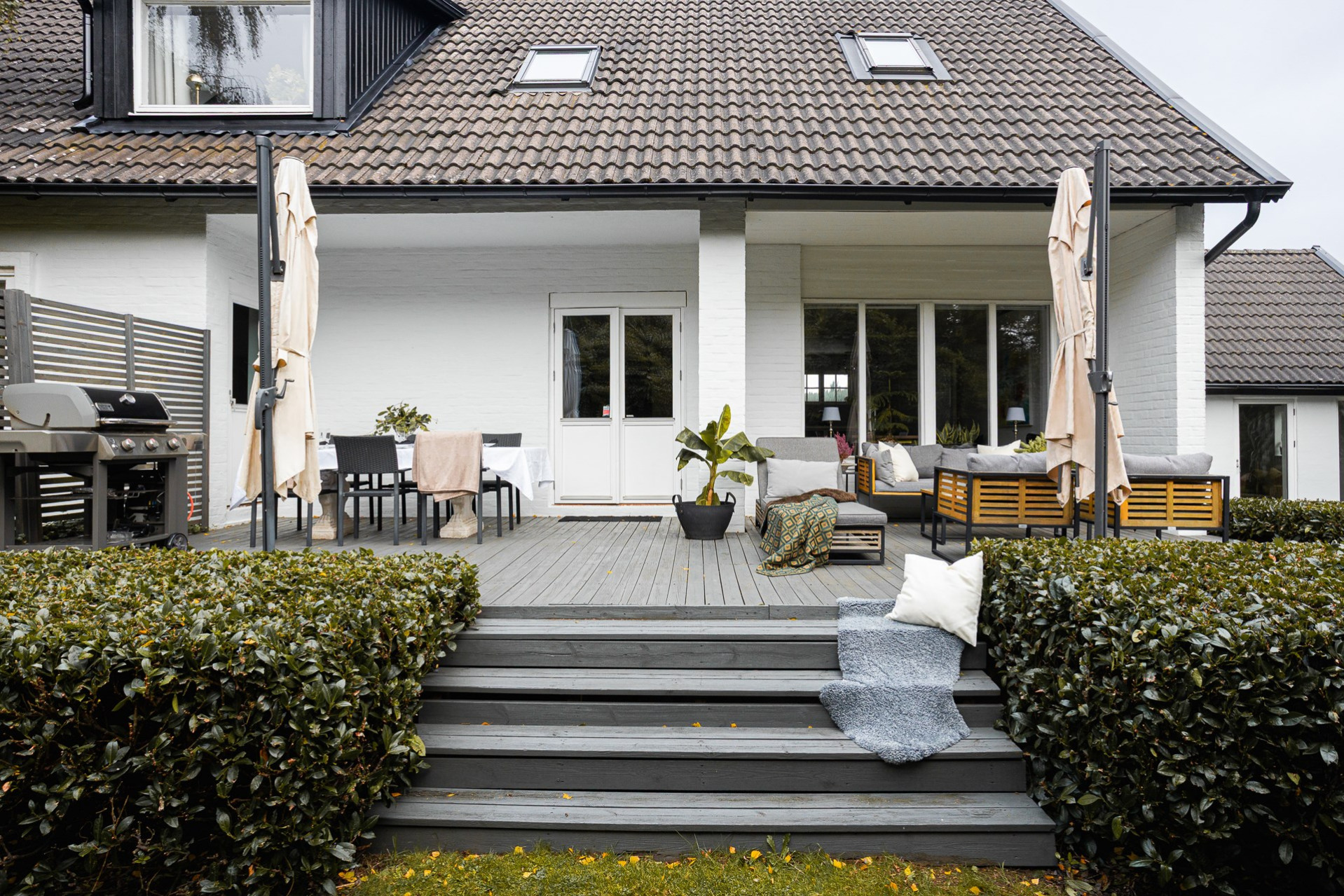 Helt underbara sällskapsytor med fantastiskt ljusinsläpp och vacker fiskbensparkett som flyter genom rummen. Här ges plats till soffgrupp, loungemöblemang samt ett rejält matsalsbord för lätt 12-14 personer. Intill matsalen finns extra förvaring. Man har en fin kontakt med verandan via pardörrar. Braskamin.