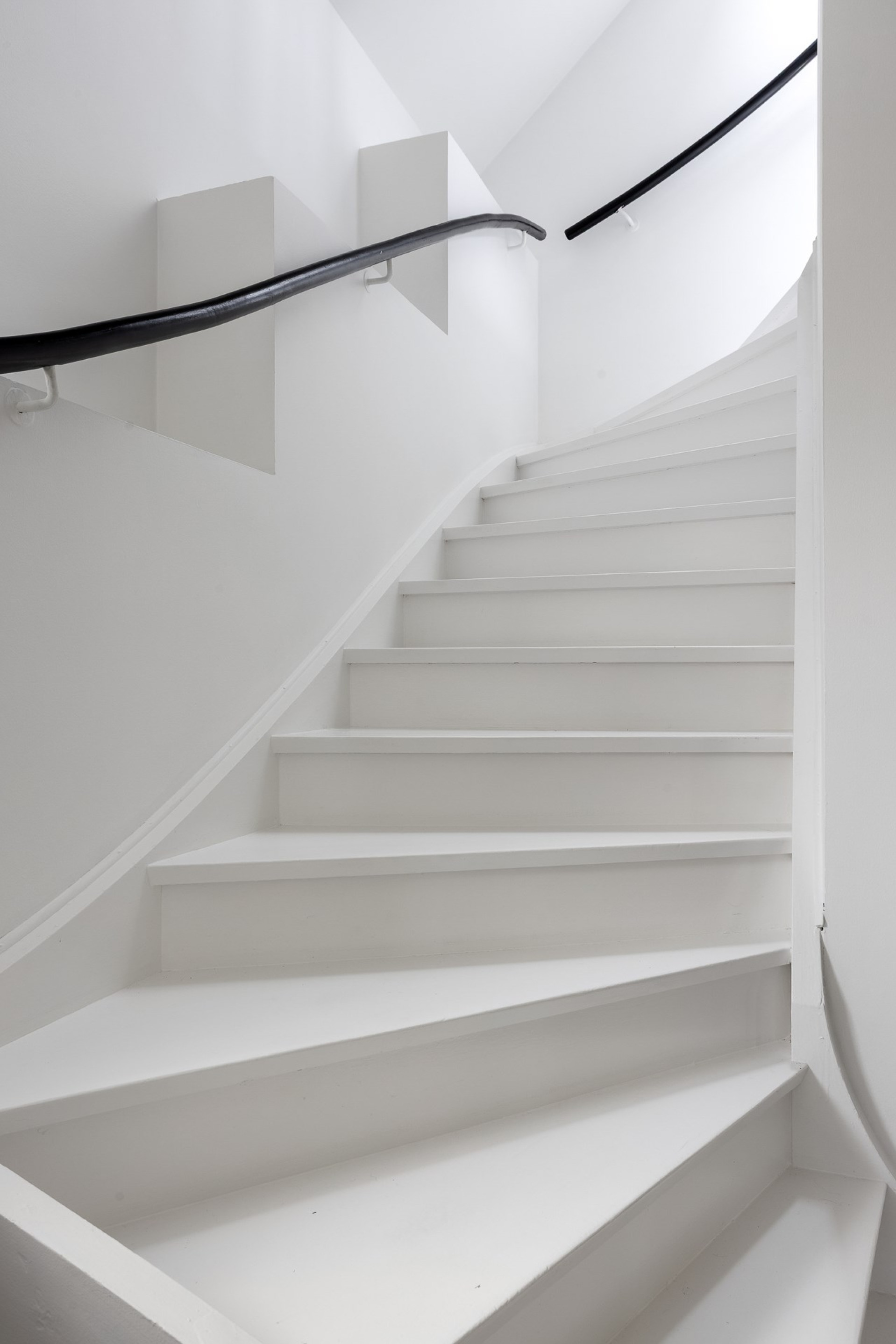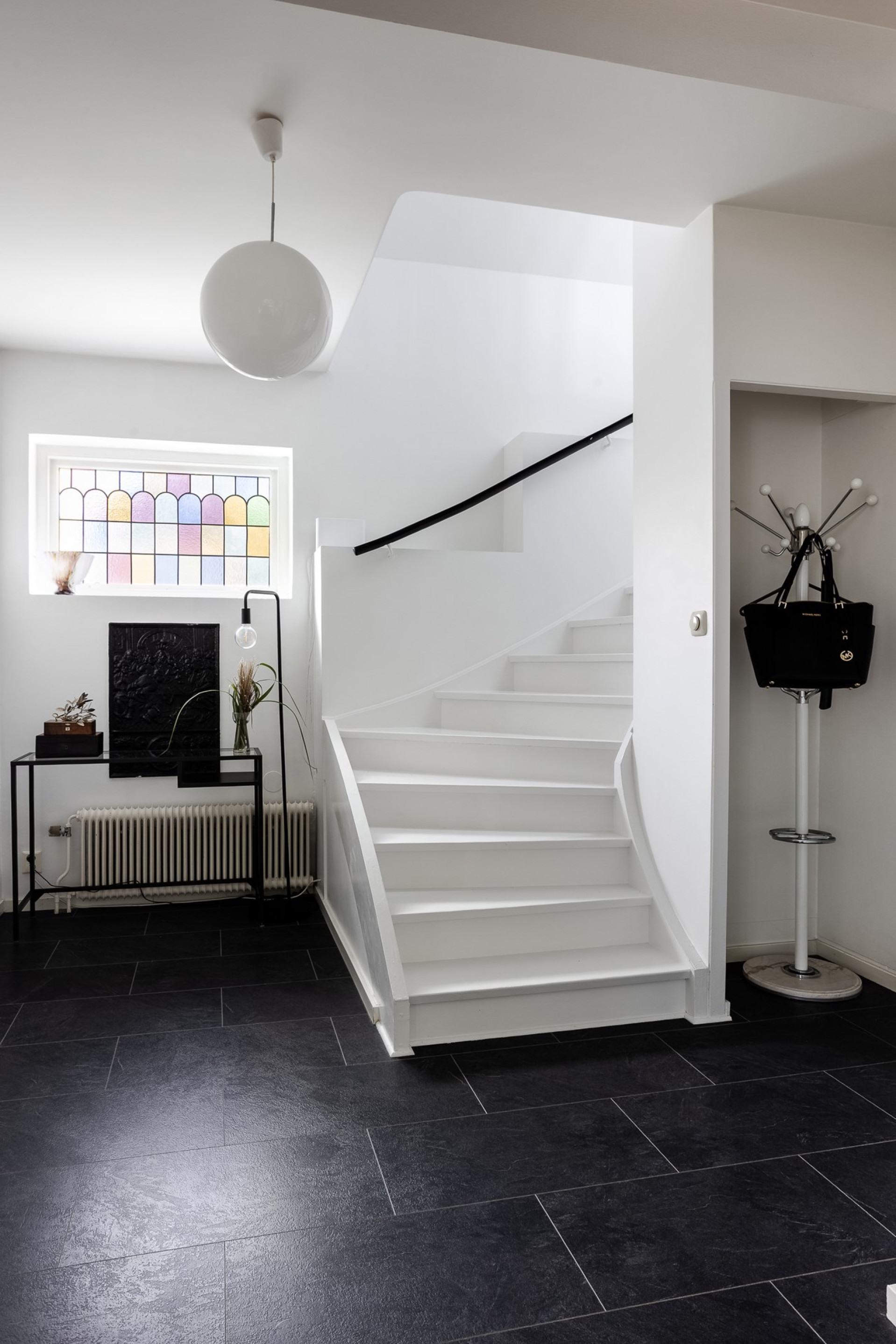 Via en snygg trappa nås ovanvåningens hall. Här finns väldigt gott om förvaring.