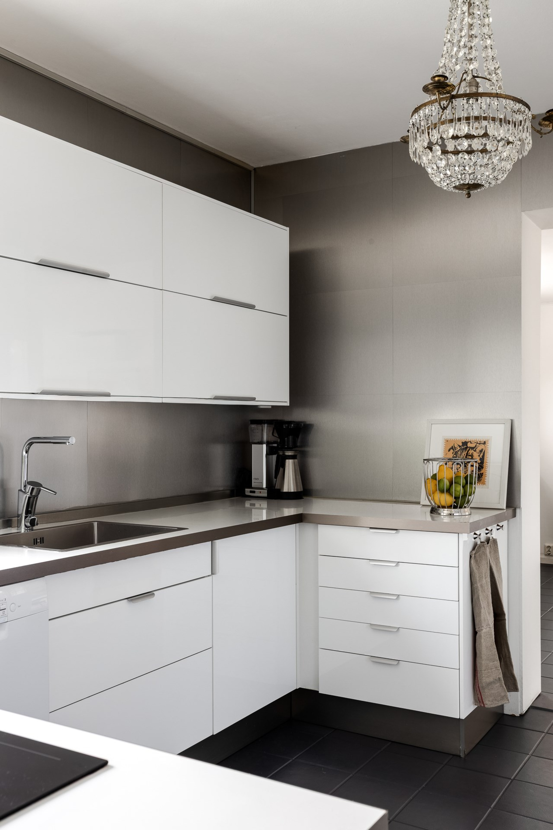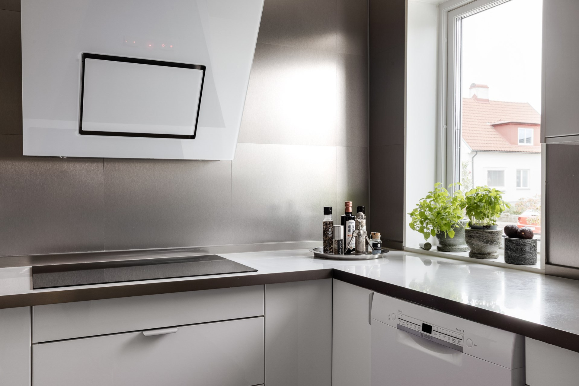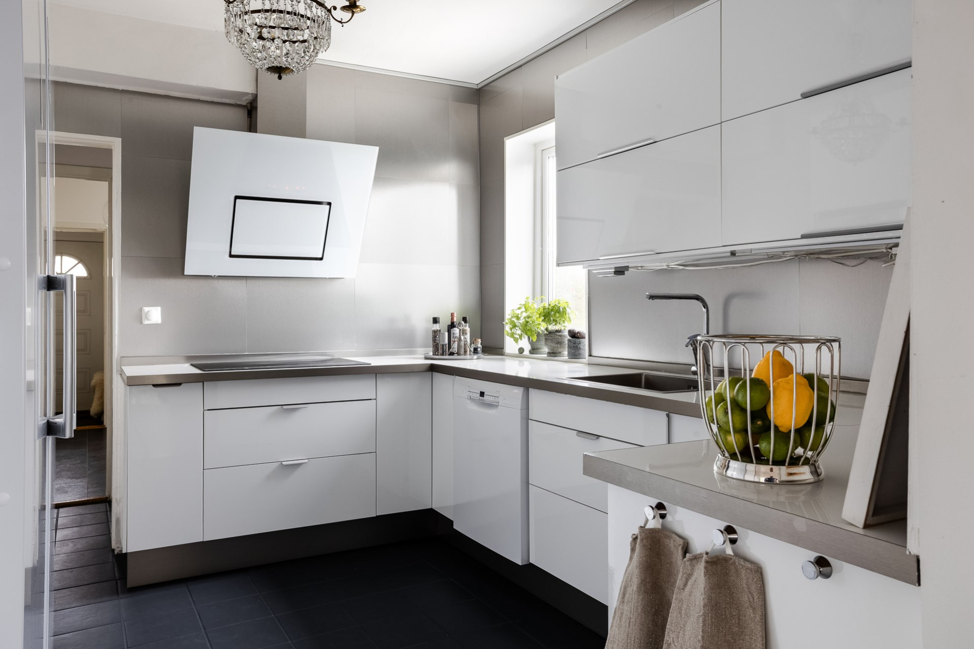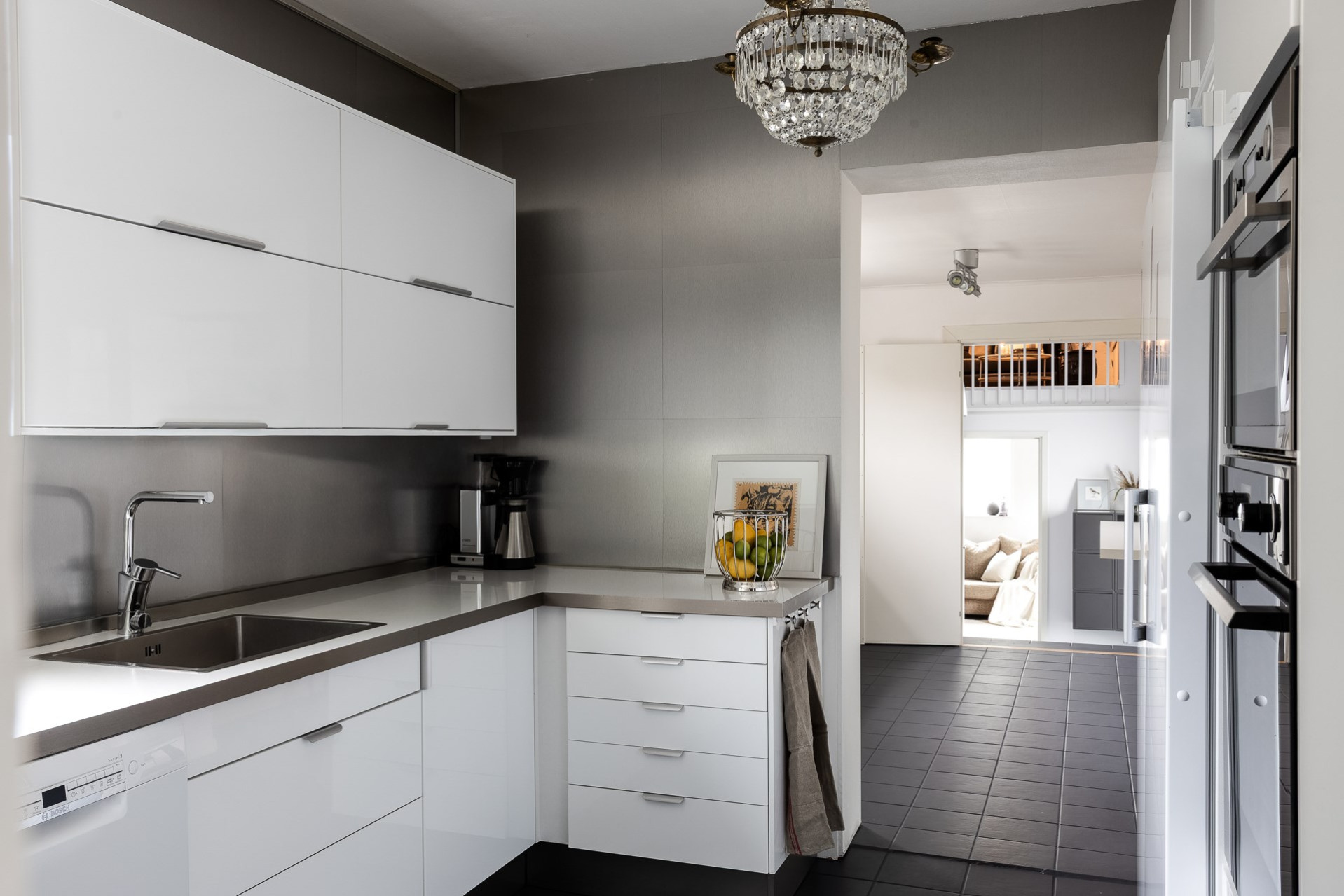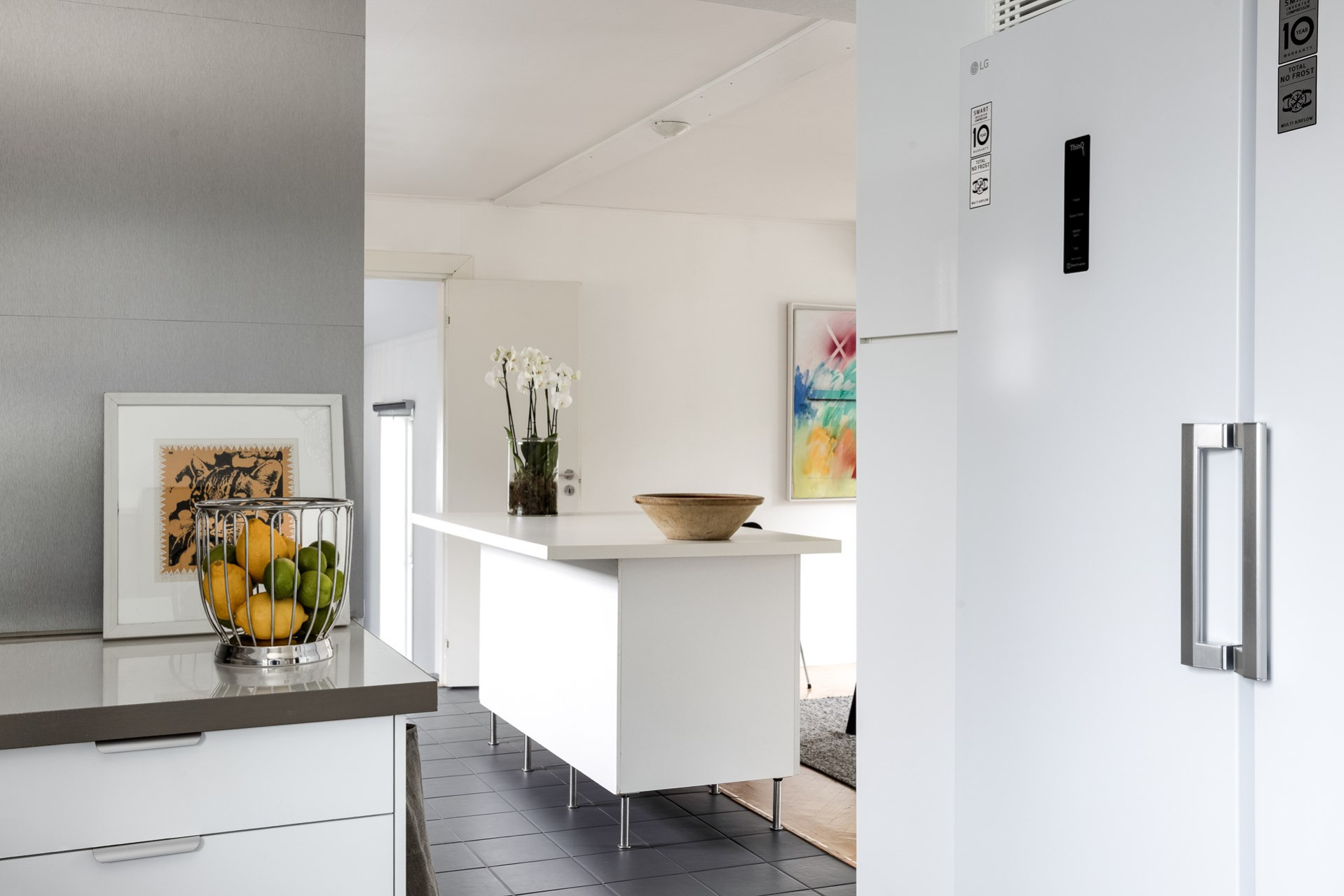 Renoverades 2016 med vita skåpsluckor, ljus bänkskiva och rostfritt stänkskydd. Ett arbetskök, perfekt när gästerna sitter i matsalen så slipper dom se all disk med mera. Hel kyl och frys, diskmaskin, ugn, häll, fläkt och micro. Klinkergolv.