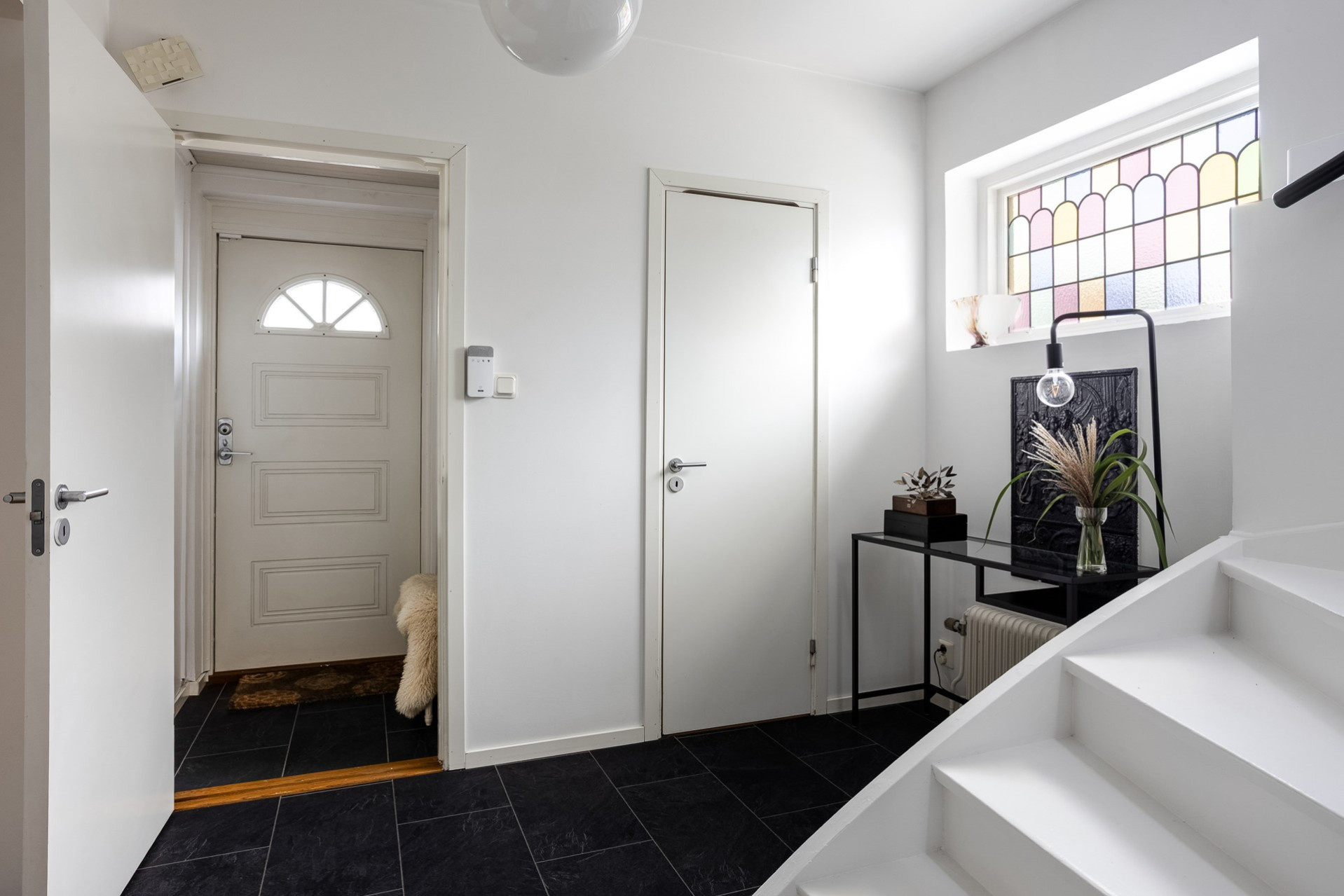 Några trappsteg upp nås den markerade entrén och man kliver in i en hall med grått klinkergolv och plats för avhängning. Nuvarande ägare använder denna entrén till gäster. Blyinfattat fönster.